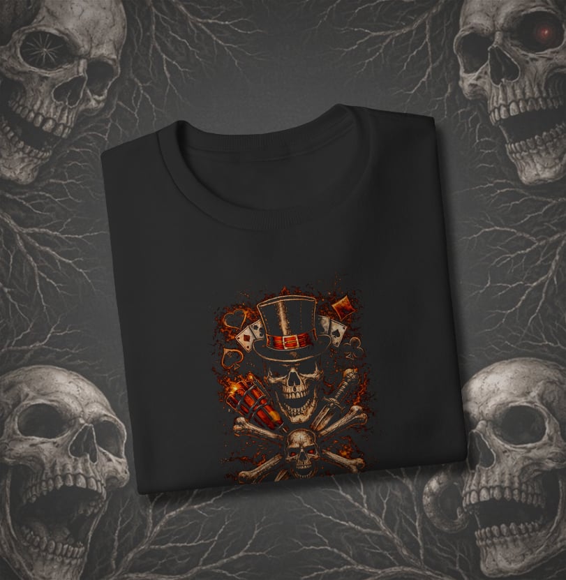 A estampa traz uma caveira de cartola imponente, cercada por ossos cruzados formando o símbolo de danger, dinamites prontas para explodir e os símbolos do baralho flutuando na composição. Tudo envolto por uma atmosfera densa de dark art, pesada, sombria e cheia de tensão visual.