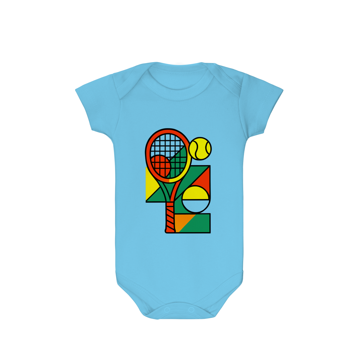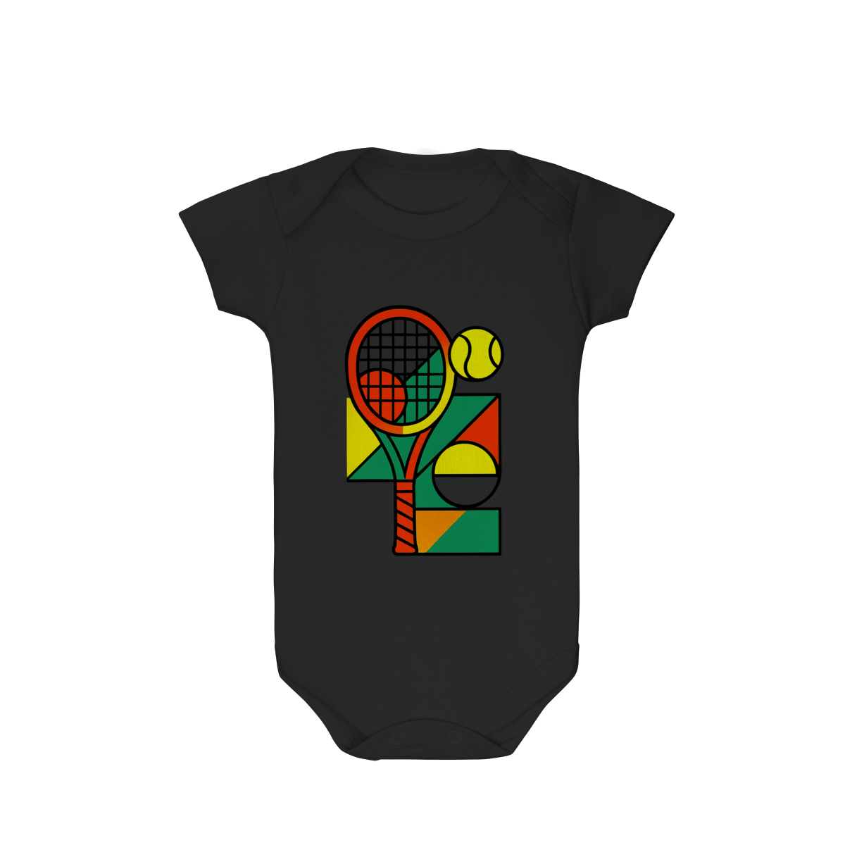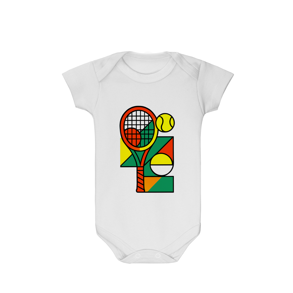 A estampa exclusiva em anexo traz um design vibrante com uma raquete de tênis em tons laranja e vermelho, uma bola amarela e formas geométricas coloridas em verde, amarelo e laranja, que remetem à dinâmica e à diversão do esporte. Essa composição cria uma peça cheia de vida e perfeita para bebês de pais apaixonados por tênis.