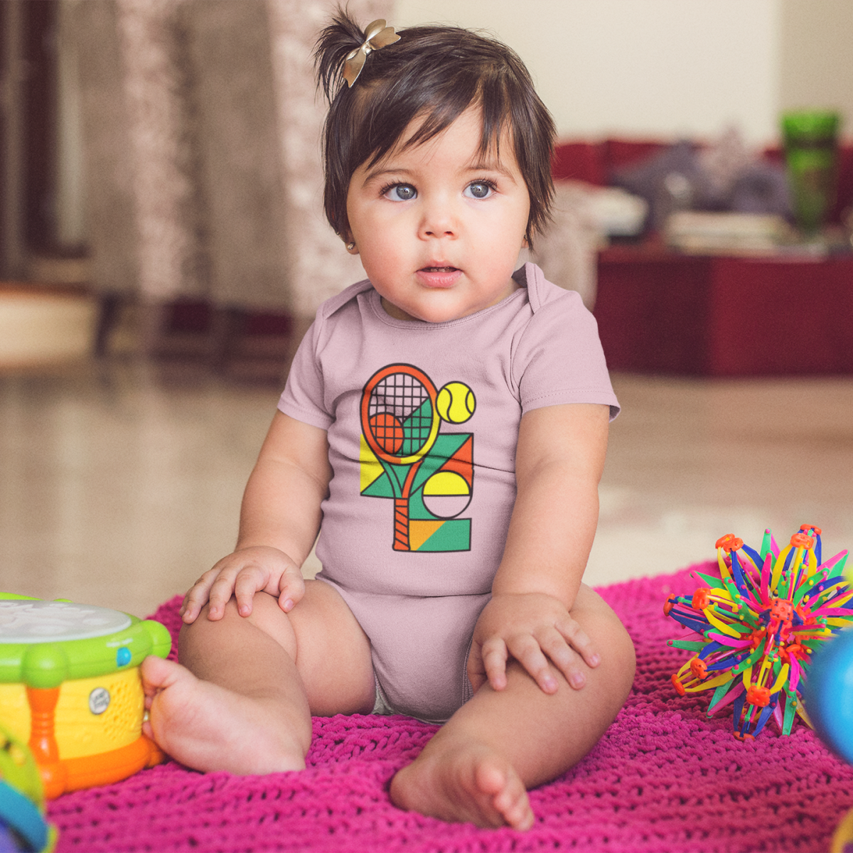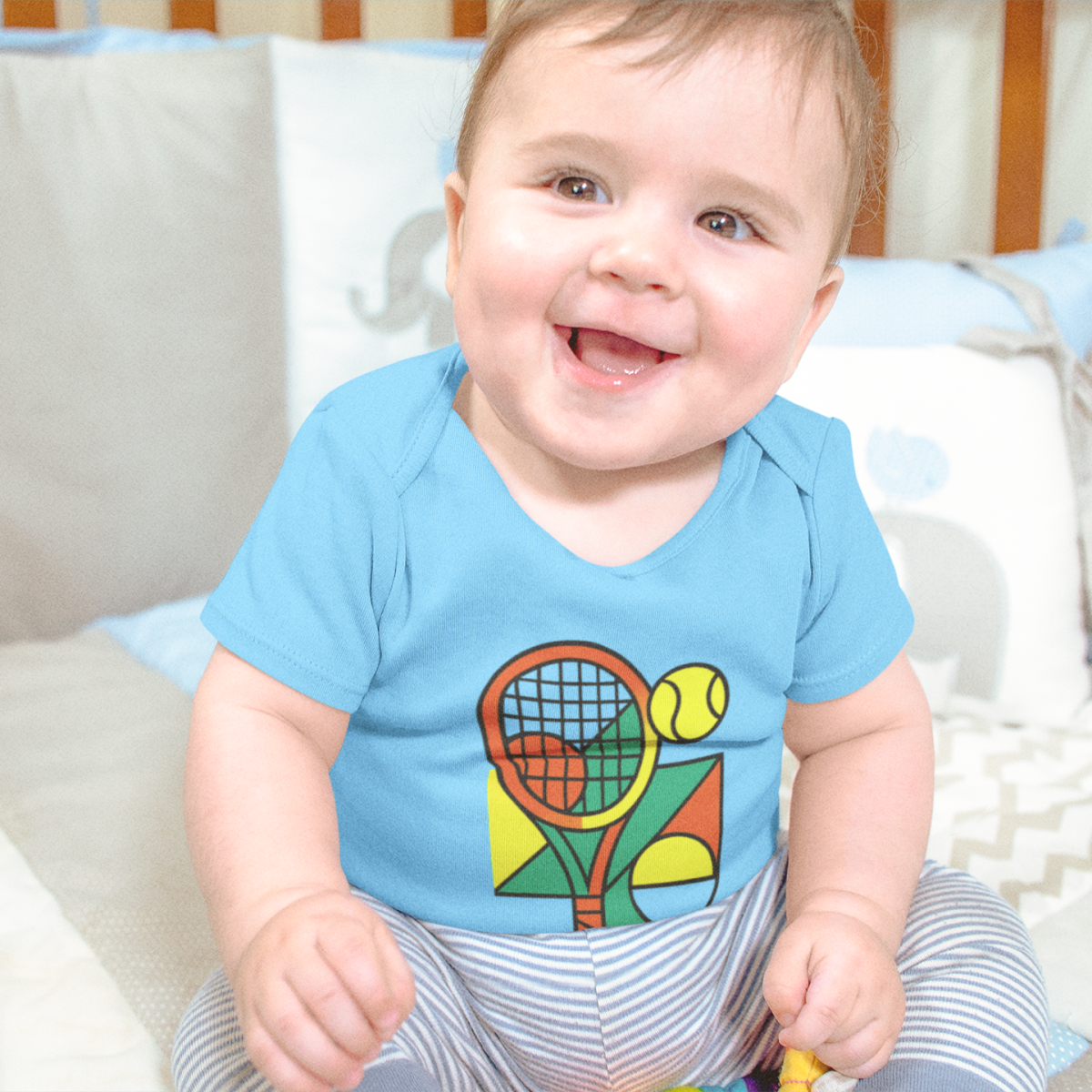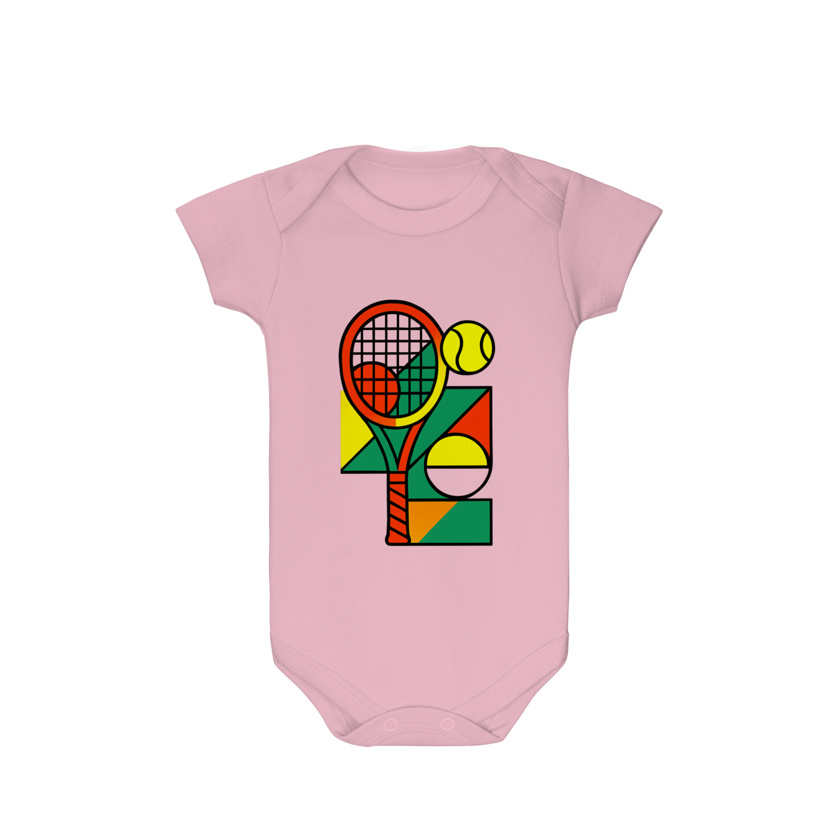A estampa exclusiva em anexo traz um design vibrante com uma raquete de tênis em tons laranja e vermelho, uma bola amarela e formas geométricas coloridas em verde, amarelo e laranja, que remetem à dinâmica e à diversão do esporte. Essa composição cria uma peça cheia de vida e perfeita para bebês de pais apaixonados por tênis.