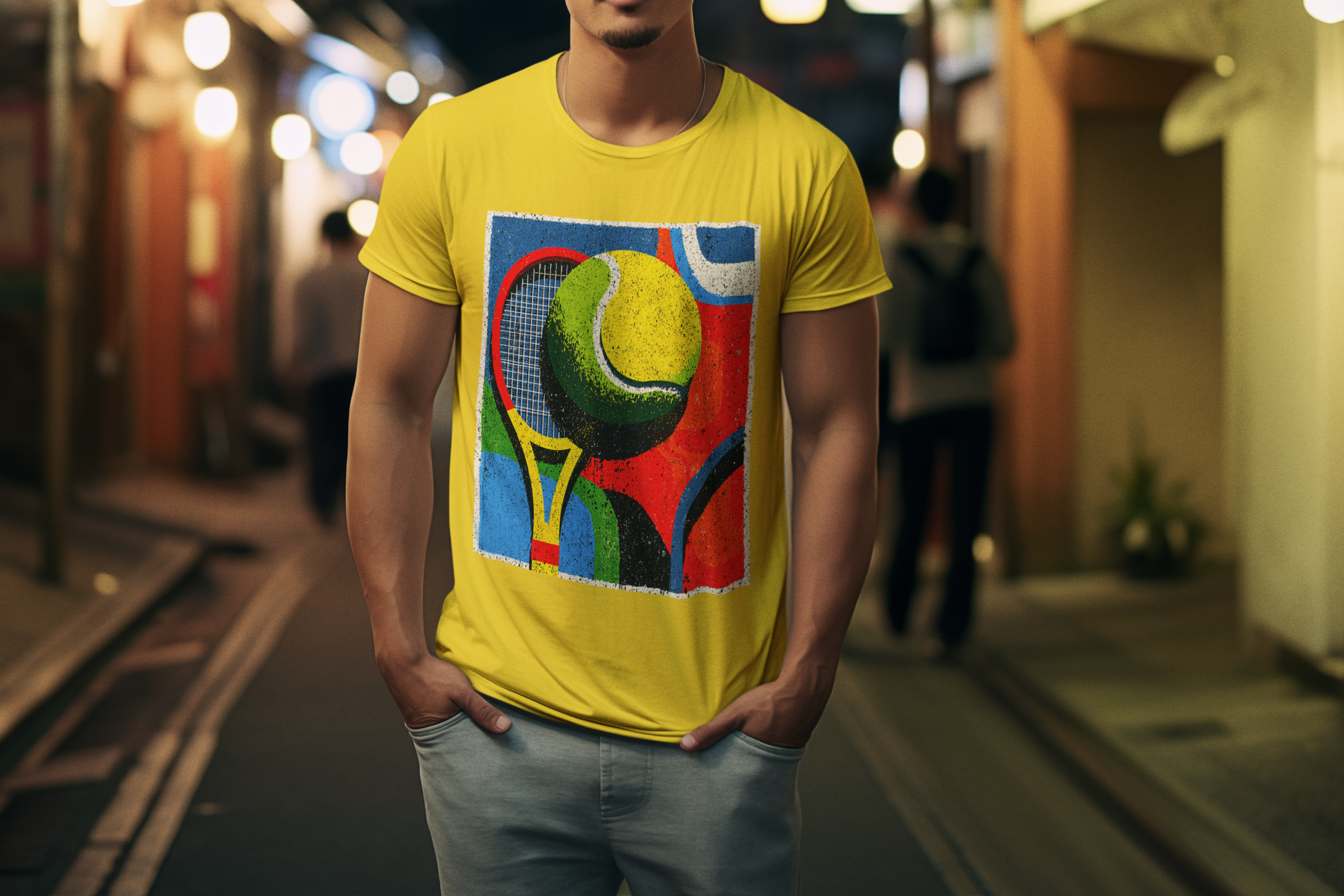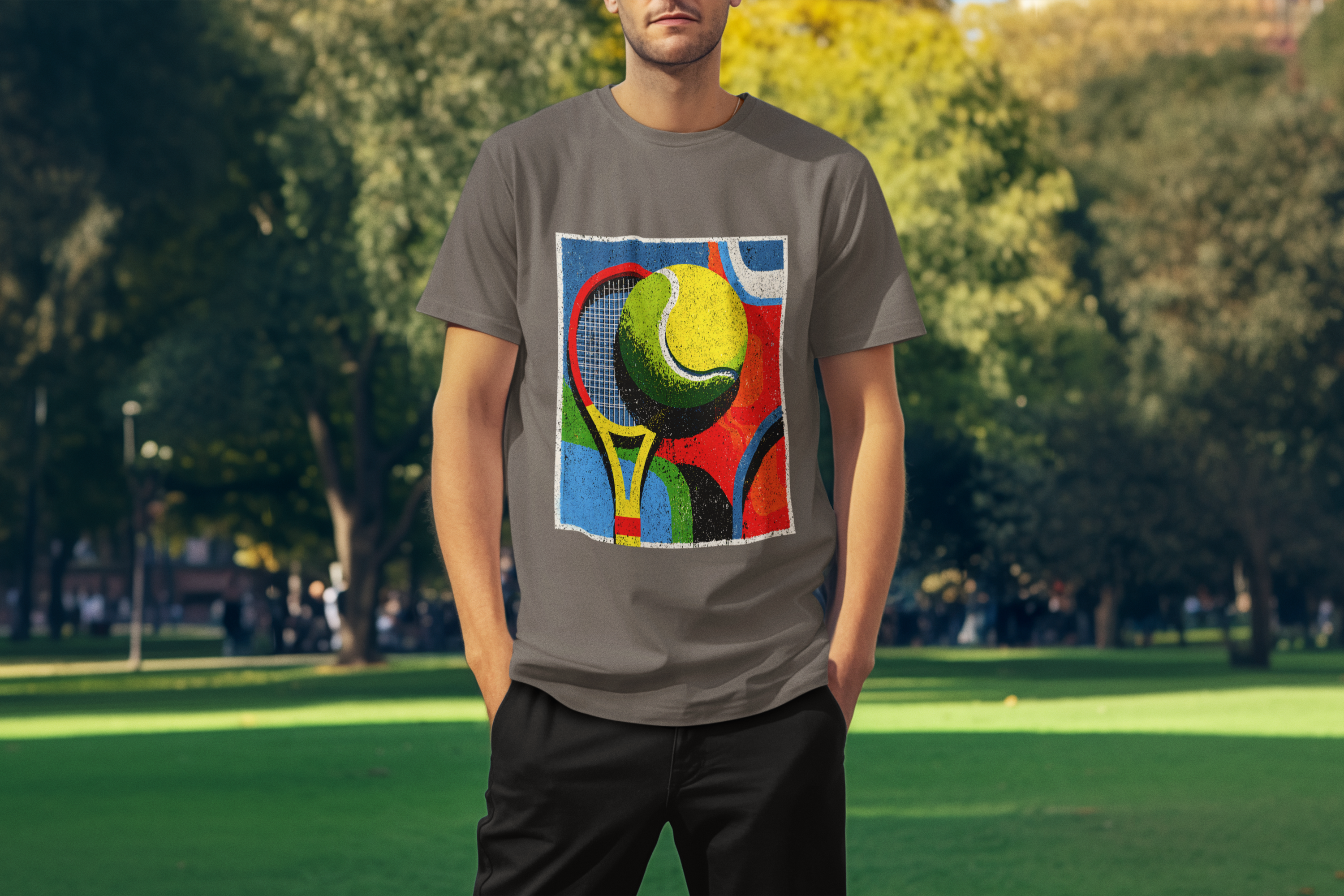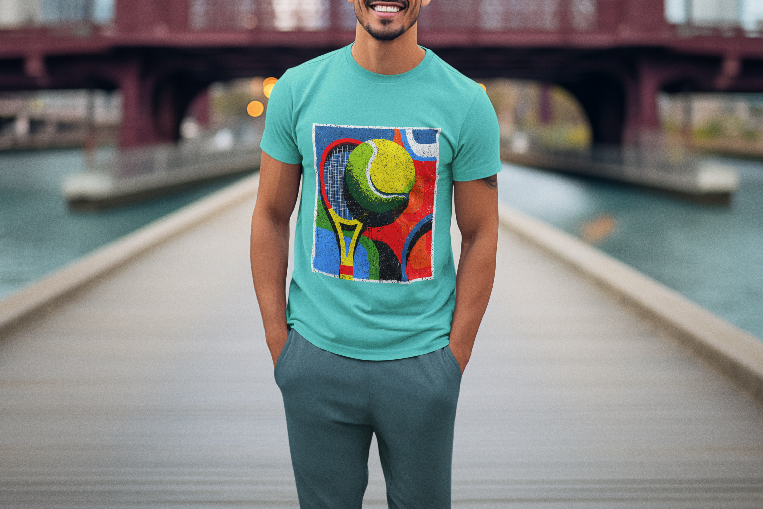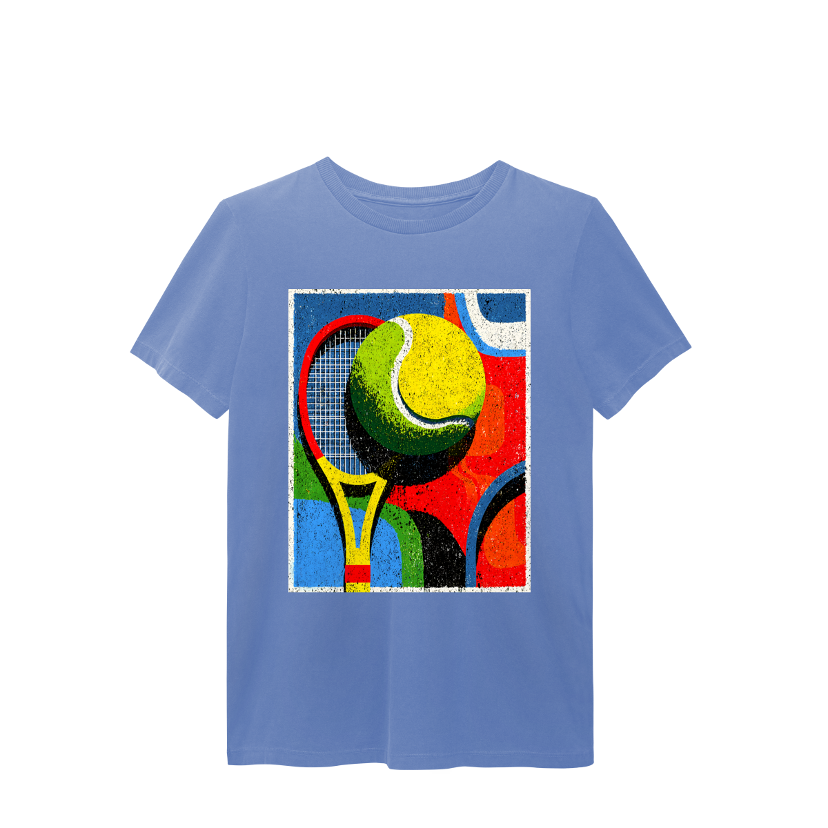 A T-Shirt Estonada Abstrata de Tênis é a escolha perfeita para quem busca estilo, conforto e autenticidade. Sua estampa exclusiva traz uma composição moderna com raquete e bola de tênis em formas geométricas e cores vibrantes, transmitindo energia, movimento e personalidade em cada detalhe.