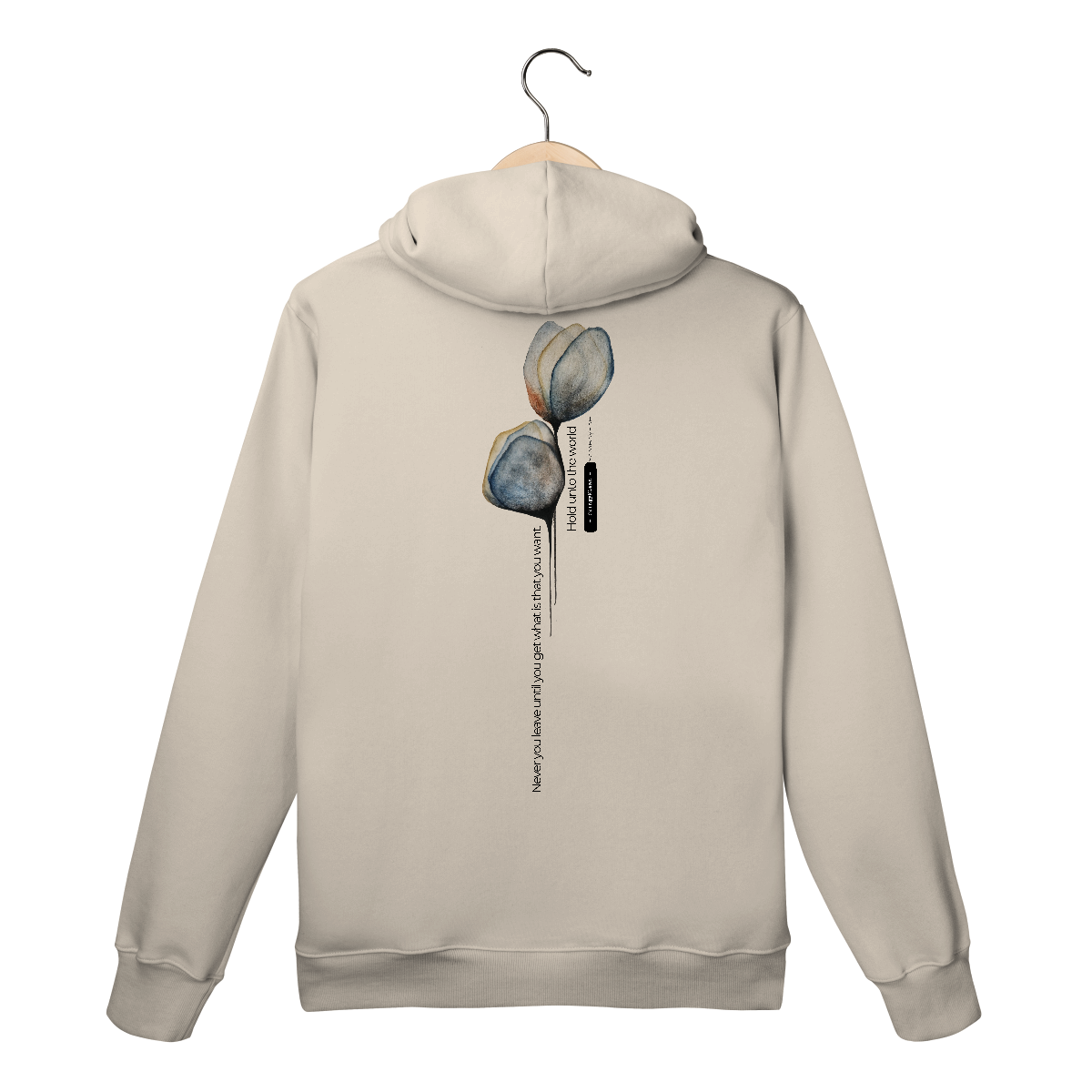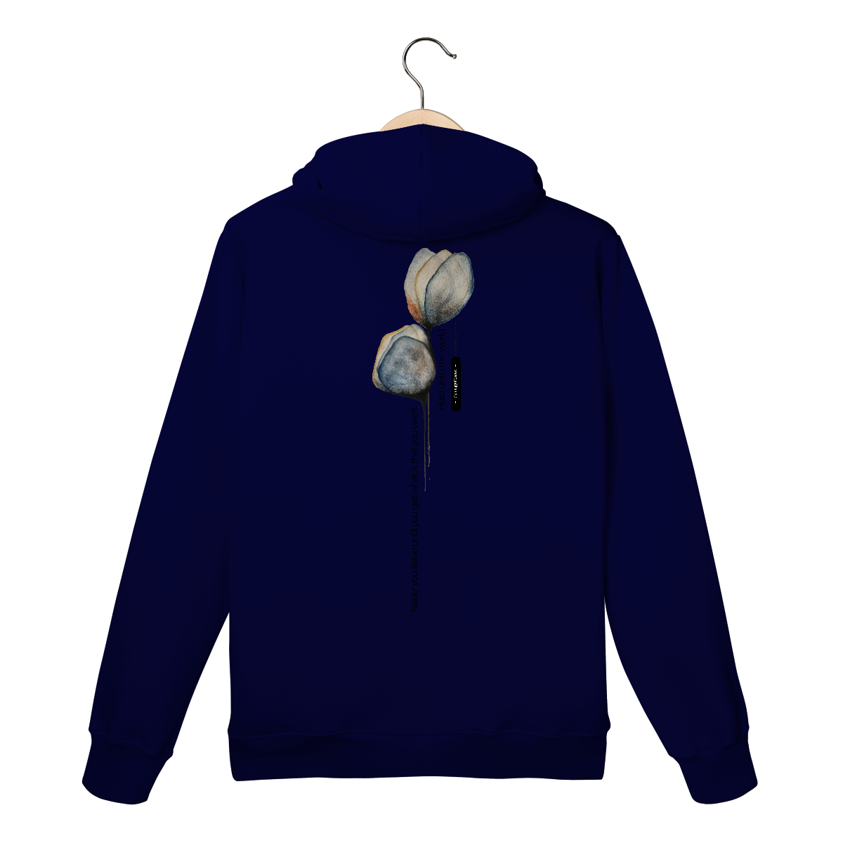 Frase da música do cantor e compositor nigeriano ChingyKlean, estampado em moleton canguru de alta qualidade - "Never you leave until you get what is that you want" - um chamado à coragem: não desita até conquistar o que veio buscar.