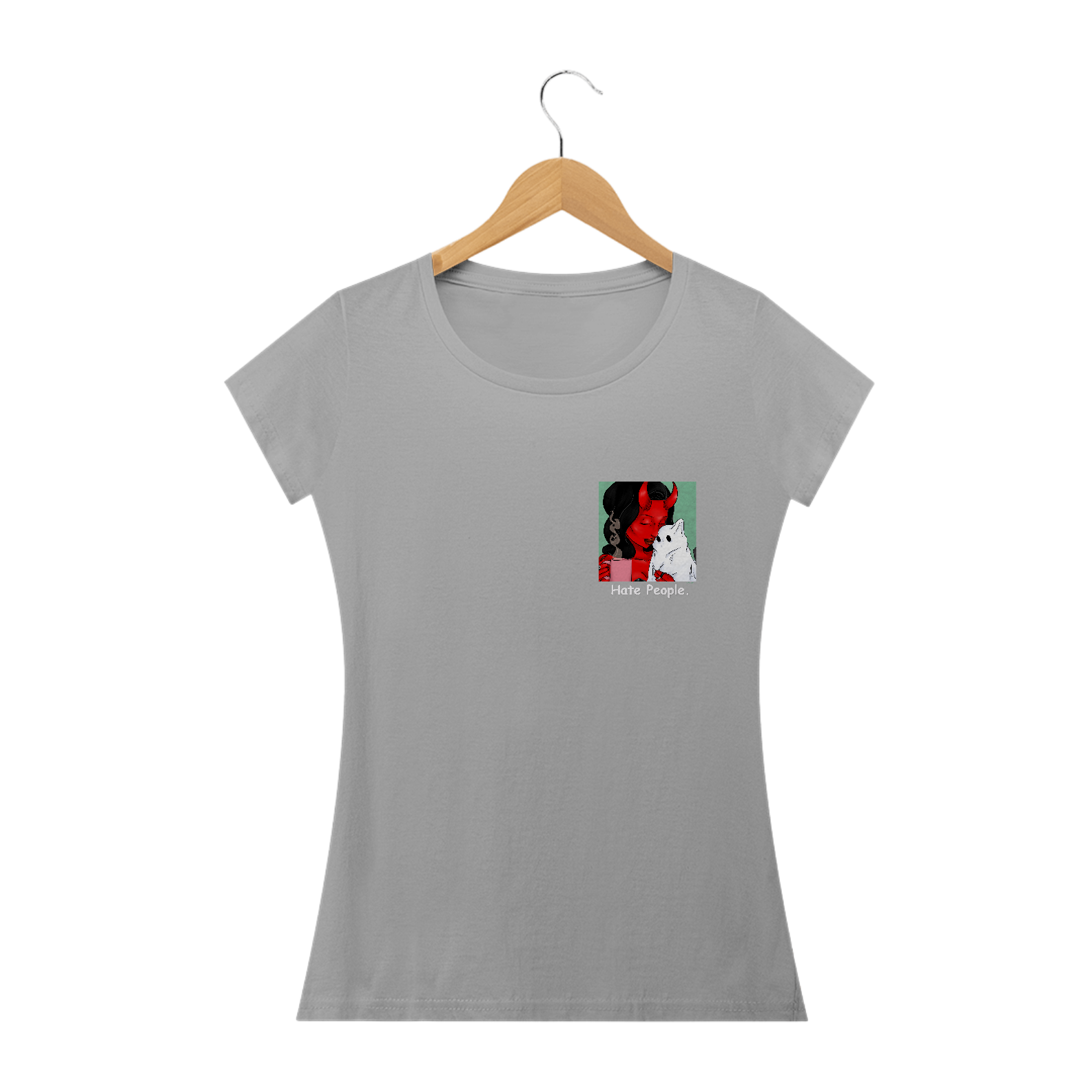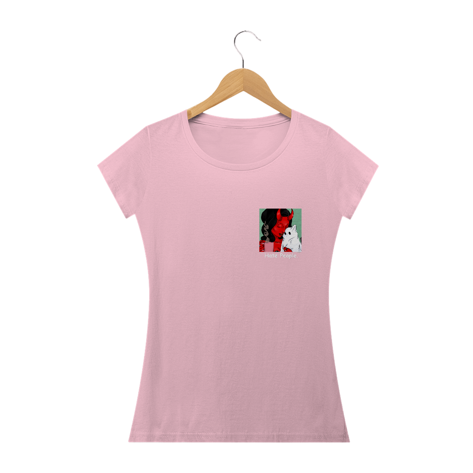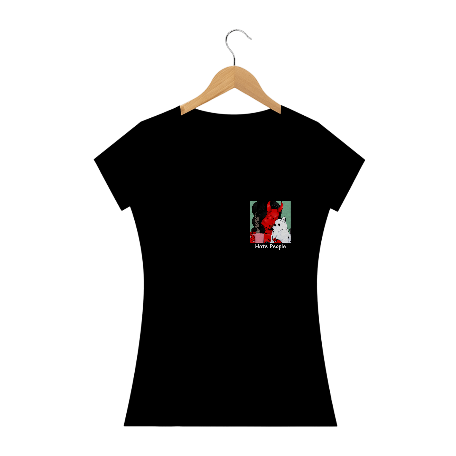 Estampa "Hate People", desenvolvida pela ilustradora Larissa Aguila, onde vemos a personagem Mazi e seu pet "Ramesses", chamado de "Ramesy".