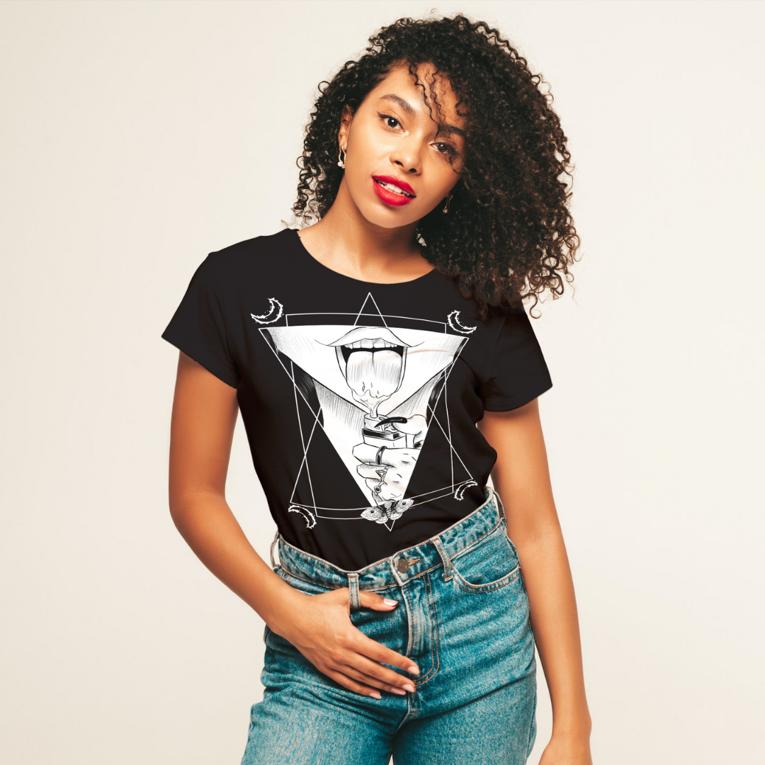 Estampa garota infernal com personagem Mazi, desenvolvida pela ilustradora Larissa Aguila, em Baby long classica, nessa opção exclusivamente no preto.