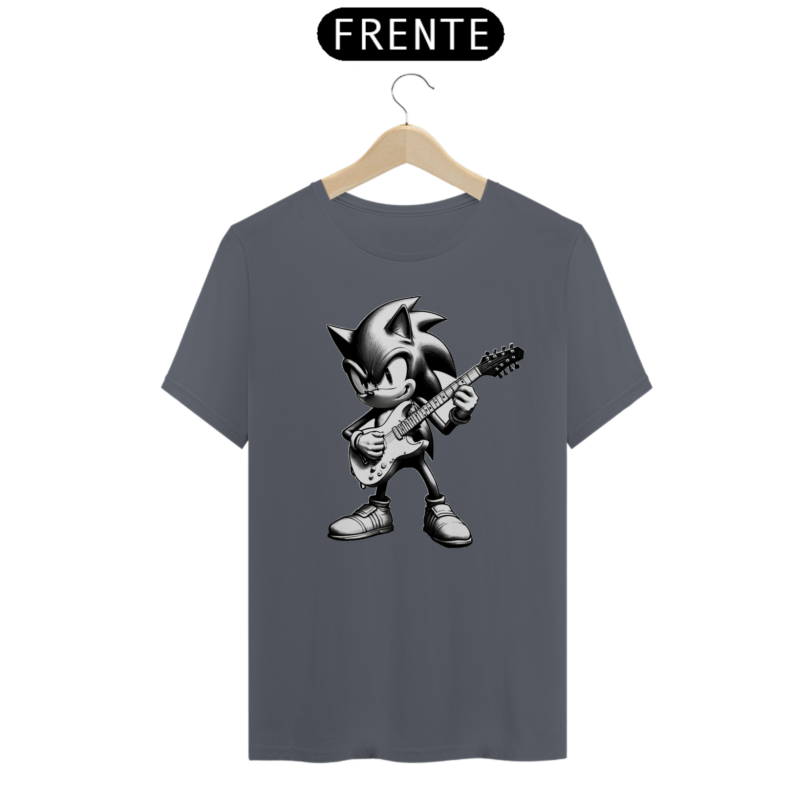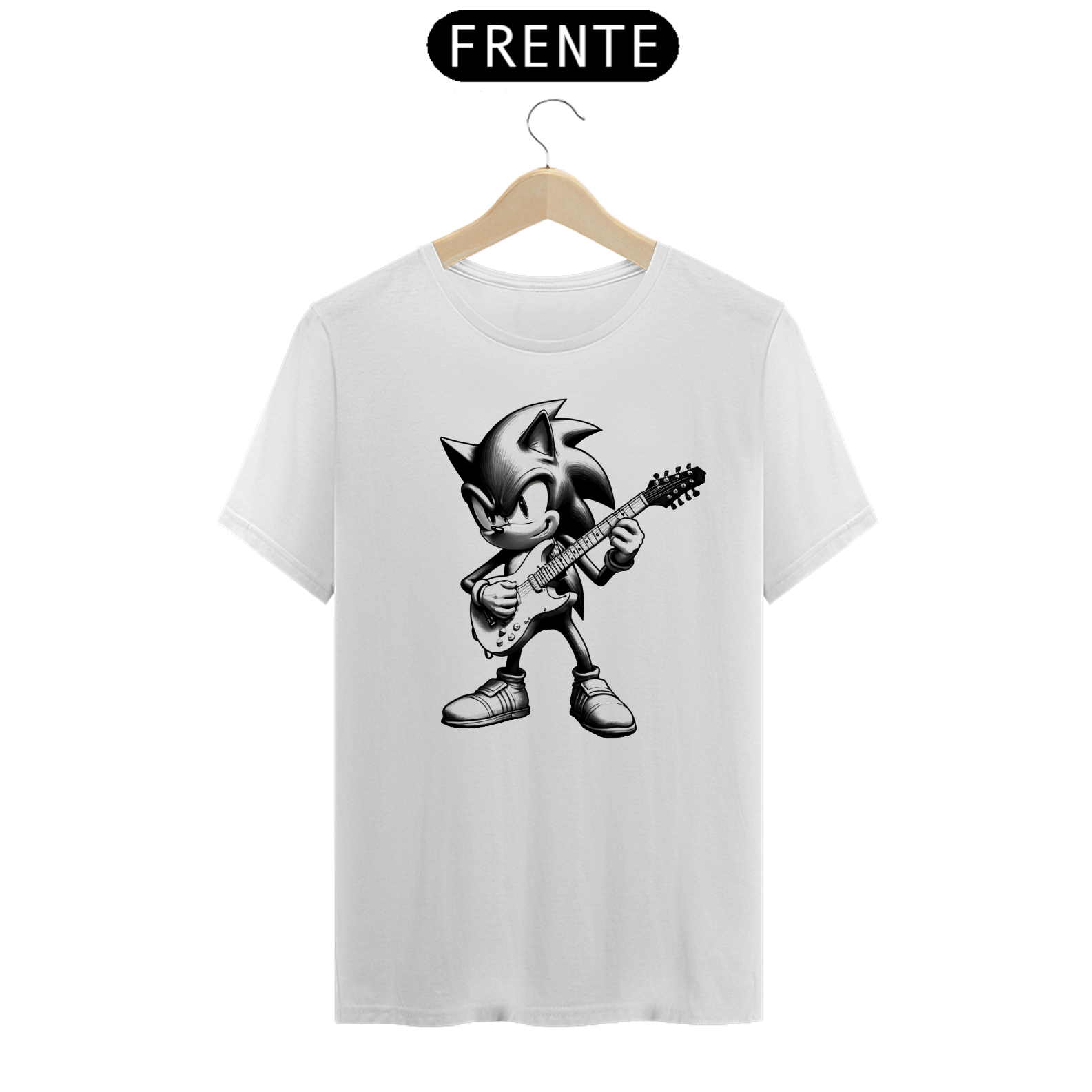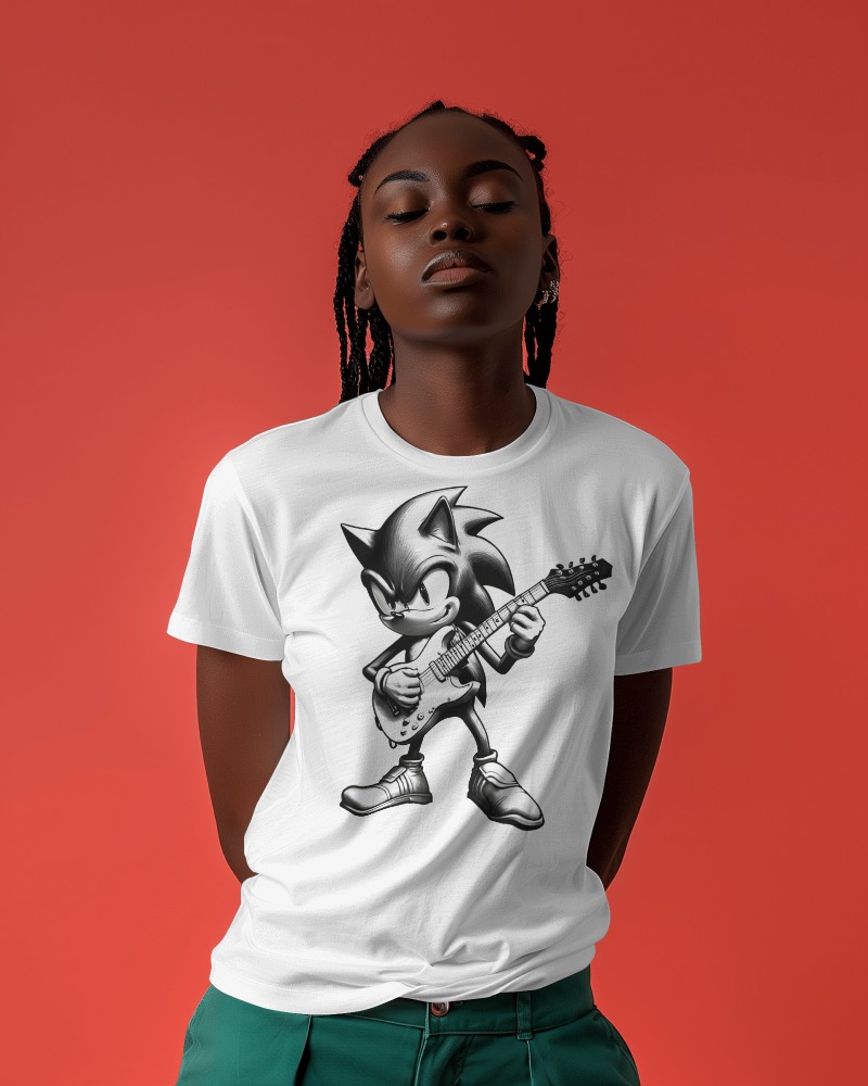O que acontece quando temos um porco espinho famoso dos videogames que é fã de rock? Camisa totalmente feita com IA, para que você seja exclusiva em sua forma de vestir!