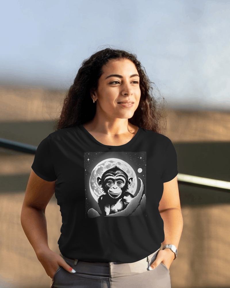 Camiseta Feminina Prime - Moon Monkey - Uma camiseta exclusiva, com arte gerada por AI, que você não vai encontrar por aí. Faça seu estilo e seja exclusiva!