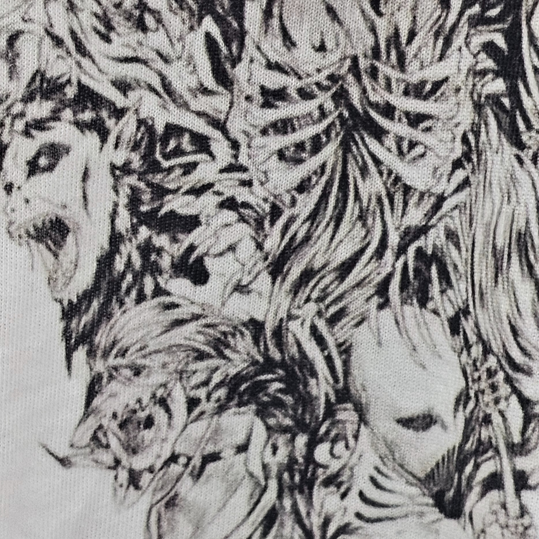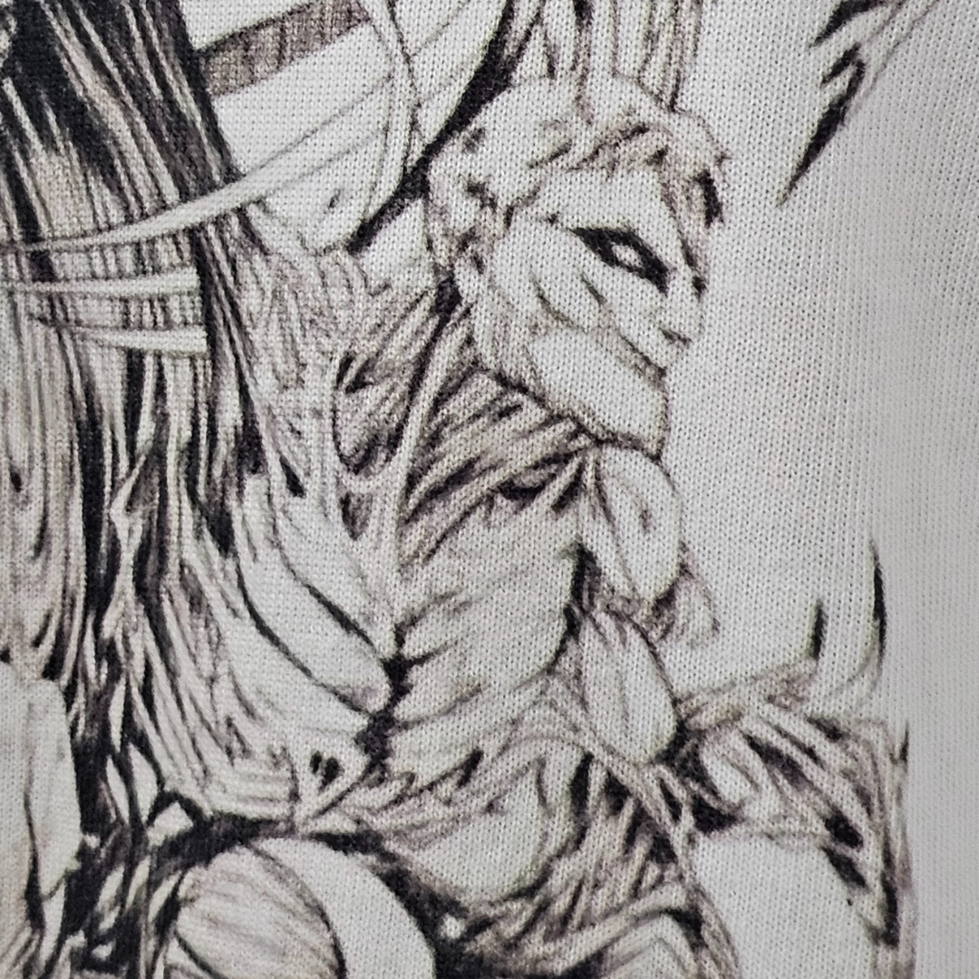 A estampa em Silk Digital HD, com área máxima de 29x42 cm na frente e nas costas, captura todos os detalhes e a intensidade de Eren, trazendo o visual do personagem à vida em alta definição.