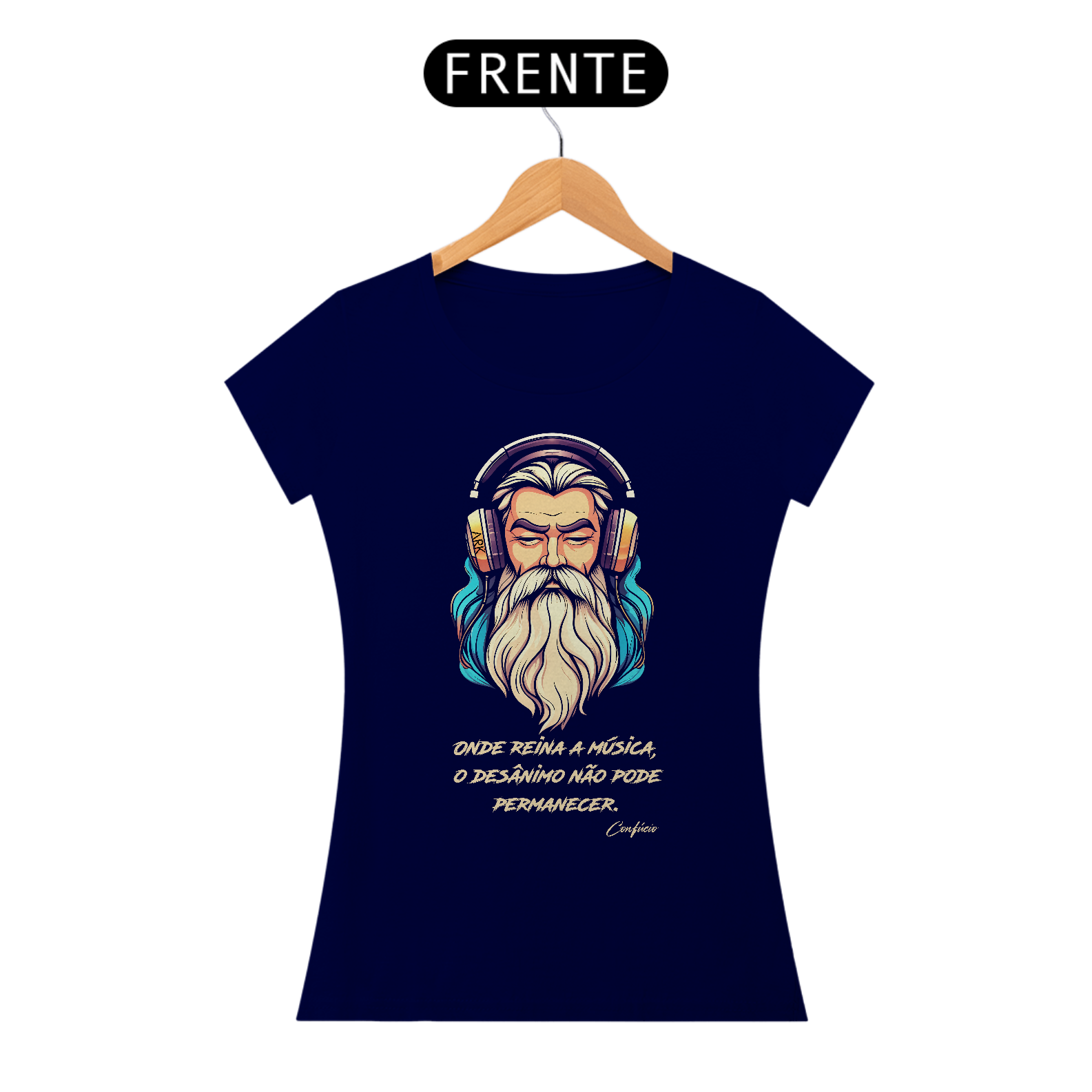 A estampa exibe o filósofo Confúcio com fones de ouvido, em um estilo contemporâneo e descontraído. A imagem é acompanhada pela frase: "Onde reina a música, o desânimo não pode permanecer." Esta combinação única une sabedoria antiga e cultura moderna, destacando a visão de Confúcio sobre a música como uma fonte de inspiração e energia positiva, capaz de dissipar qualquer desânimo.