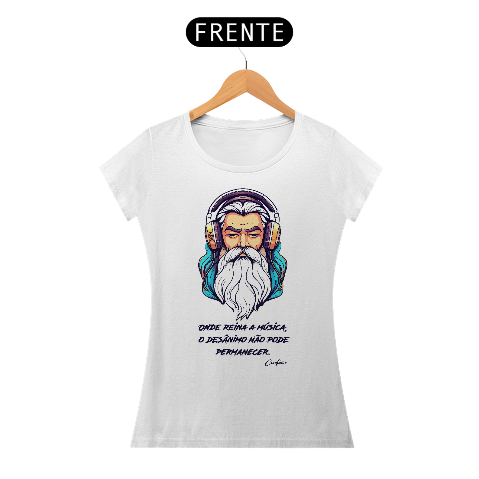 A estampa exibe o filósofo Confúcio com fones de ouvido, em um estilo contemporâneo e descontraído. A imagem é acompanhada pela frase: "Onde reina a música, o desânimo não pode permanecer." Esta combinação única une sabedoria antiga e cultura moderna, destacando a visão de Confúcio sobre a música como uma fonte de inspiração e energia positiva, capaz de dissipar qualquer desânimo.