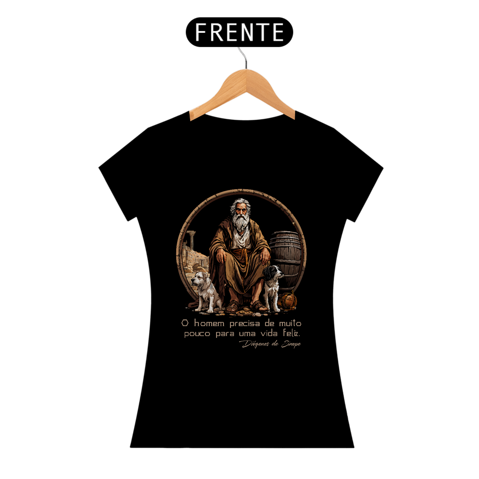 A estampa da camiseta mostra Diógenes de Sinope sentado dentro de um barril, cercado por dois cachorros amigáveis. Abaixo da imagem, a frase "O homem precisa de muito pouco para uma vida feliz." está destacada. A arte transmite a simplicidade e a filosofia minimalista de Diógenes, com um toque de conexão com a natureza e lealdade dos animais.