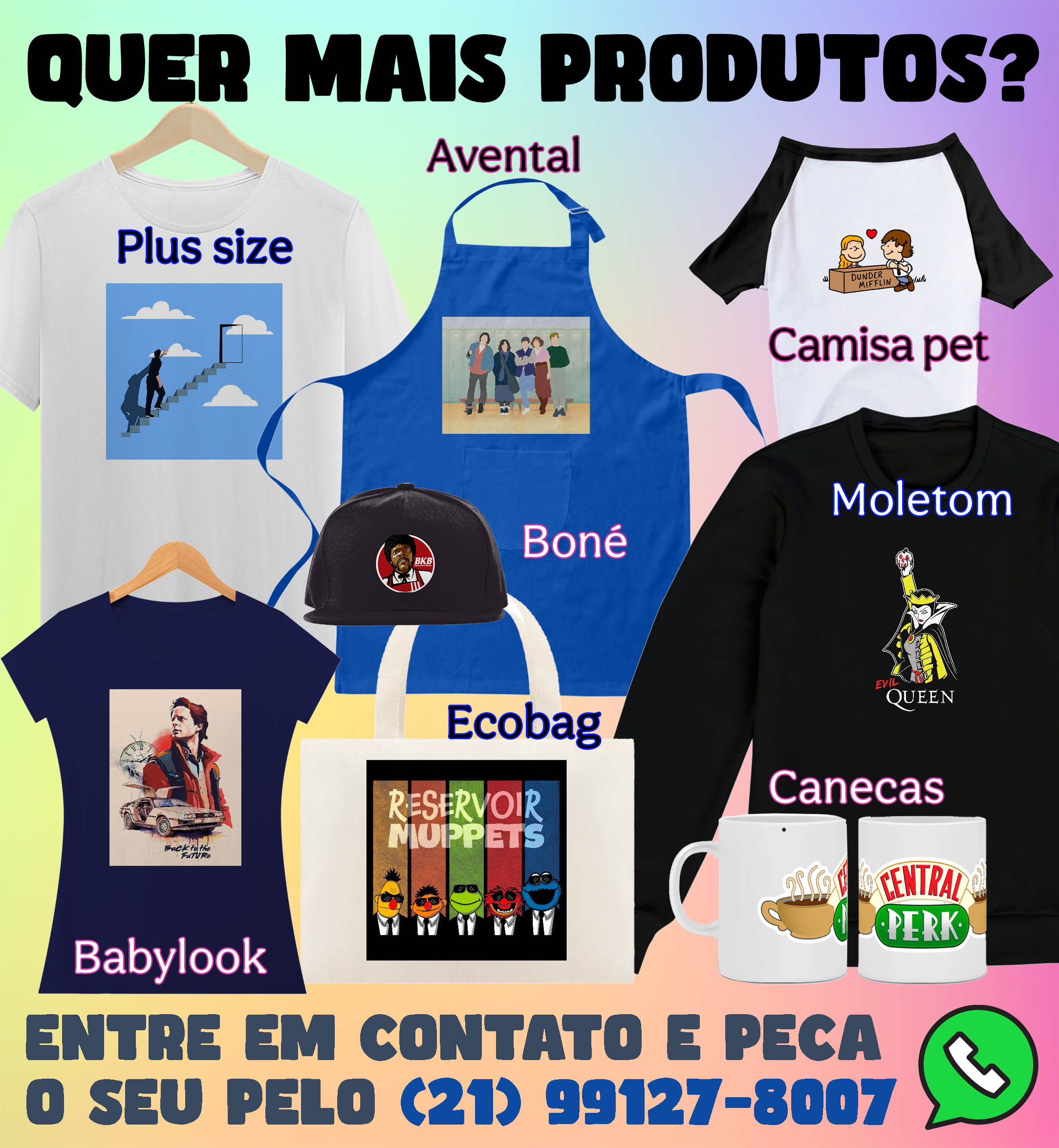 Também temos outras opções de camisas, além da T-Shirt: Regata, Baby Look, Infantil, Plus Size; ou ainda, caneca, boné, ecobag, avental, moletom e camisa pro seu pet. Se você quiser esta estampa em alguma outra camisa, é só entrar em contato que providenciamos pra você! 21 991278007