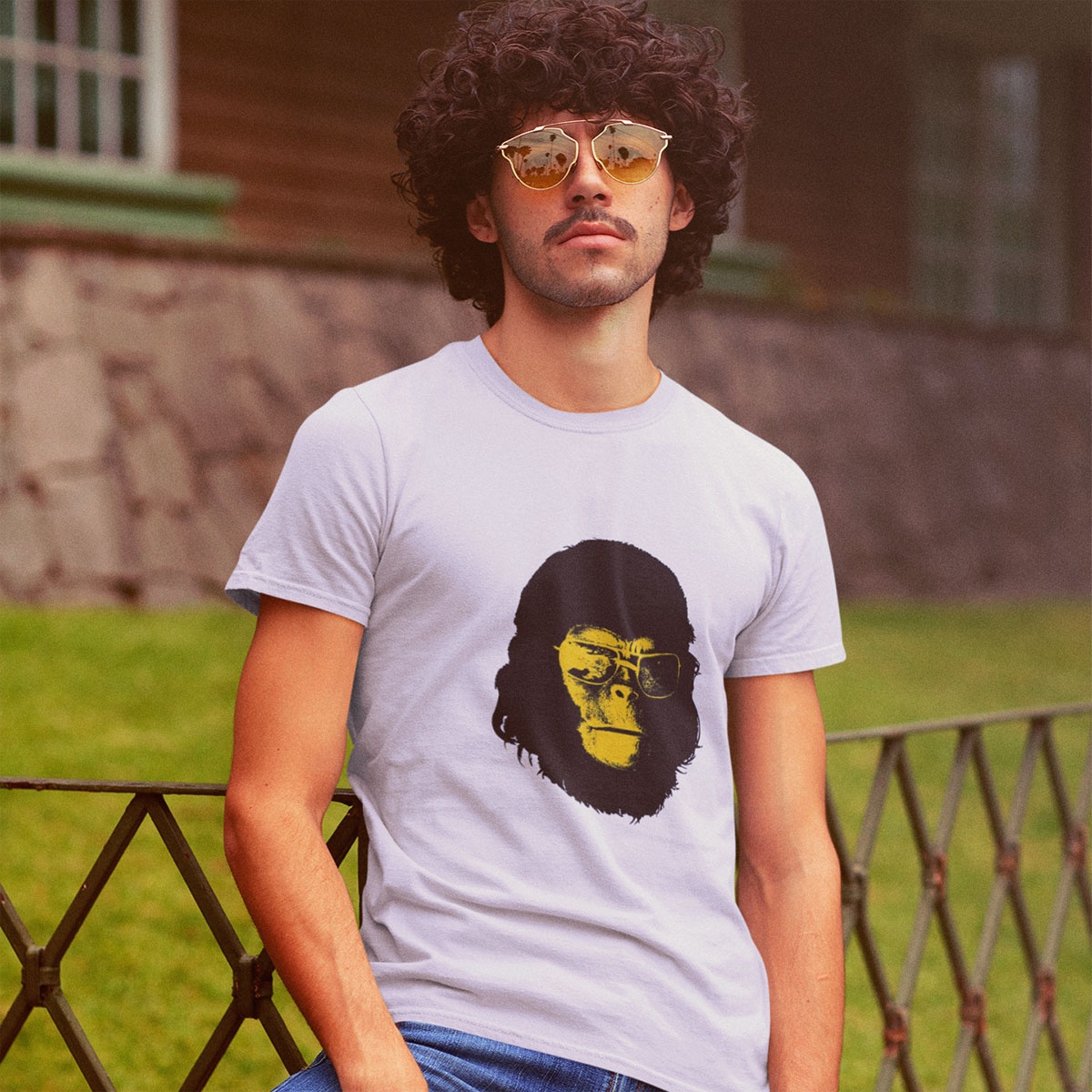 Imagem inspirada em Roddy McDowall maquiado como macaco mas usando óculos escuros, no rancho da 20th Century Fox TV, onde estrela "Planeta dos Macacos"
