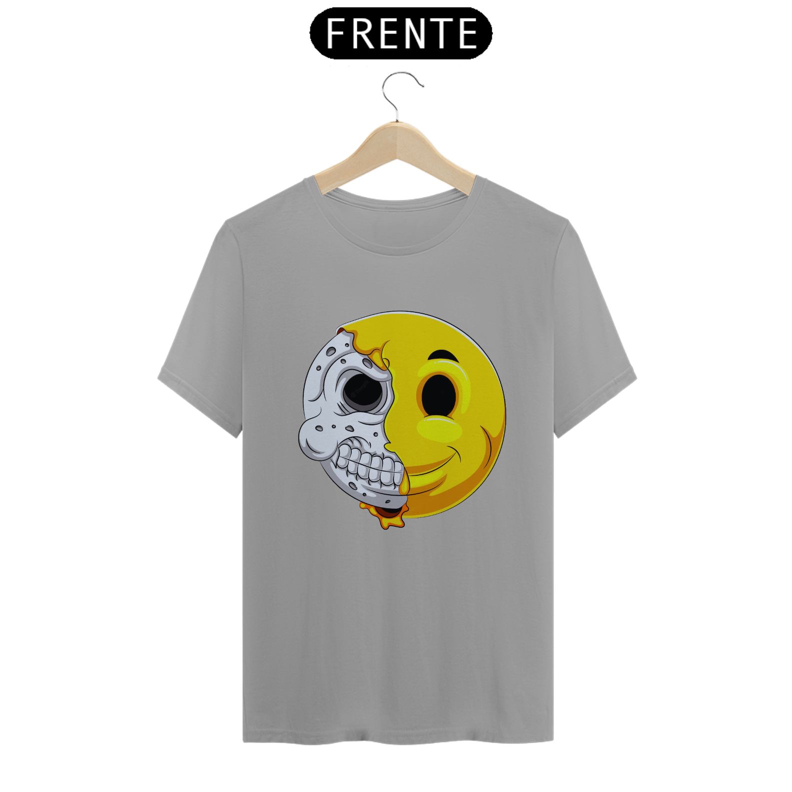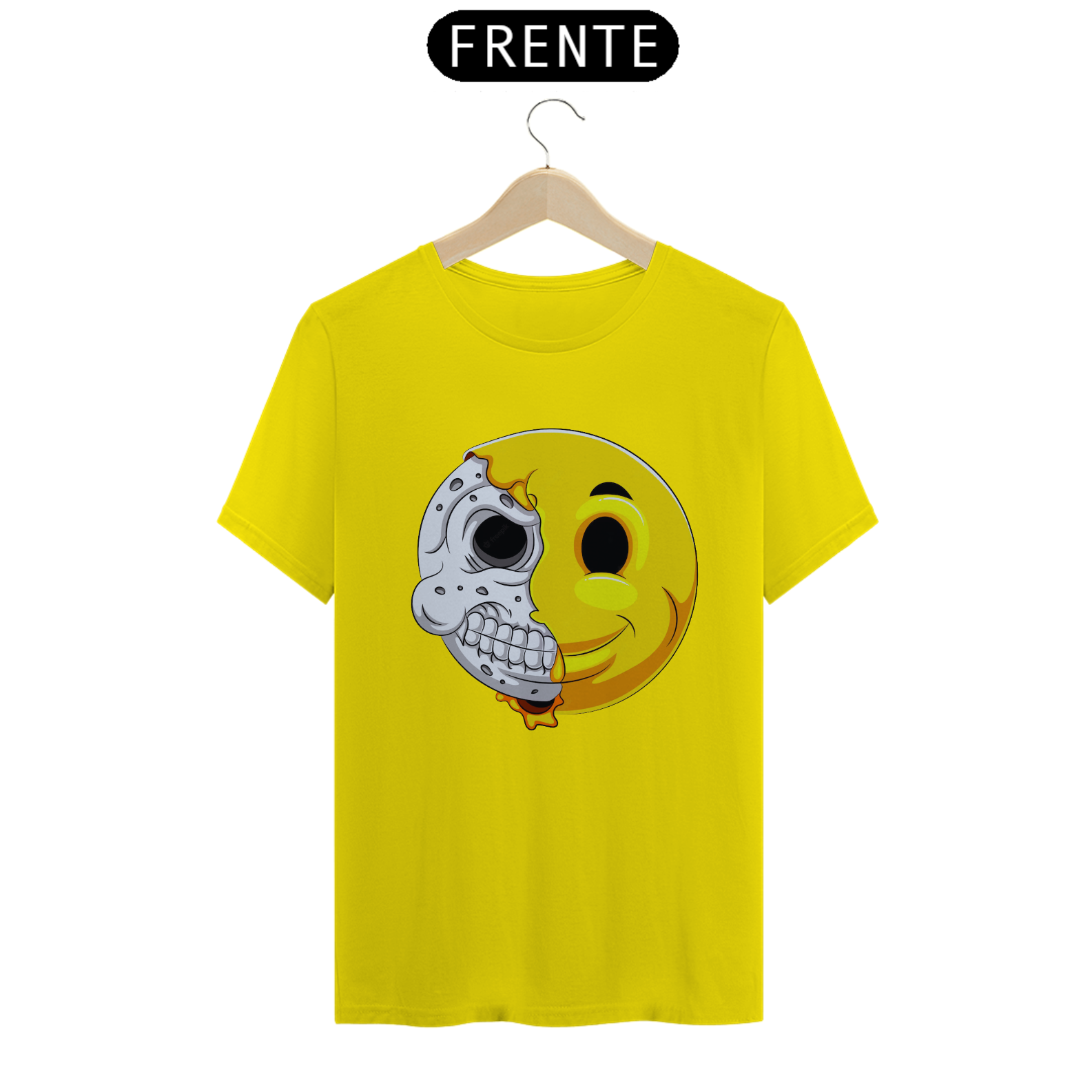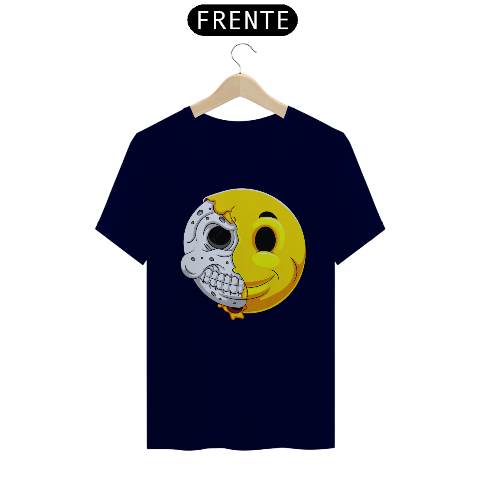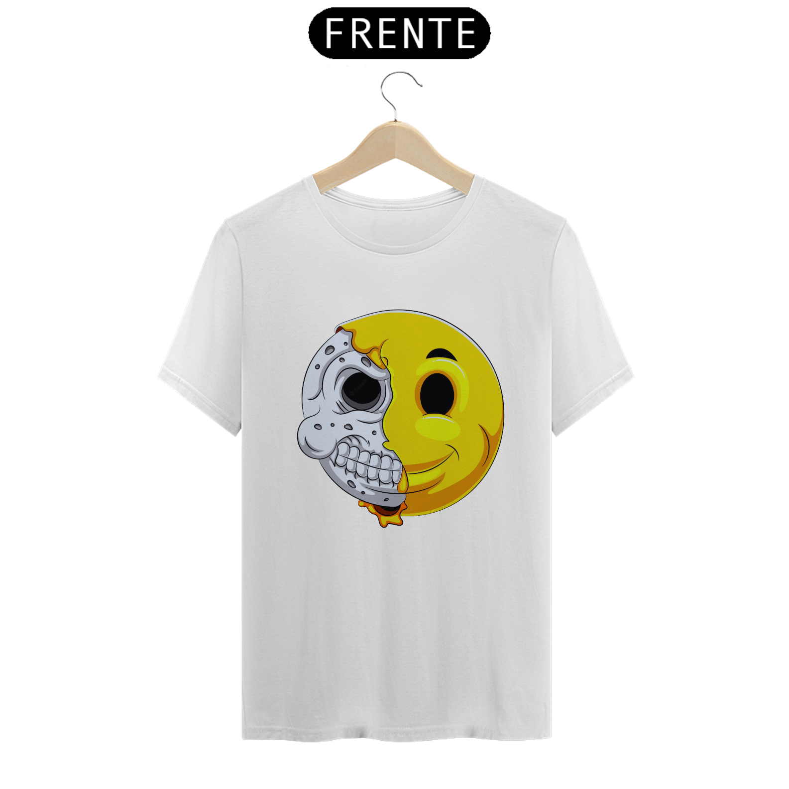 Esta estampa intrigante apresenta um emoticon com uma reviravolta surpreendente. Metade do rosto mostra a expressão clássica do emoticon, enquanto a outra metade revela um crânio, criando um contraste entre a alegria e a profundidade. Um olhar duplo sobre a dualidade da emoção e da vida, esta estampa é uma representação única da complexidade humana. Perfeita para quem aprecia uma abordagem artística diferenciada e quer expressar seu estilo de forma única.