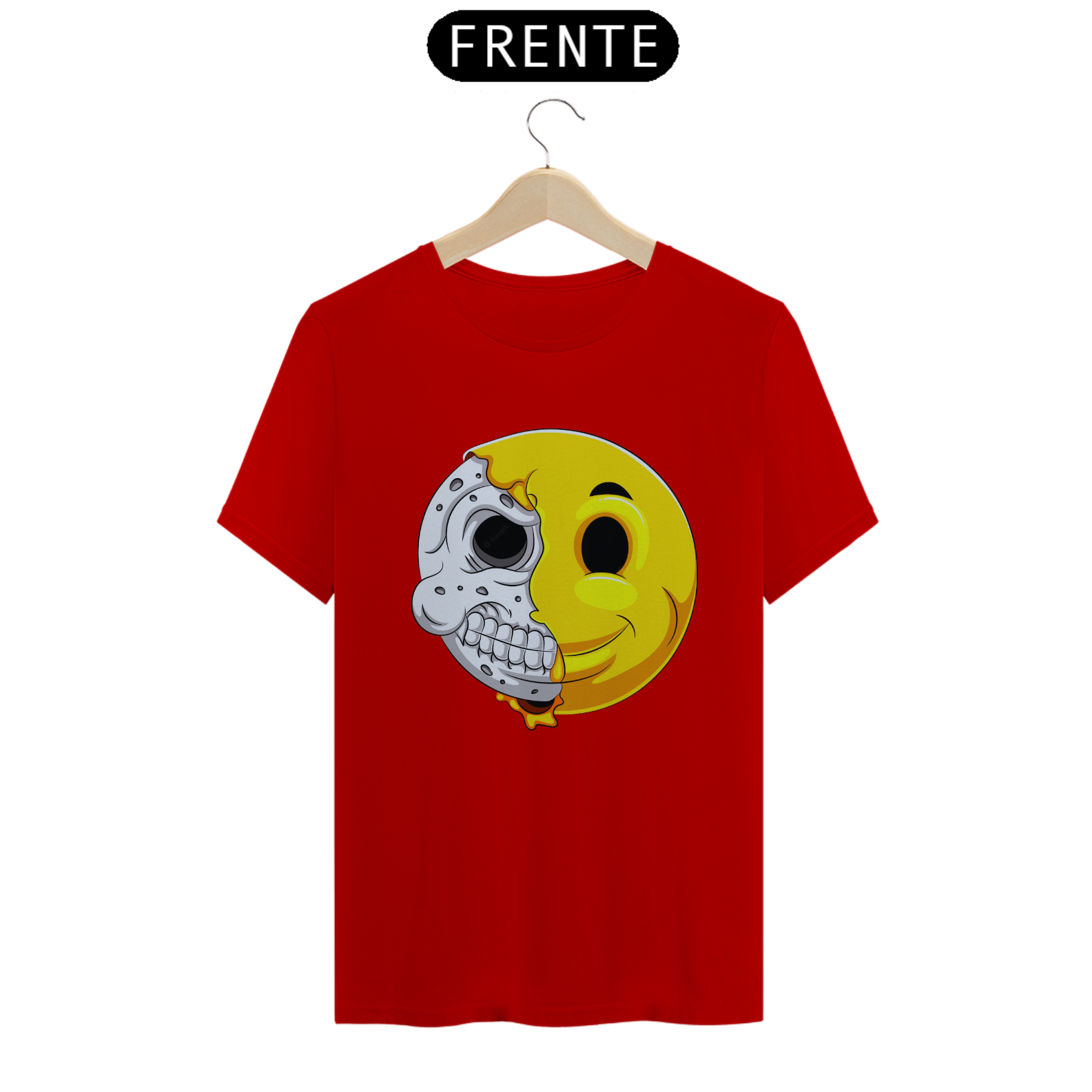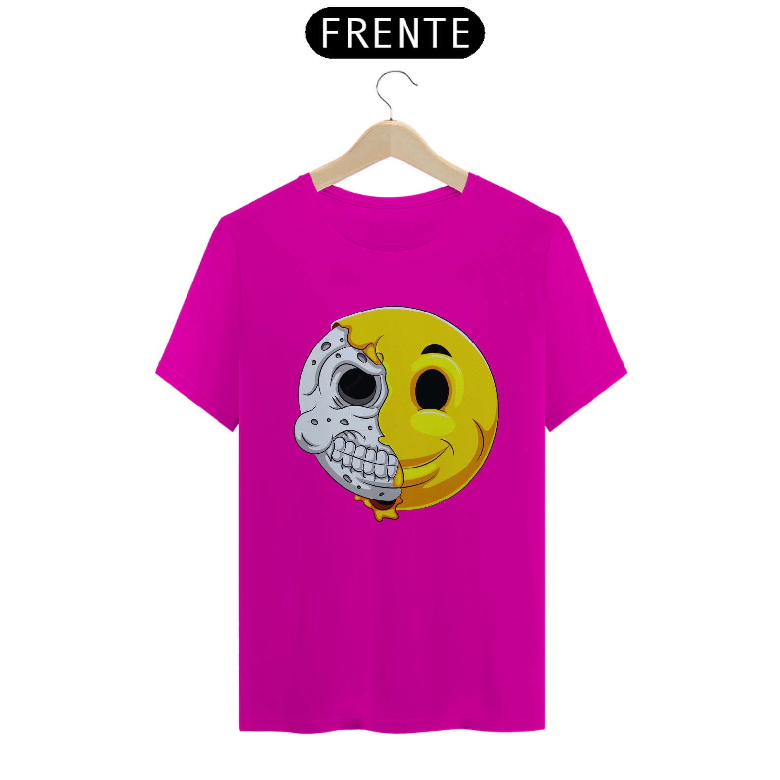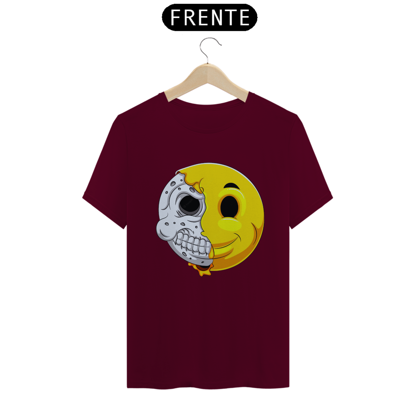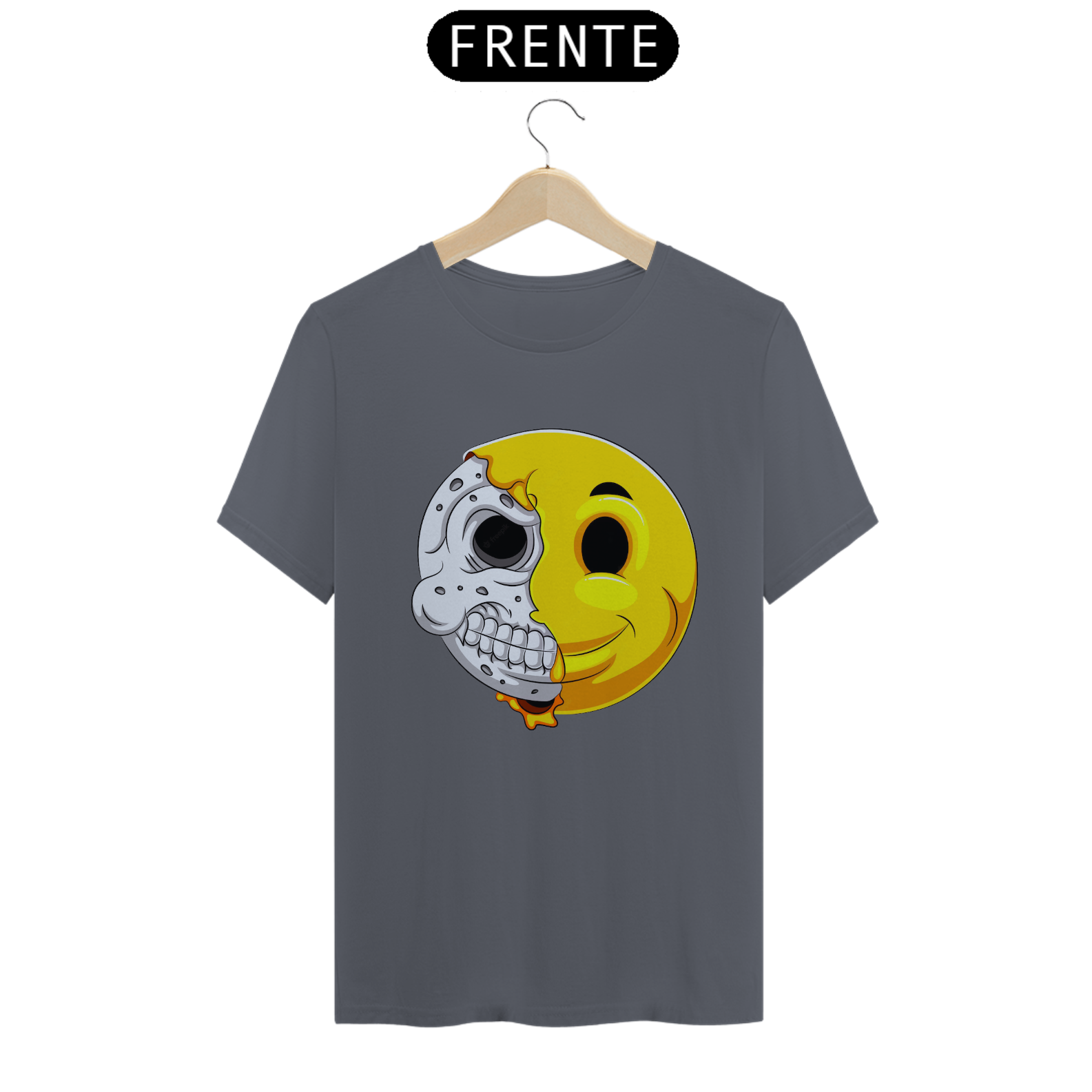 Esta estampa intrigante apresenta um emoticon com uma reviravolta surpreendente. Metade do rosto mostra a expressão clássica do emoticon, enquanto a outra metade revela um crânio, criando um contraste entre a alegria e a profundidade. Um olhar duplo sobre a dualidade da emoção e da vida, esta estampa é uma representação única da complexidade humana. Perfeita para quem aprecia uma abordagem artística diferenciada e quer expressar seu estilo de forma única.