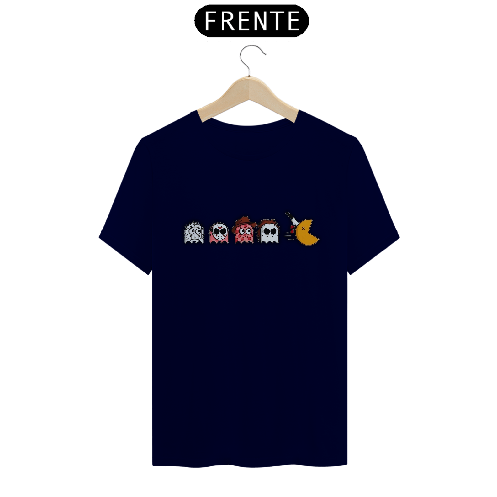 Se você adora uma boa dose de humor sombrio, não pode perder a estampa 'Sátira Sinistra'. Nessa divertida obra de arte, você encontrará o personagem Pecmen em uma situação hilária, com uma faca cravada em sua cabeça, enquanto os famosos vilões do terror, Hellraiser, Michael Myers, Freddy Krueger e Jason, de sexta-feira 13, aparecem de forma adoravelmente caricata. Essa camiseta é perfeita para os fãs de desenhos satíricos e amantes dos filmes clássicos do gênero. Vista-se com estilo peculiar e mostre ao mundo o seu senso de humor sinistro com a 'Sátira Sinistra'. Divirta-se com essa versão cômica dos ícones do terror, mas lembre-se: o riso pode ser a melhor forma de espantar os pesadelos!