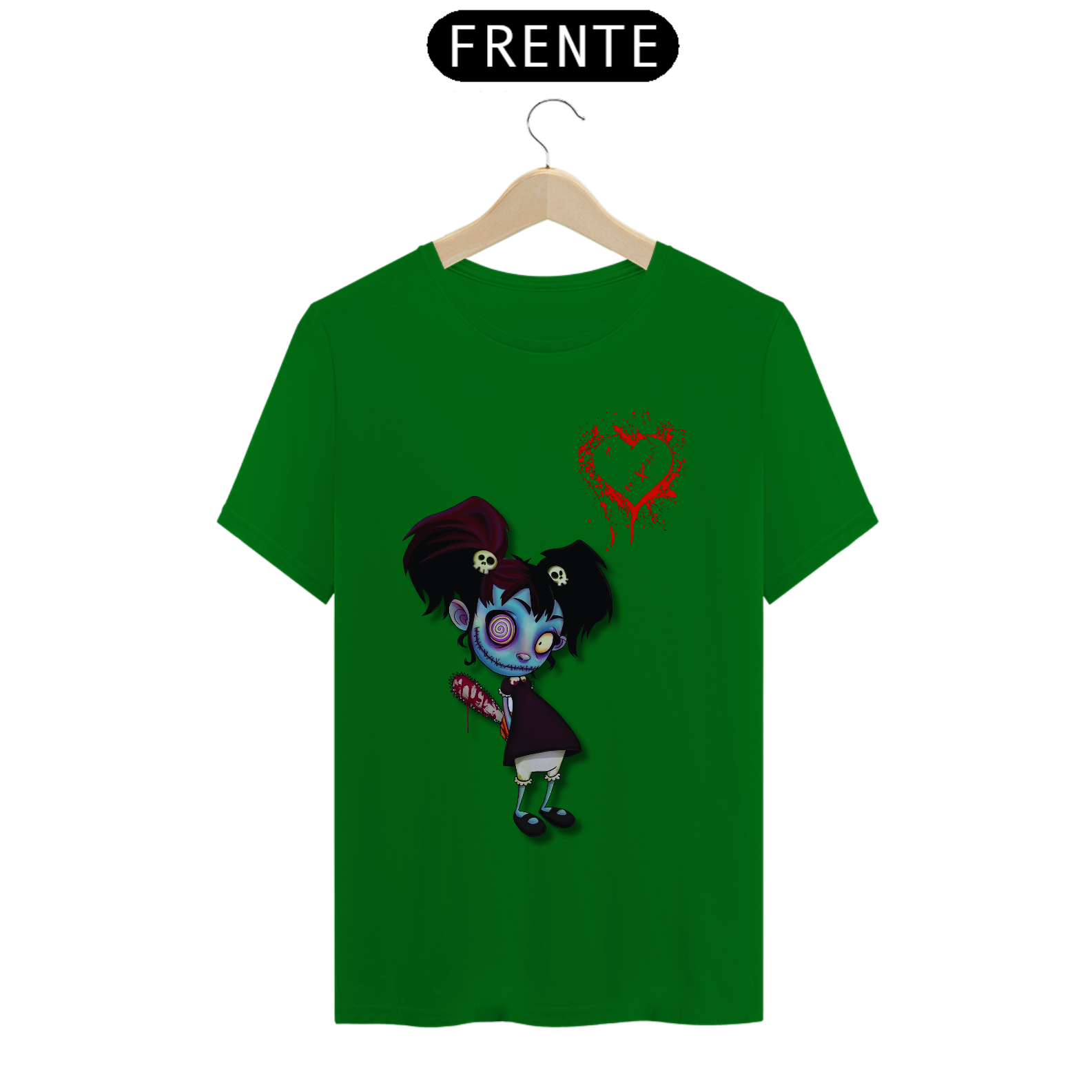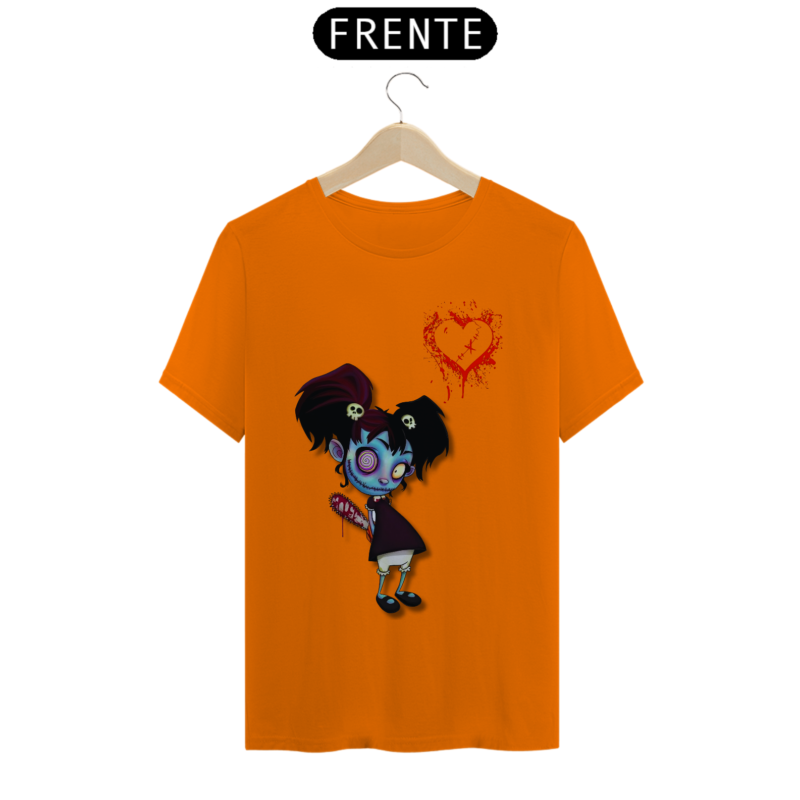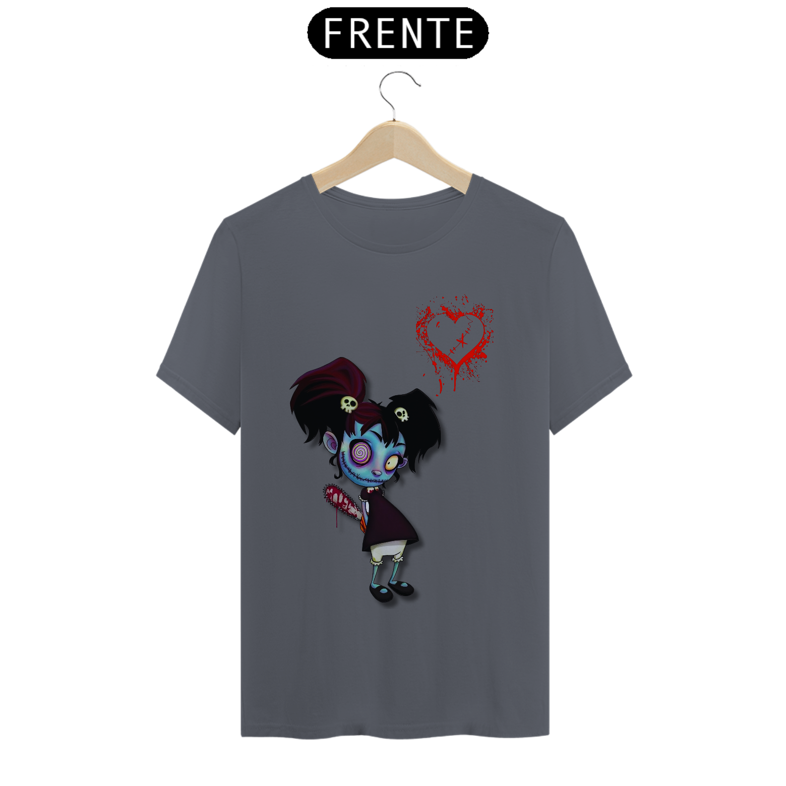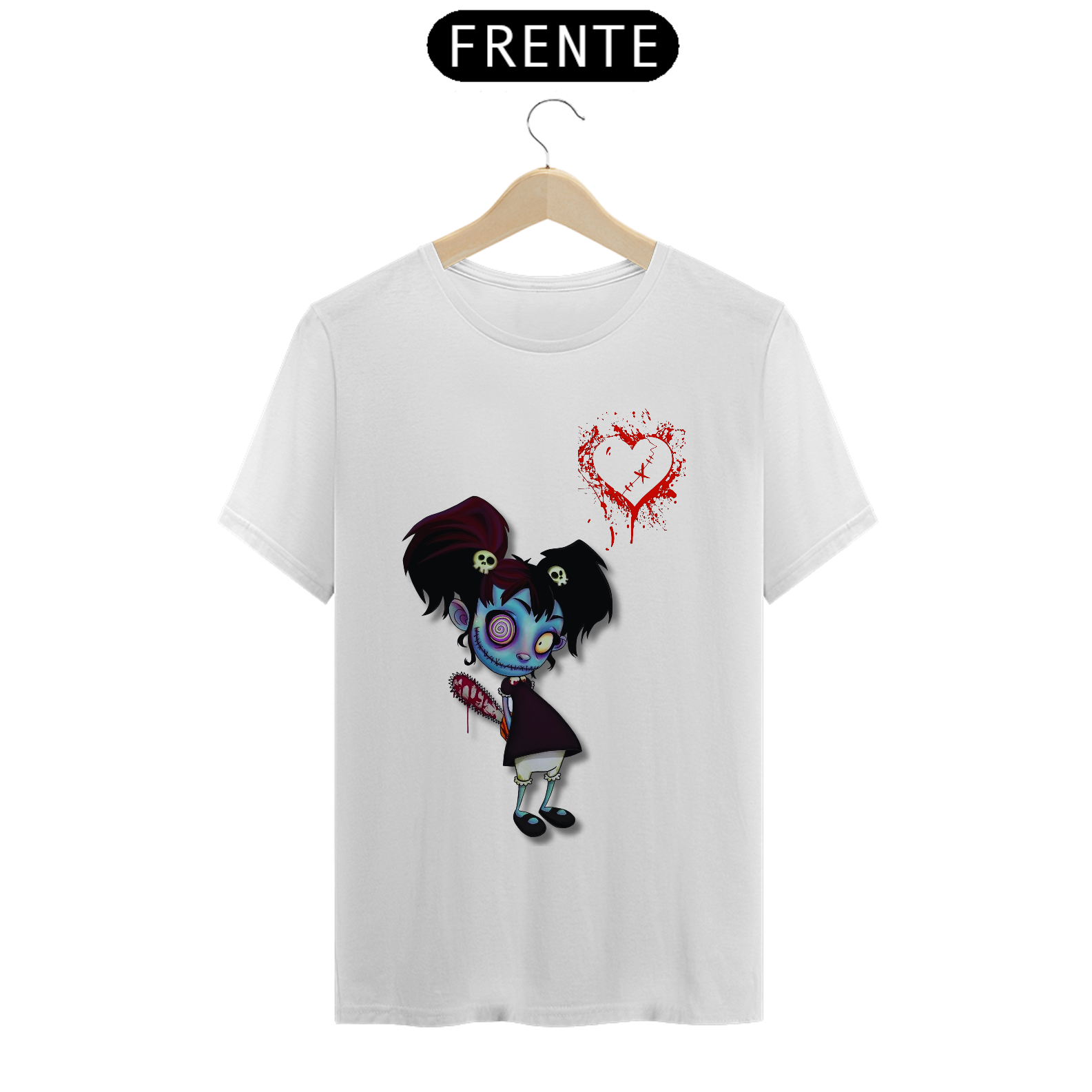 Esta estampa traz uma menina zumbi com um sorriso perturbador estampado em seu rosto. Mas não se engane, por trás desse semblante assustador, há um coração que pulsa no ritmo macabro do amor. Uma motosserra escondida, pronta para ação, adiciona um toque divertidamente assustador. Se você é fã de um romance peculiar e adora um humor sombrio, essa camiseta é perfeita para você! Vista-se com o amor zumbificado e espalhe risadas arrepiantes por onde passar. Afinal, mesmo os mortos-vivos merecem um pouco de amor... ou algo parecido!