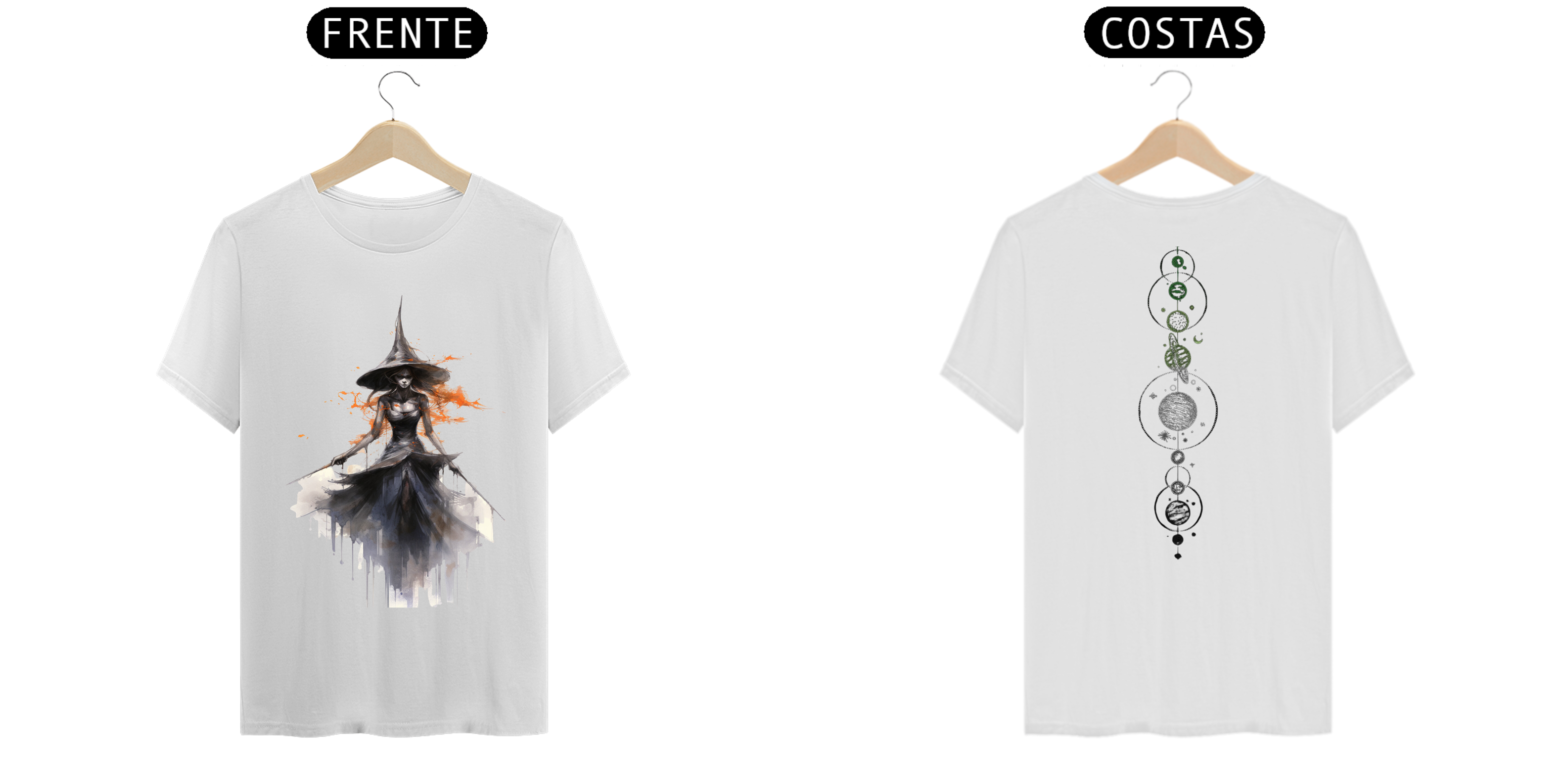 "Esta camiseta traz uma ilustração fascinante no estilo de desenho digital, apresentando uma bruxa enigmática em primeiro plano, enquanto nos fundos, um alinhamento dos planetas cria uma atmosfera cósmica. A bruxa está retratada com detalhes minuciosos, capturando sua expressão concentrada e seus gestos poderosos. Seu olhar está voltado para o céu, como se estivesse sintonizada com as energias celestiais. O alinhamento dos planetas ao fundo adiciona um toque de magia e mistério, simbolizando a conexão da bruxa com os ciclos cósmicos. A combinação de cores vibrantes e sutis cria um contraste cativante, destacando a figura central e os planetas em segundo plano. Vista esta camiseta e sinta-se conectado(a) com o universo, despertando sua própria essência mágica e explorando os segredos ocultos do cosmos."