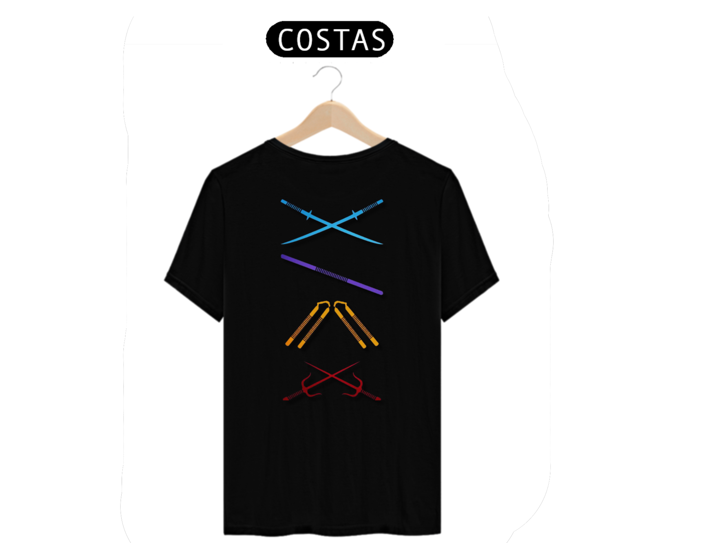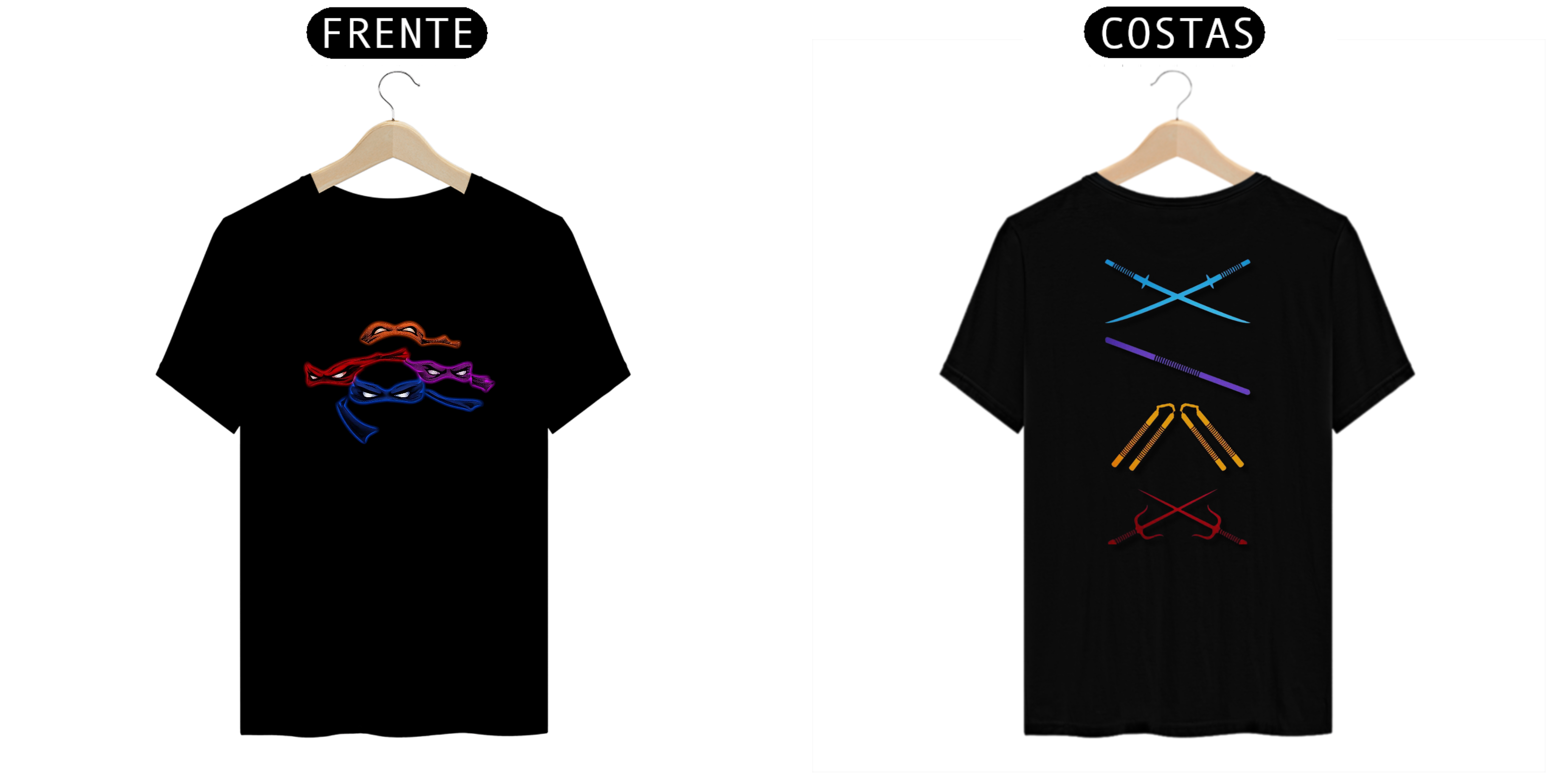 Já do lado de trás da camiseta, teremos uma estampa detalhada e fascinante das armas características de cada tartaruga. Para Leonardo, a espada Katana; Michelangelo, o par de nunchakus; Donatello, o bastão bo; e Raphael, as icônicas sai. Essa estampa mostrará toda a diversidade e habilidade de cada Tartaruga Ninja em suas batalhas contra o crime.