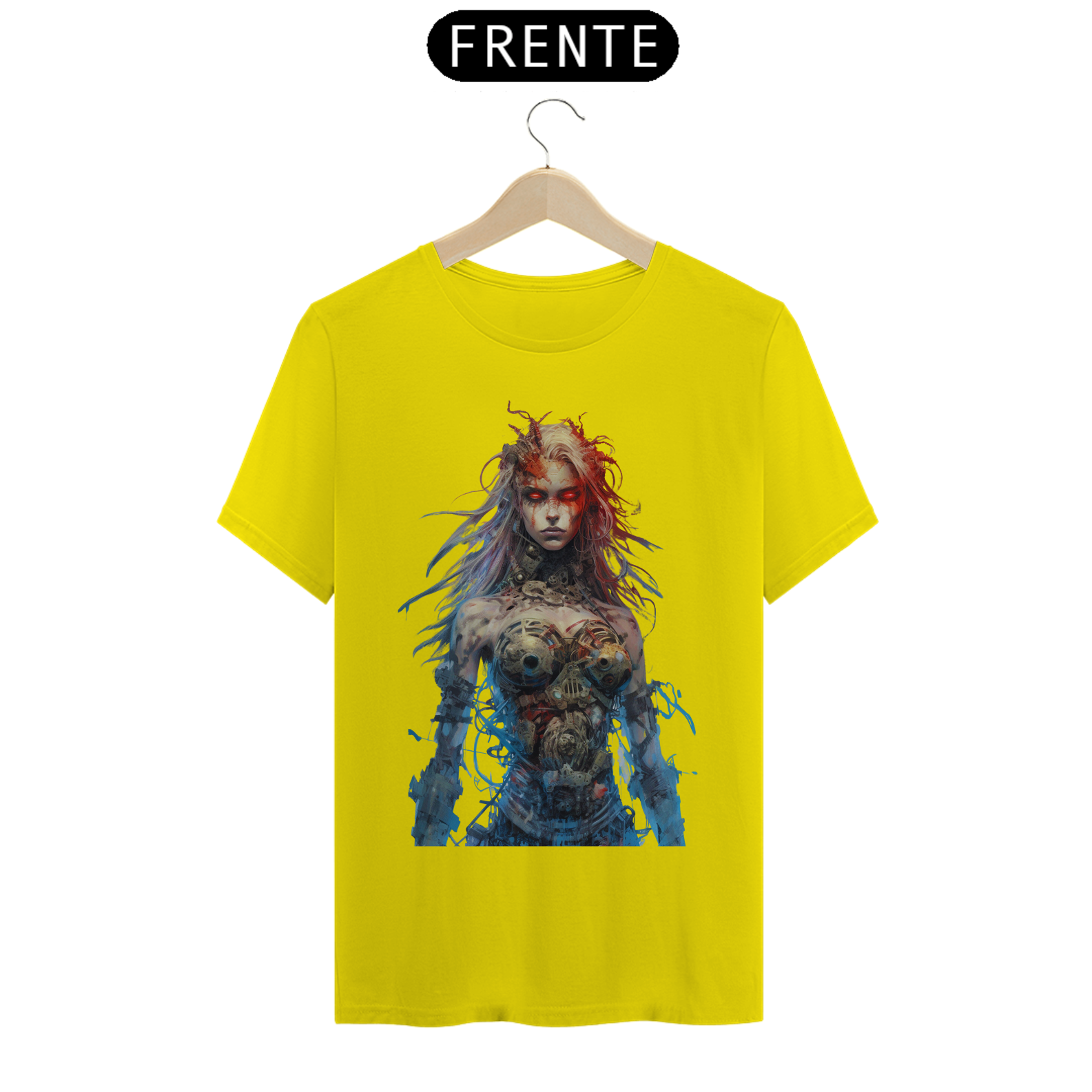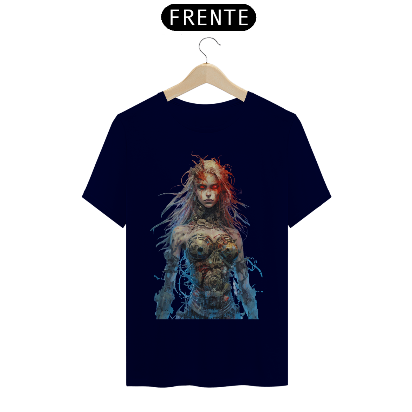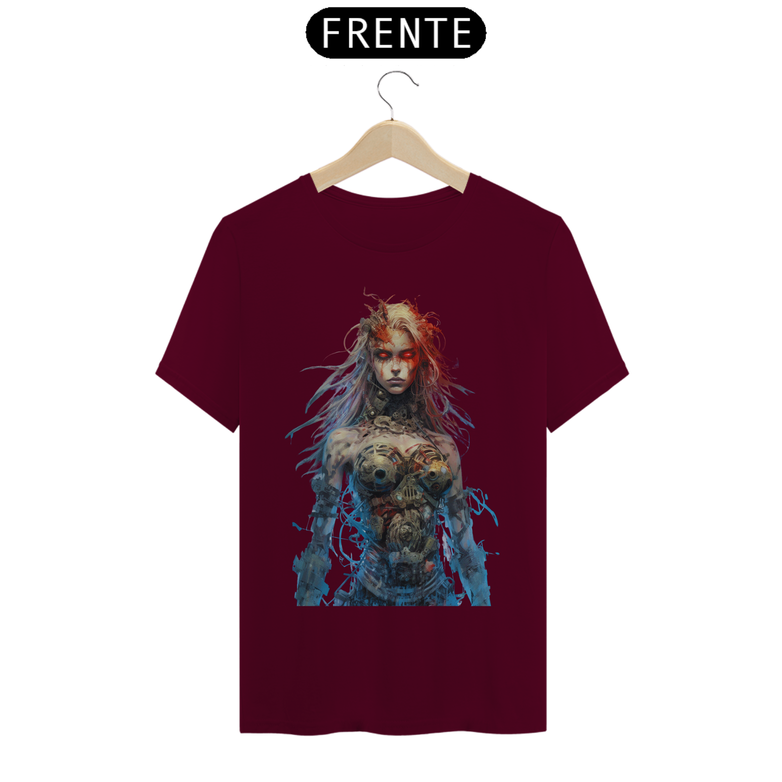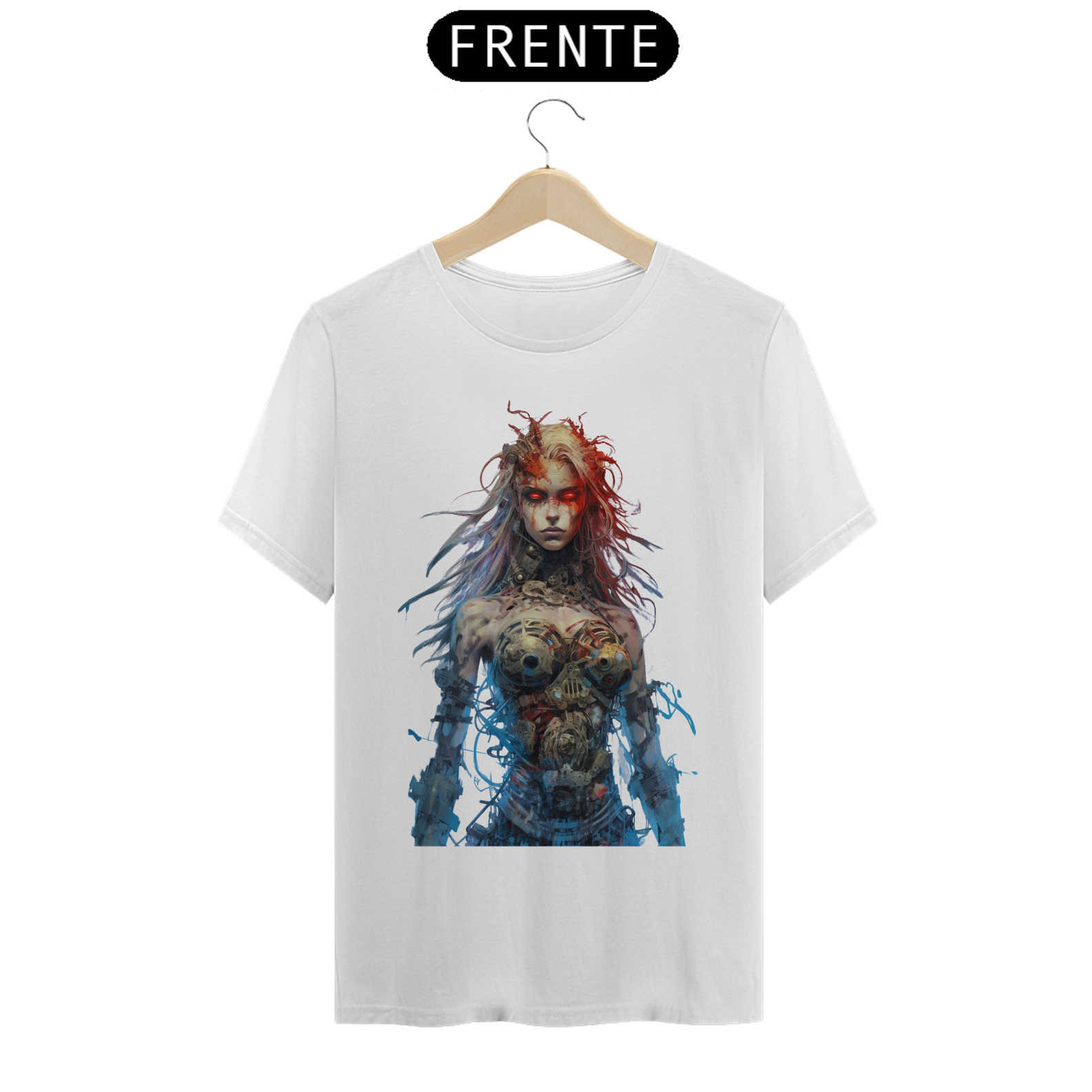 Nesta estampa intrigante, uma figura misteriosa emerge do mundo dos avanços tecnológicos. Uma mulher com partes cibernéticas se destaca, seus olhos brilhantes de um vermelho intenso refletem uma energia ardente. Fios soltos e conectores expostos em seu corpo cibernético adicionam um toque de caos e rebeldia à sua aparência. Ela personifica a fusão entre a tecnologia e a humanidade, transmitindo uma sensação de poder e determinação. Seu olhar penetrante revela uma mistura de mistério e ousadia, enquanto seu semblante transmite a força que ela incorpora. Essa estampa desperta a curiosidade e a imaginação, convidando os espectadores a explorar as fronteiras entre o homem e a máquina, entre a fragilidade e a inquebrável determinação.