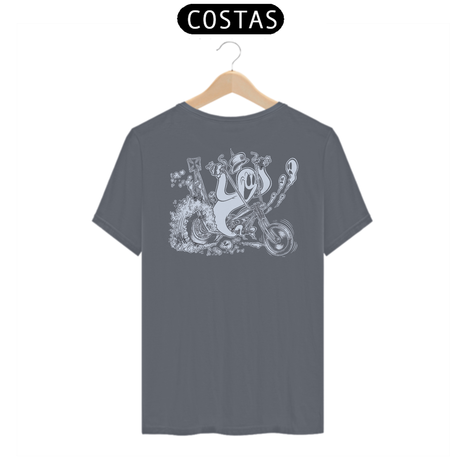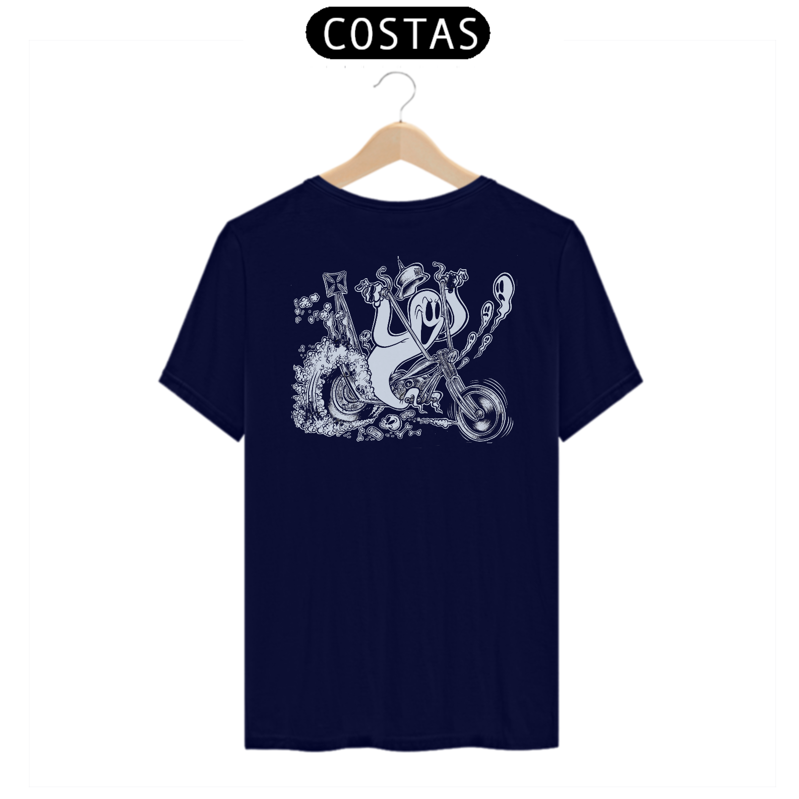 Prepare-se para uma viagem sobrenatural com nosso fantasma em alta velocidade! Esta estampa traz um espectro destemido em sua moto, desafiando as leis da física e a velocidade da luz. Com um toque retrô dos anos 40, esta é uma corrida além da vida e da morte. Vista esta camiseta e junte-se à aventura, onde o paranormal encontra a adrenalina das pistas.