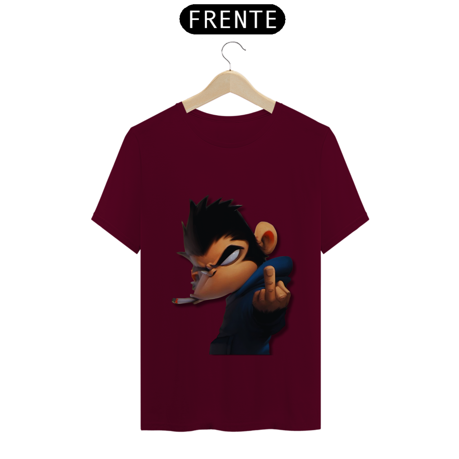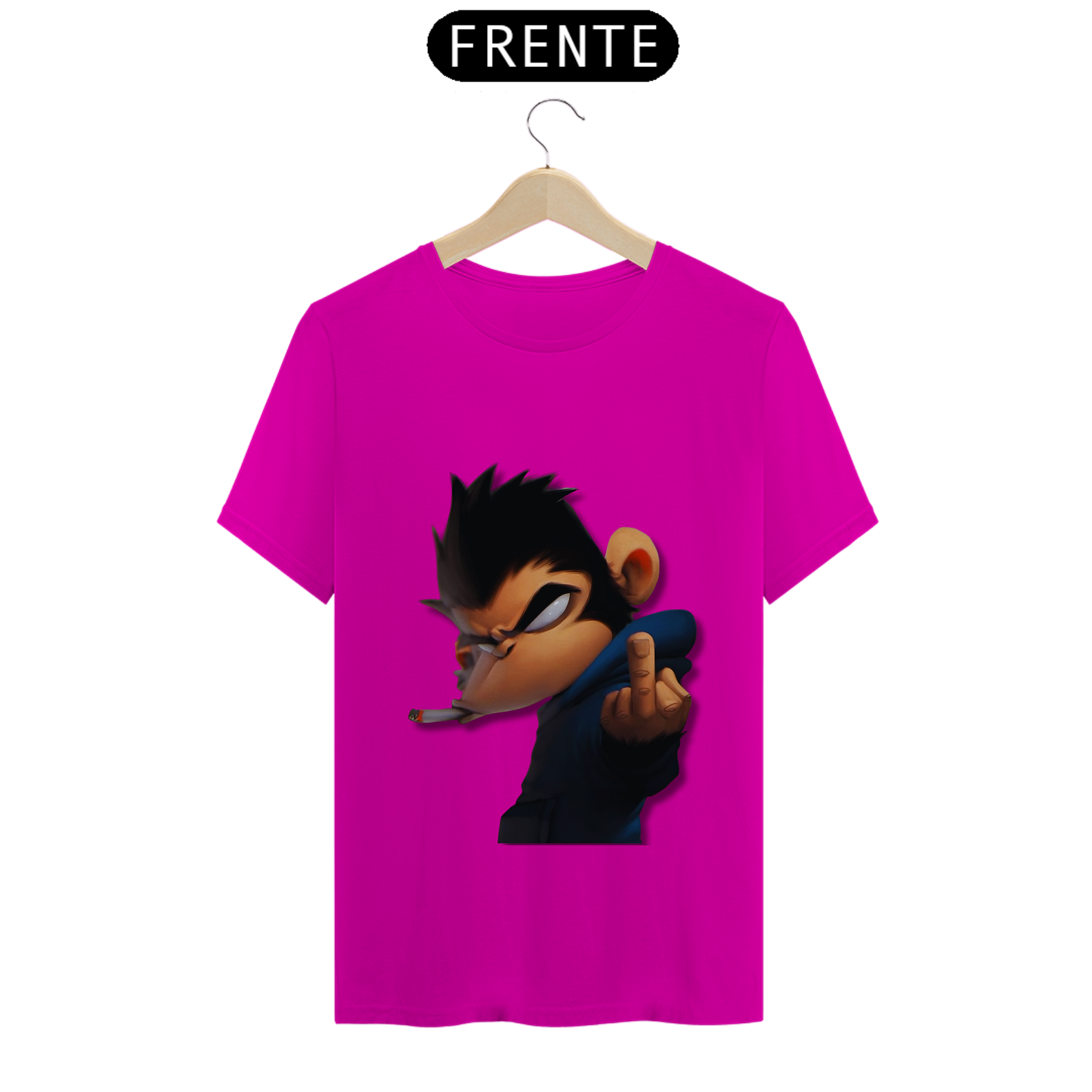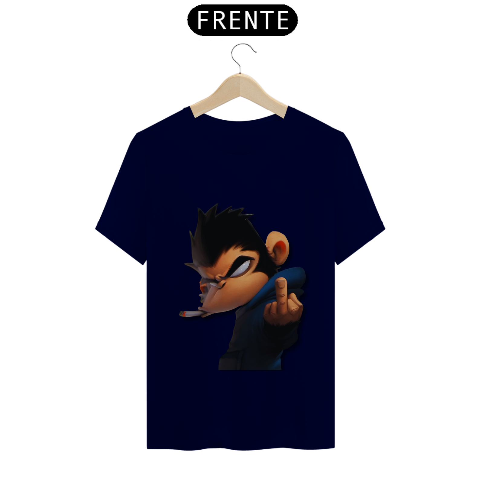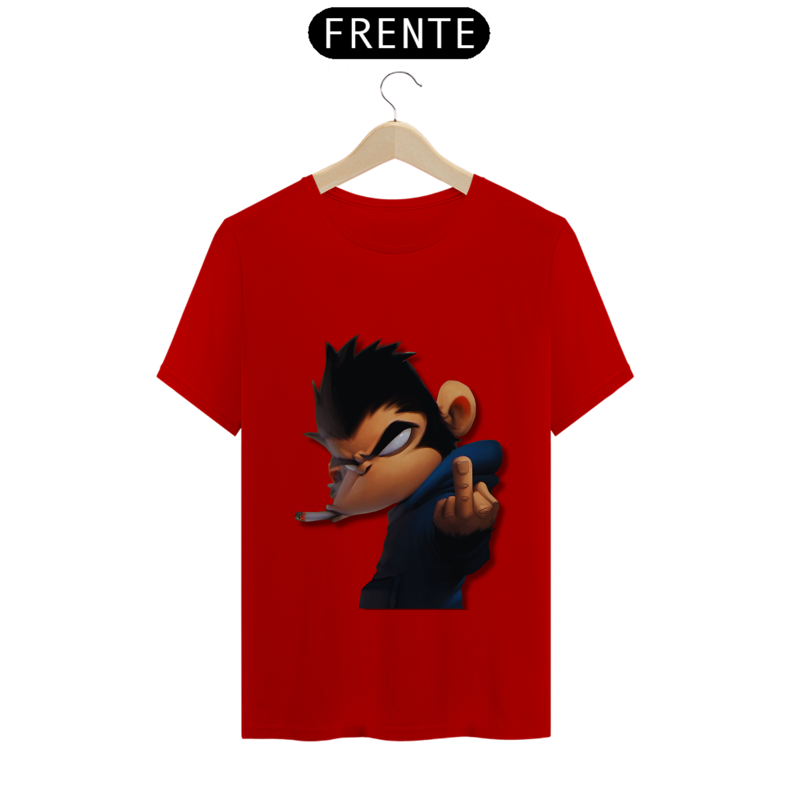 Olha só essa belezura! Um macaco da pesada, todo largado, com um olhar que diz 'não tô nem aí'. Ele tá lá, com um cigarro na boca e mandando um 'se f...'. É atitude na veia, meu camarada! Se você não tem medo de mostrar sua personalidade forte e irreverente, essa é a estampa certa pra você. Cola nesse estilo ousado e faça todo mundo olhar duas vezes!