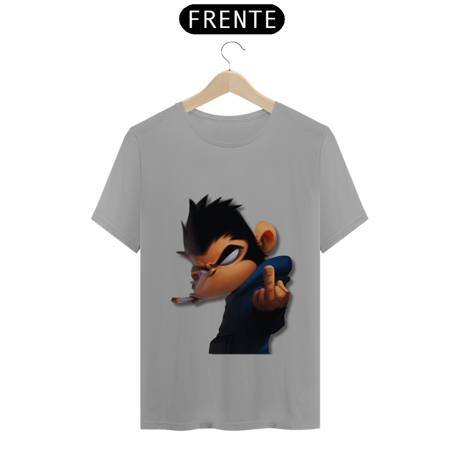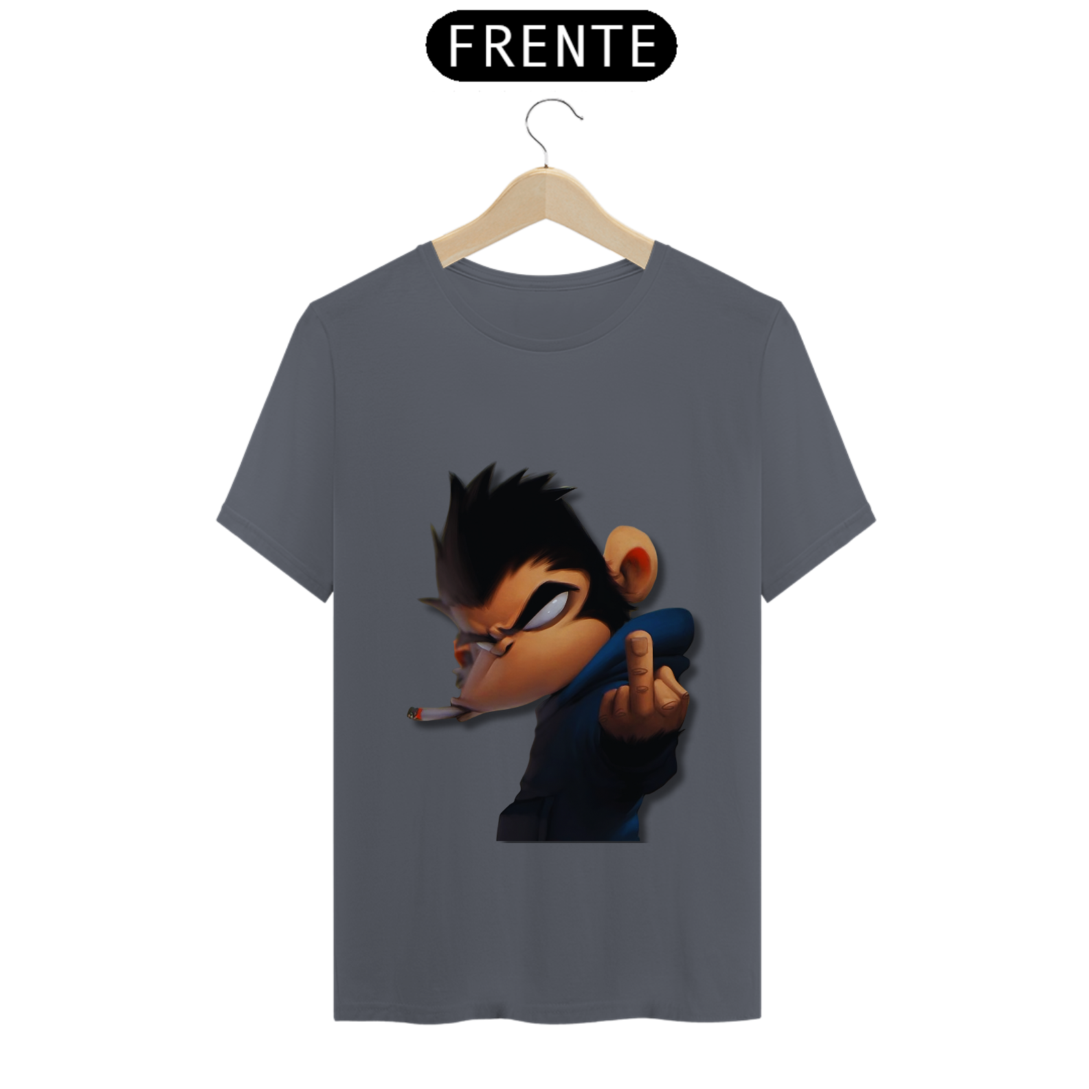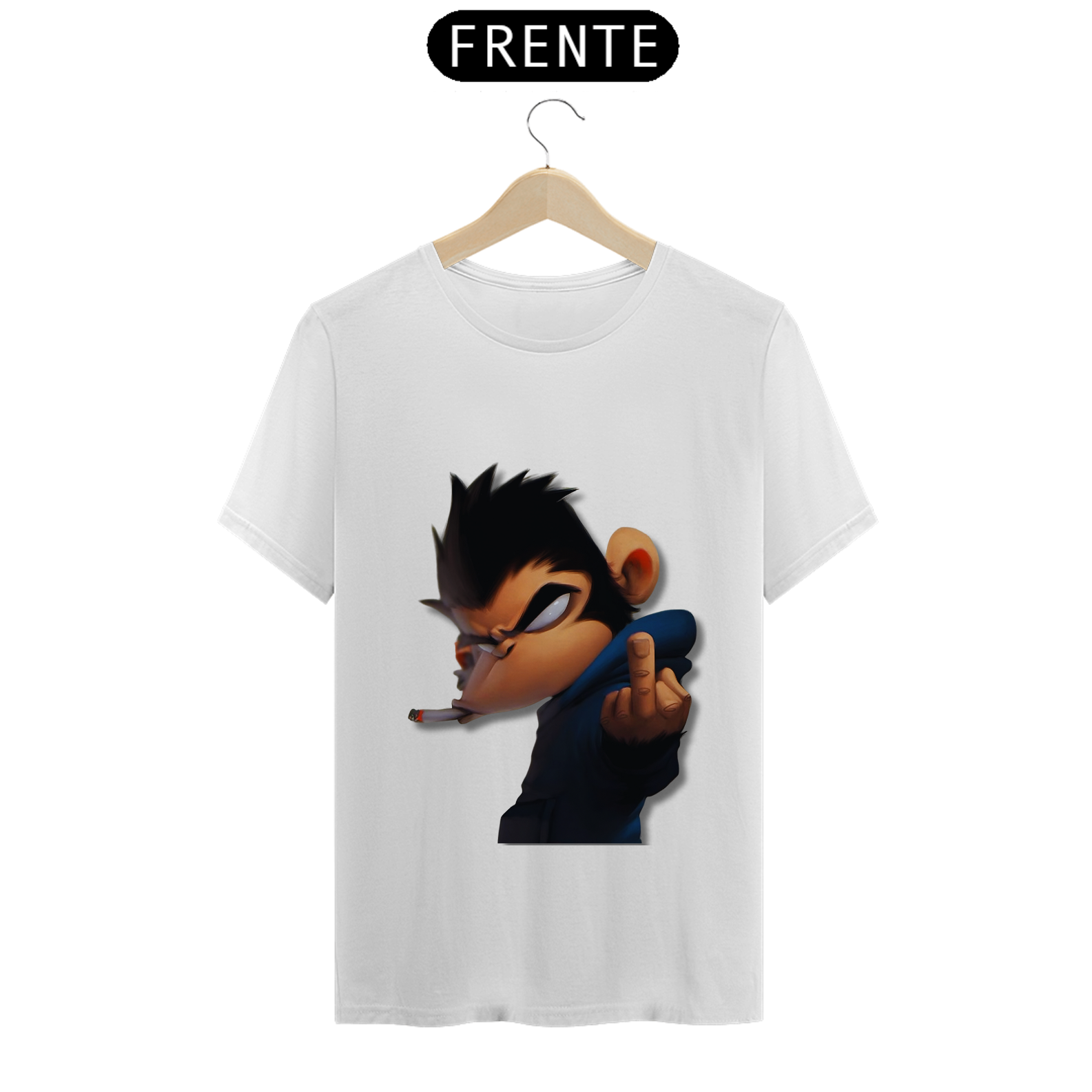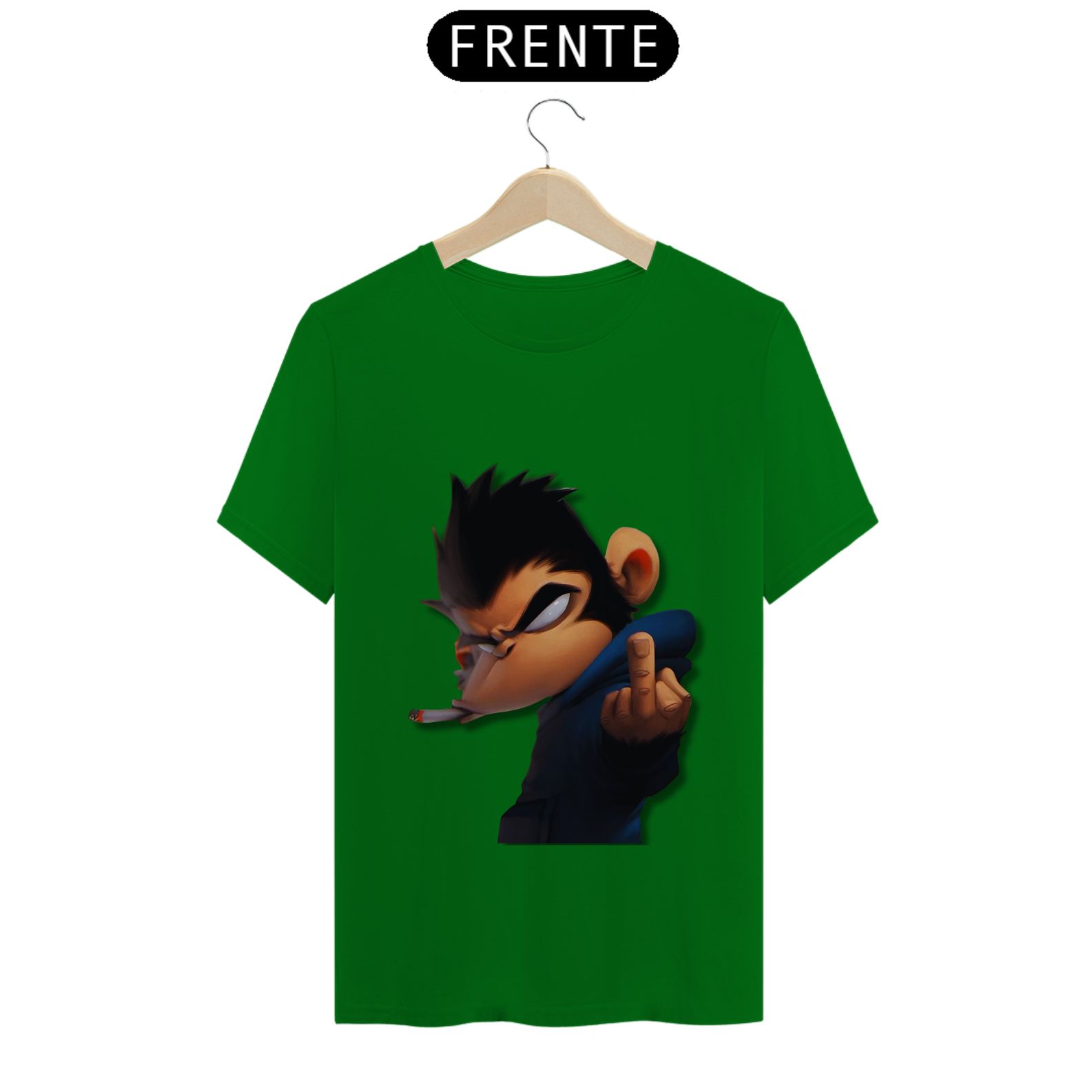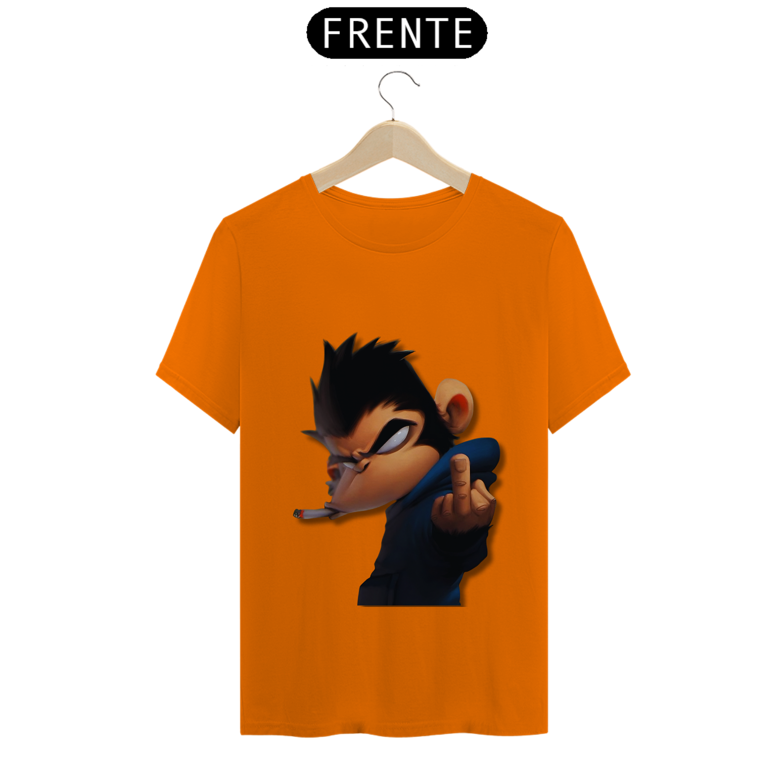 Olha só essa belezura! Um macaco da pesada, todo largado, com um olhar que diz 'não tô nem aí'. Ele tá lá, com um cigarro na boca e mandando um 'se f...'. É atitude na veia, meu camarada! Se você não tem medo de mostrar sua personalidade forte e irreverente, essa é a estampa certa pra você. Cola nesse estilo ousado e faça todo mundo olhar duas vezes!