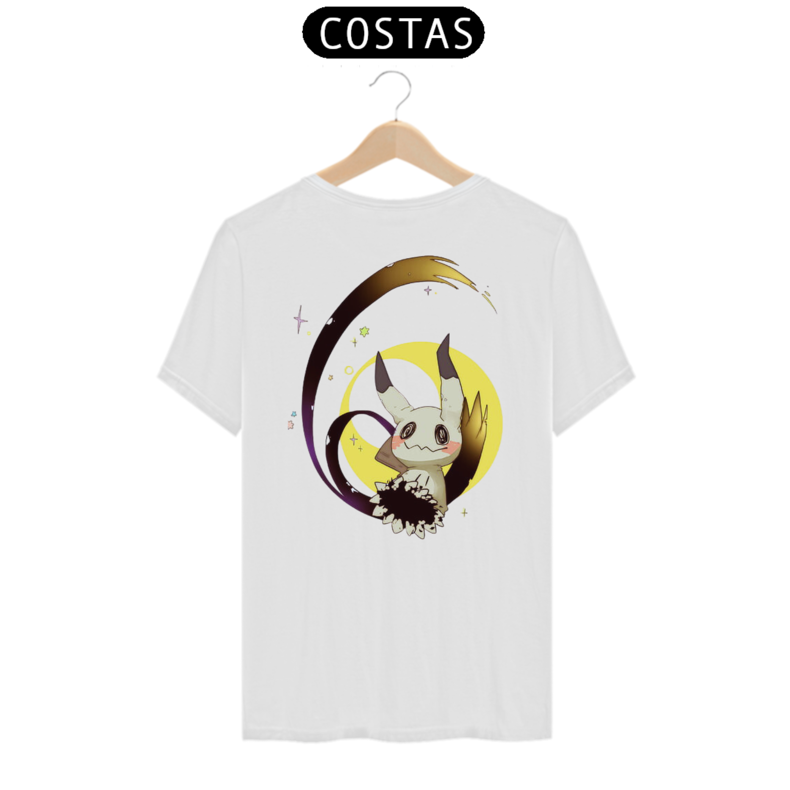 Nessa obra de arte, Mimikyu está representado nas costas da camiseta, em uma pose intrigante. Sua silhueta sombria e enigmática é envolvida por sombras suaves, conferindo um toque de mistério e magia à estampa.