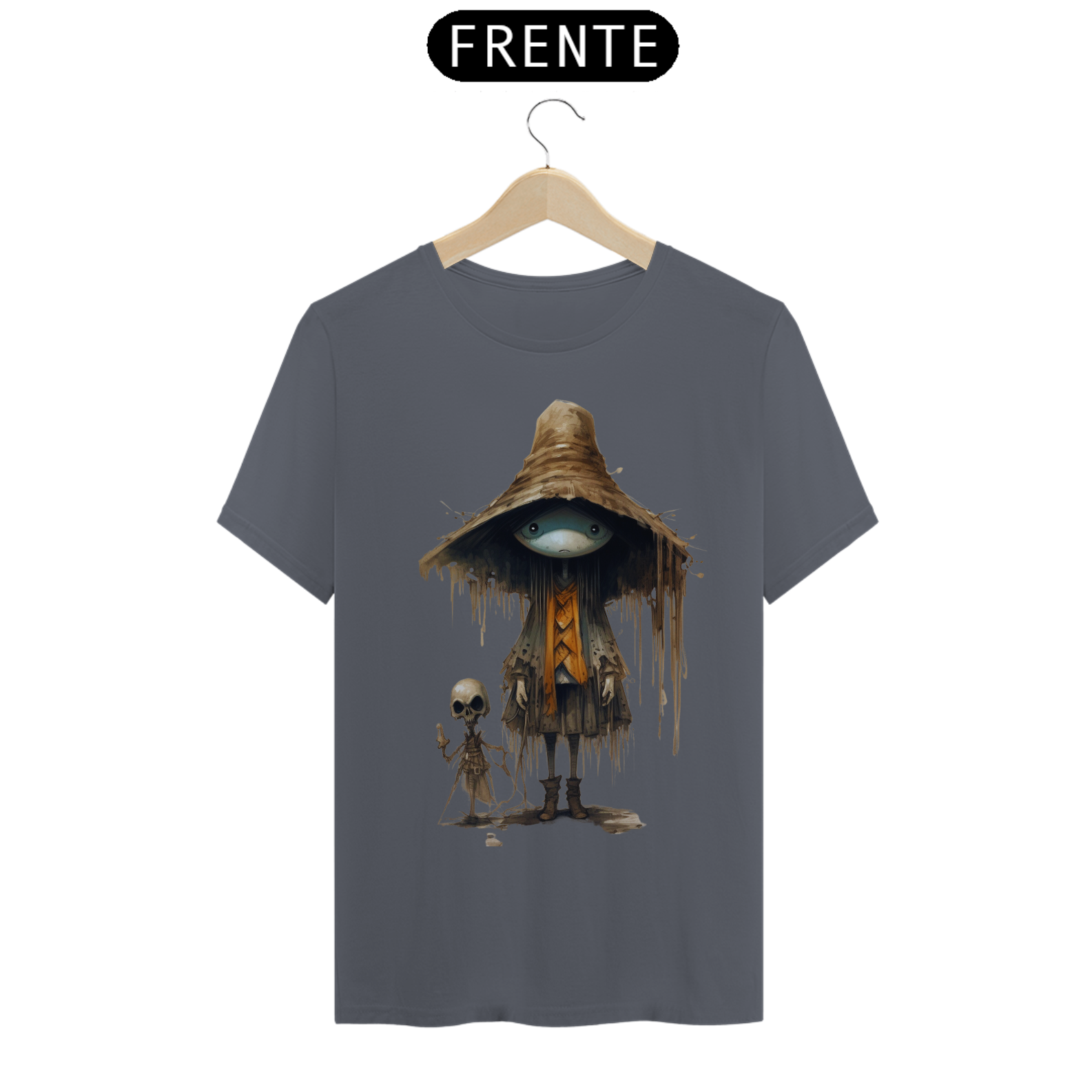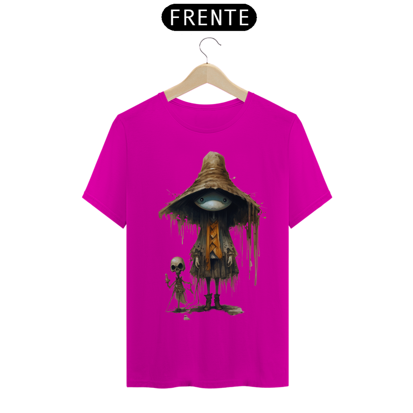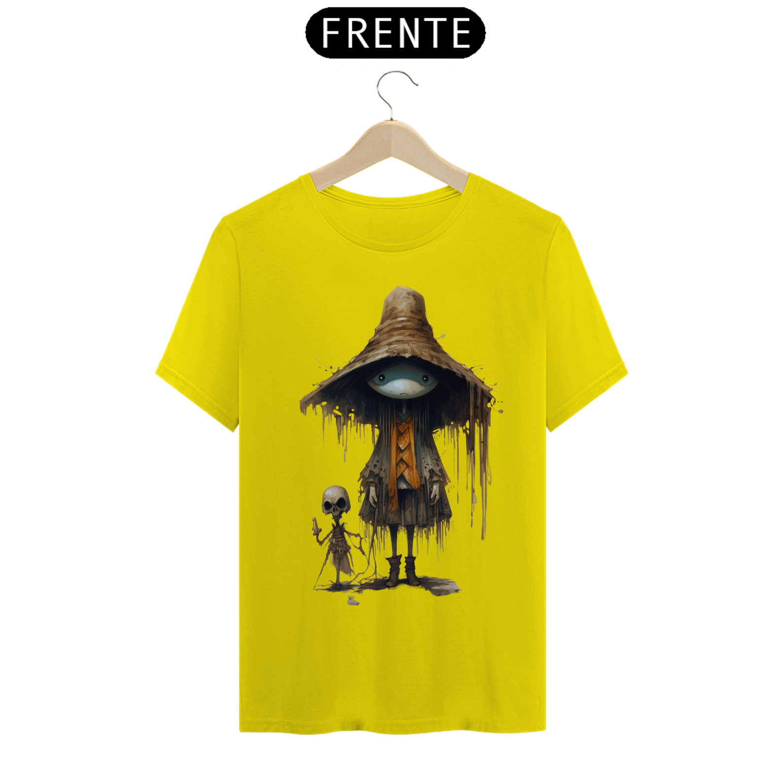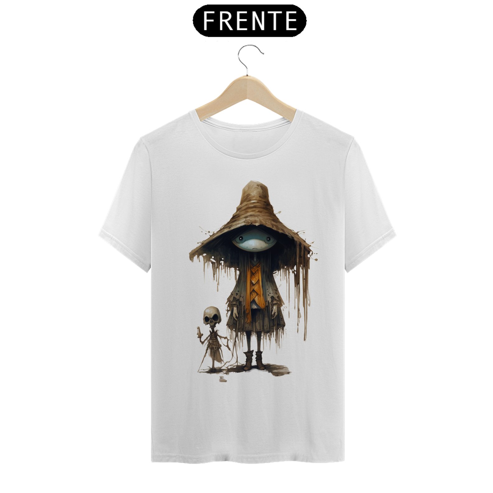 Para essa estampa encantadora e misteriosa, sugerimos o nome "Feiticeiro dos Campos". O "Feiticeiro dos Campos" é um ser fascinante que mescla elementos de um espantalho e  com características de um gafanhoto da morte. Suas cores são suaves, lembrando tons de palha e pastéis, proporcionando um contraste único e encantador. Essa figura mágica e enigmática traz consigo a energia da proteção e sabedoria ancestral, além de despertar a imaginação e a conexão com a natureza. Com o "Feiticeiro dos Campos" em sua camiseta, você estará vestindo uma obra de arte que reflete a fusão entre o místico e o bucólico, destacando-se com estilo e originalidade.