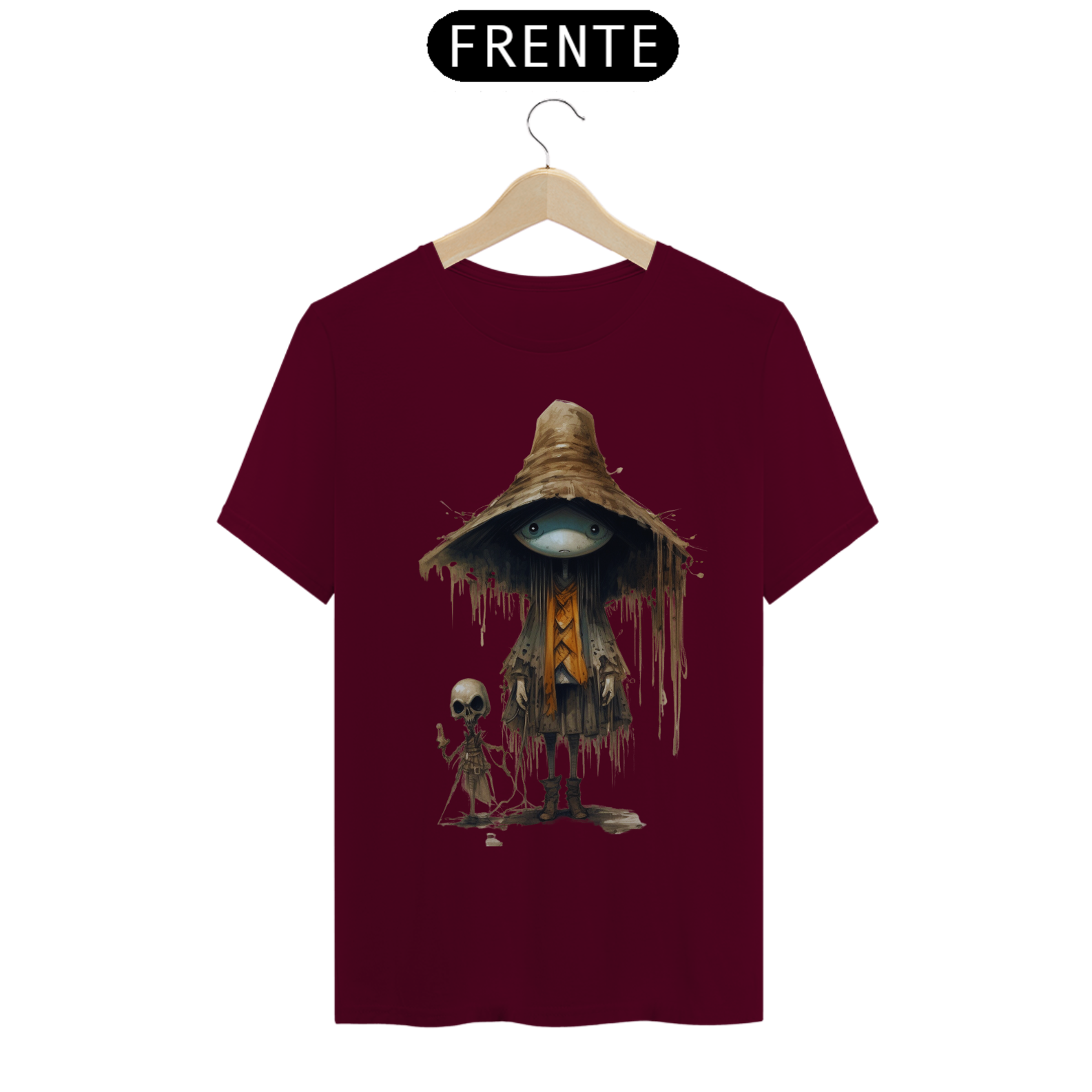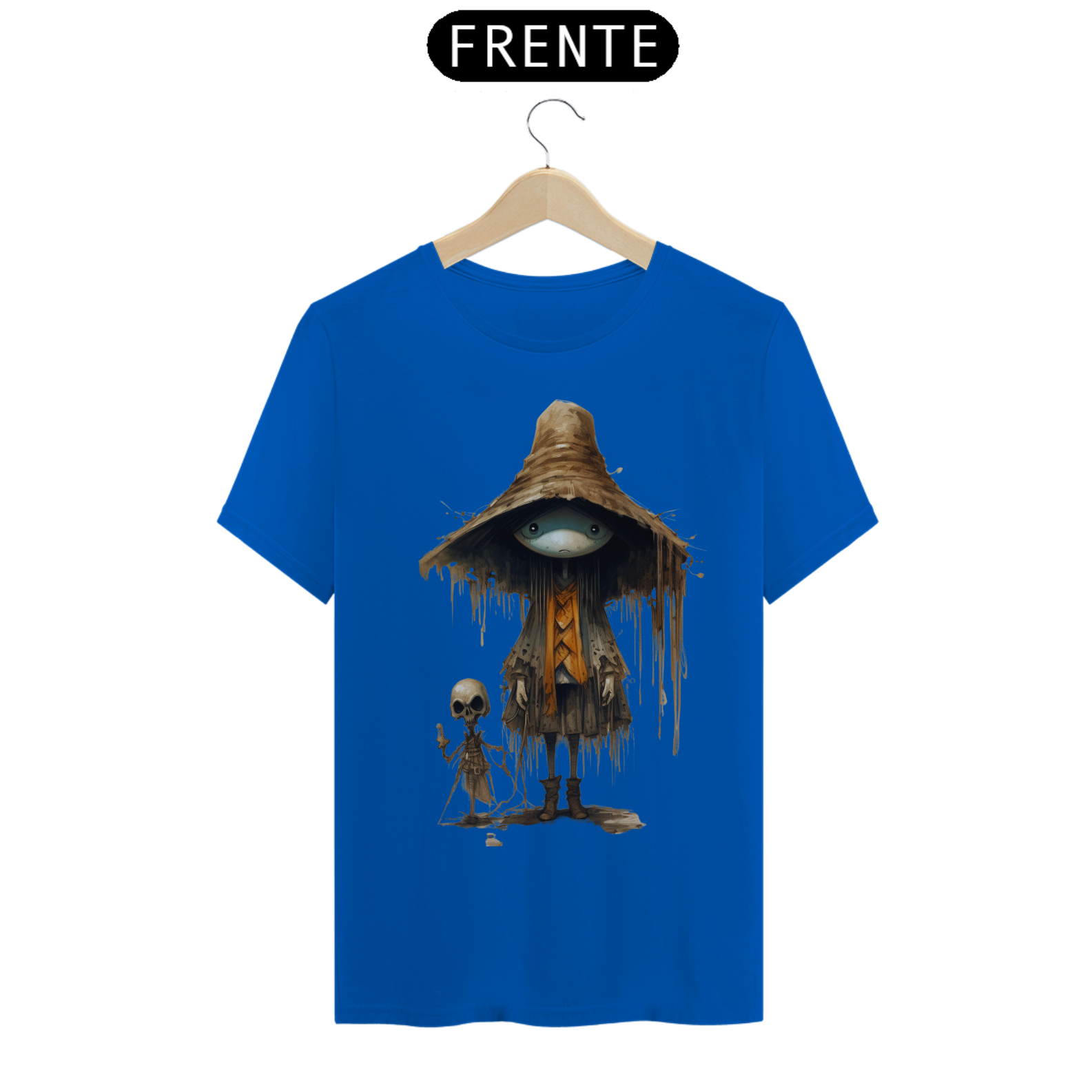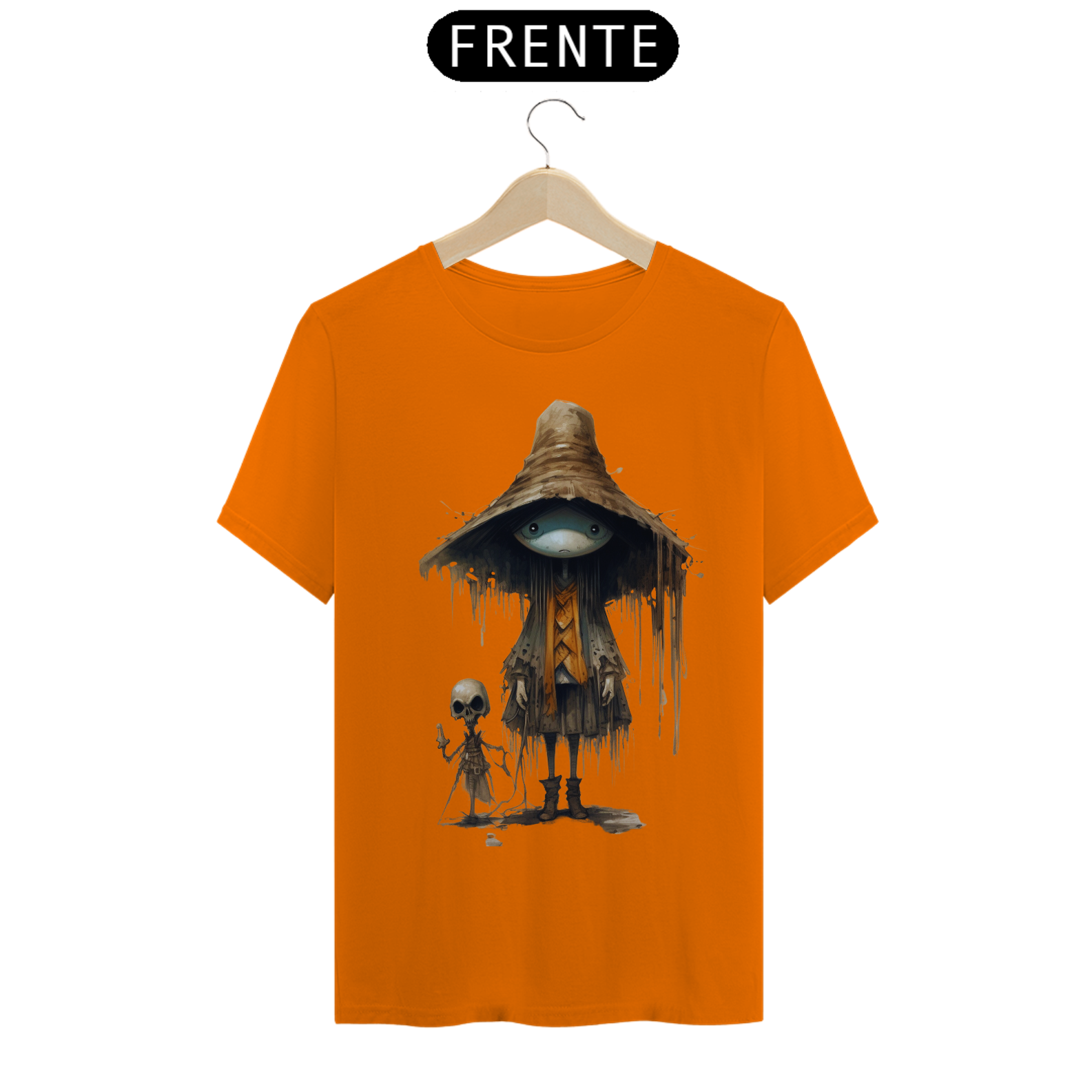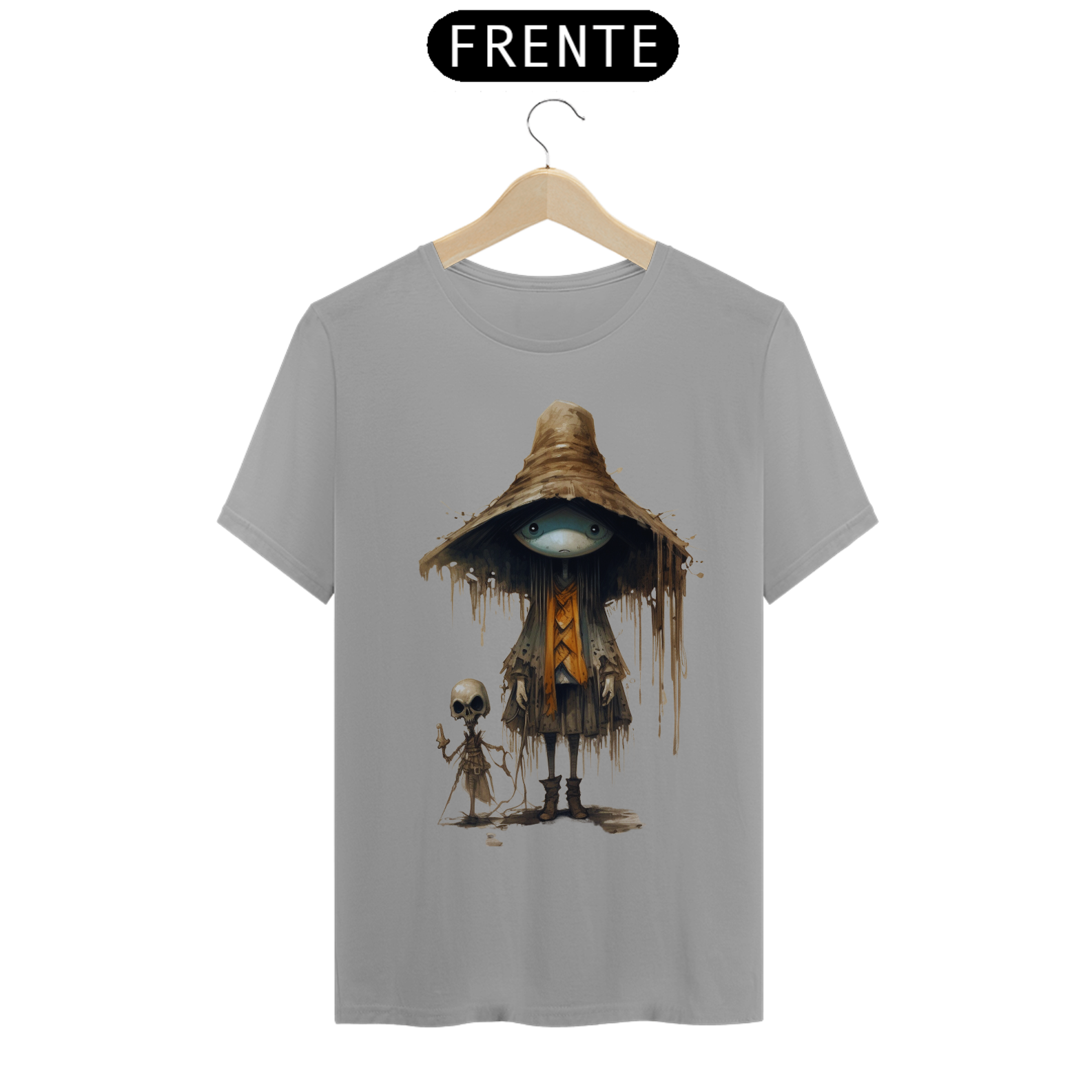 Para essa estampa encantadora e misteriosa, sugerimos o nome "Feiticeiro dos Campos". O "Feiticeiro dos Campos" é um ser fascinante que mescla elementos de um espantalho e  com características de um gafanhoto da morte. Suas cores são suaves, lembrando tons de palha e pastéis, proporcionando um contraste único e encantador. Essa figura mágica e enigmática traz consigo a energia da proteção e sabedoria ancestral, além de despertar a imaginação e a conexão com a natureza. Com o "Feiticeiro dos Campos" em sua camiseta, você estará vestindo uma obra de arte que reflete a fusão entre o místico e o bucólico, destacando-se com estilo e originalidade.