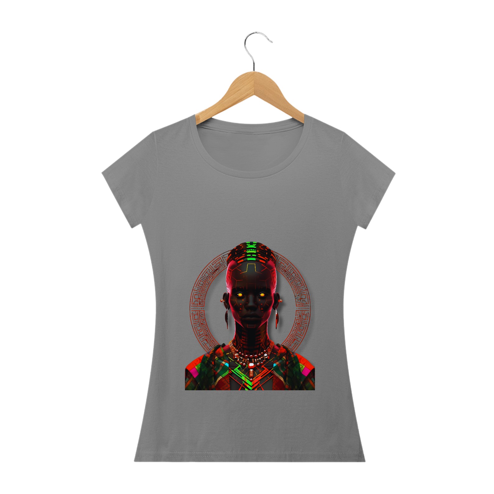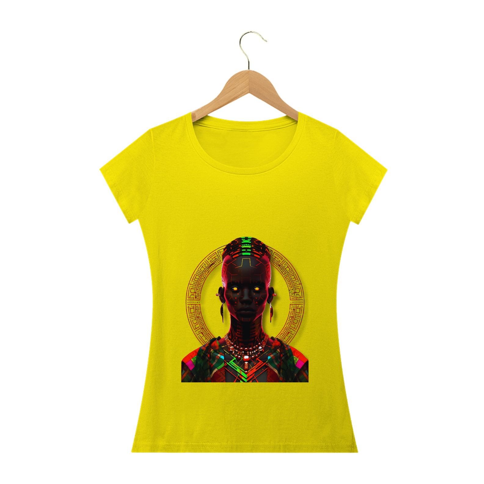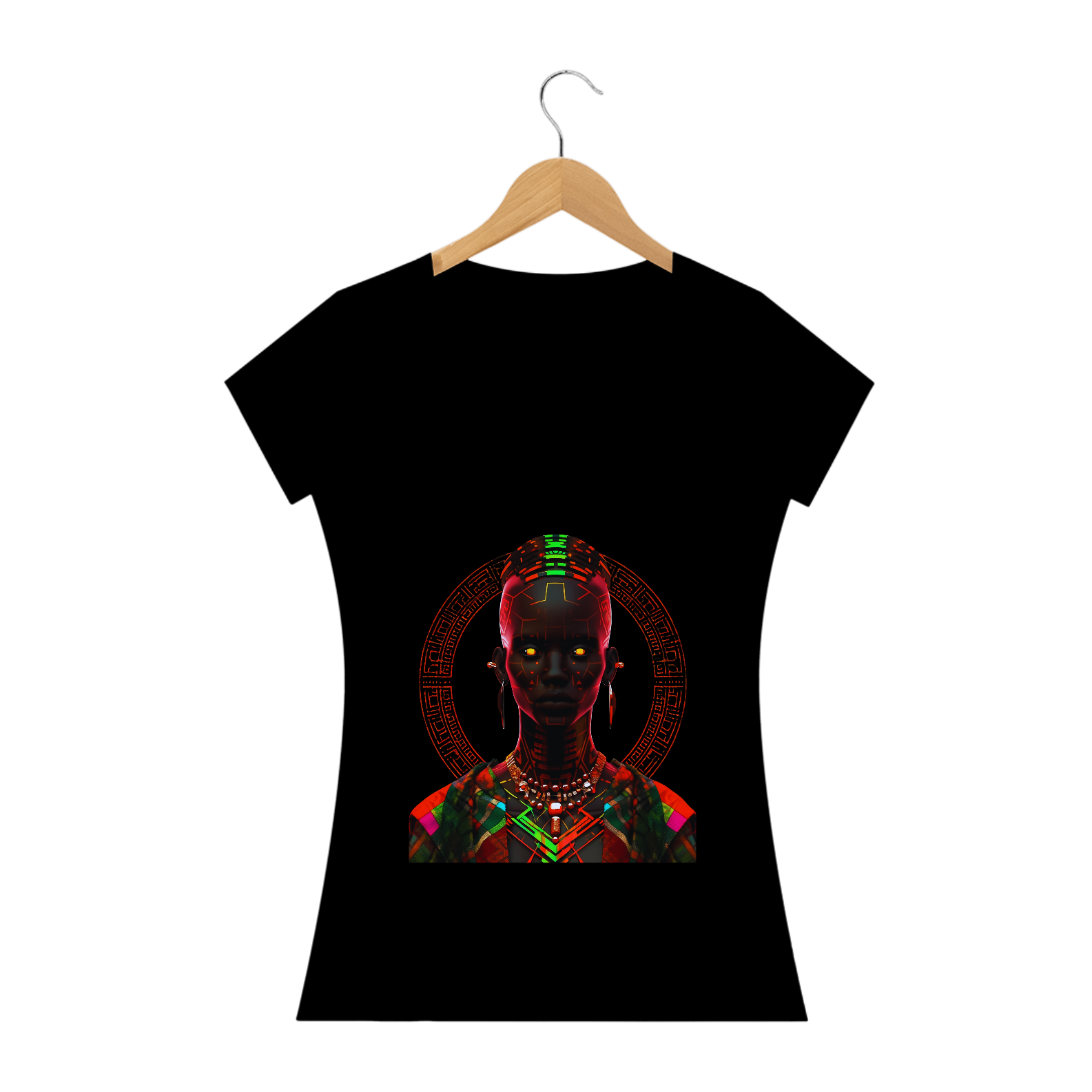 Esta estampa traz consigo a radiante beleza da cultura africana em um estilo único e vibrante. Inspirada na figura de uma mulher africana, ela combina padrões de neon luminosos, trajes detalhados e um jogo de contrastes entre luz e sombra. Remetendo ao rico legado do Império Kushan e à arte do vitral, esta estampa proporciona uma experiência visual cativante. Cada detalhe meticulosamente trabalhado resulta em uma imagem em alta definição que transmite a essência da tradição africana de forma sofisticada e contemporânea. Vista essa camiseta e deixe as luzes africanas brilharem em você.