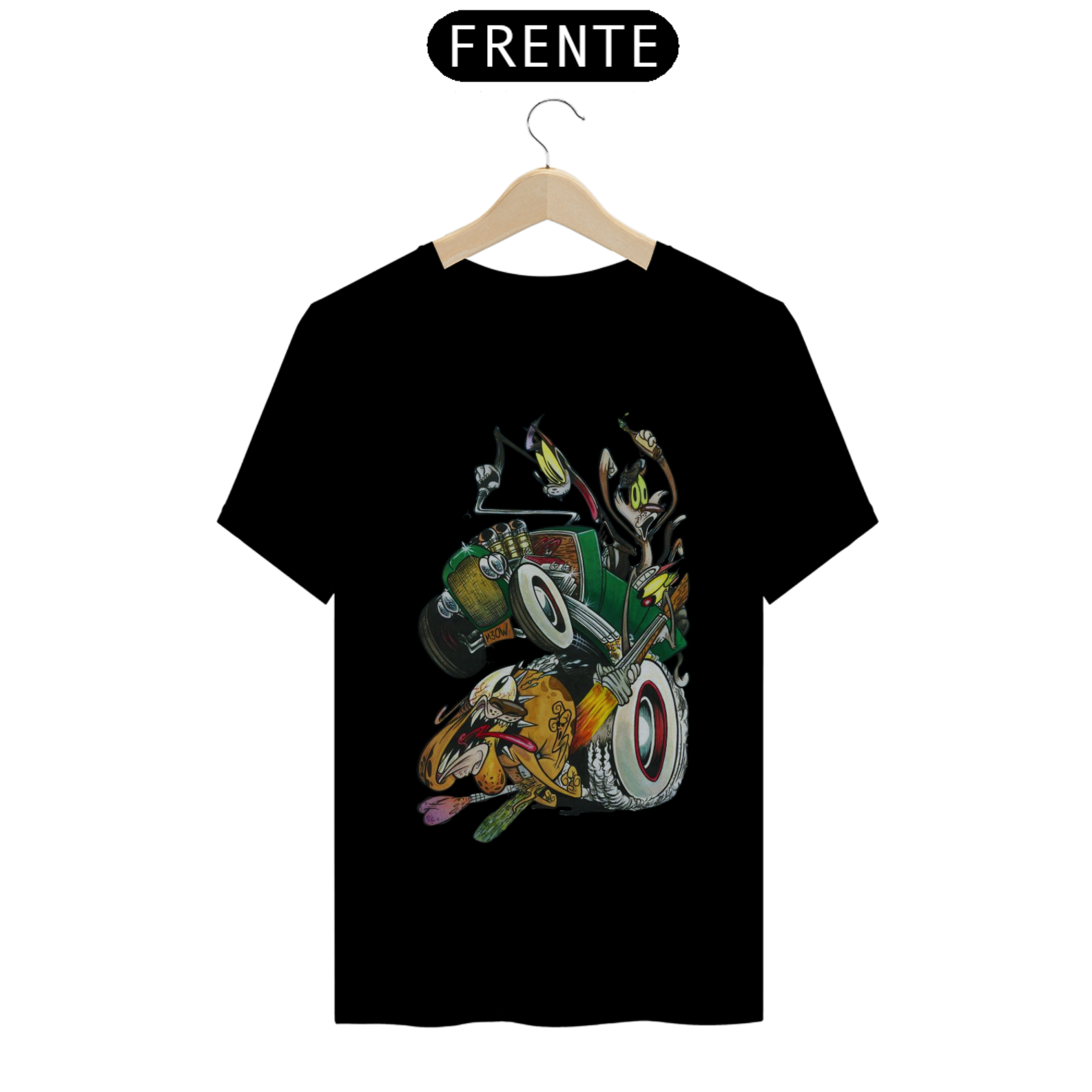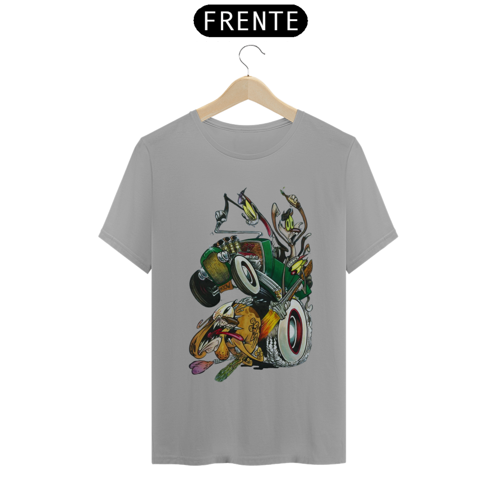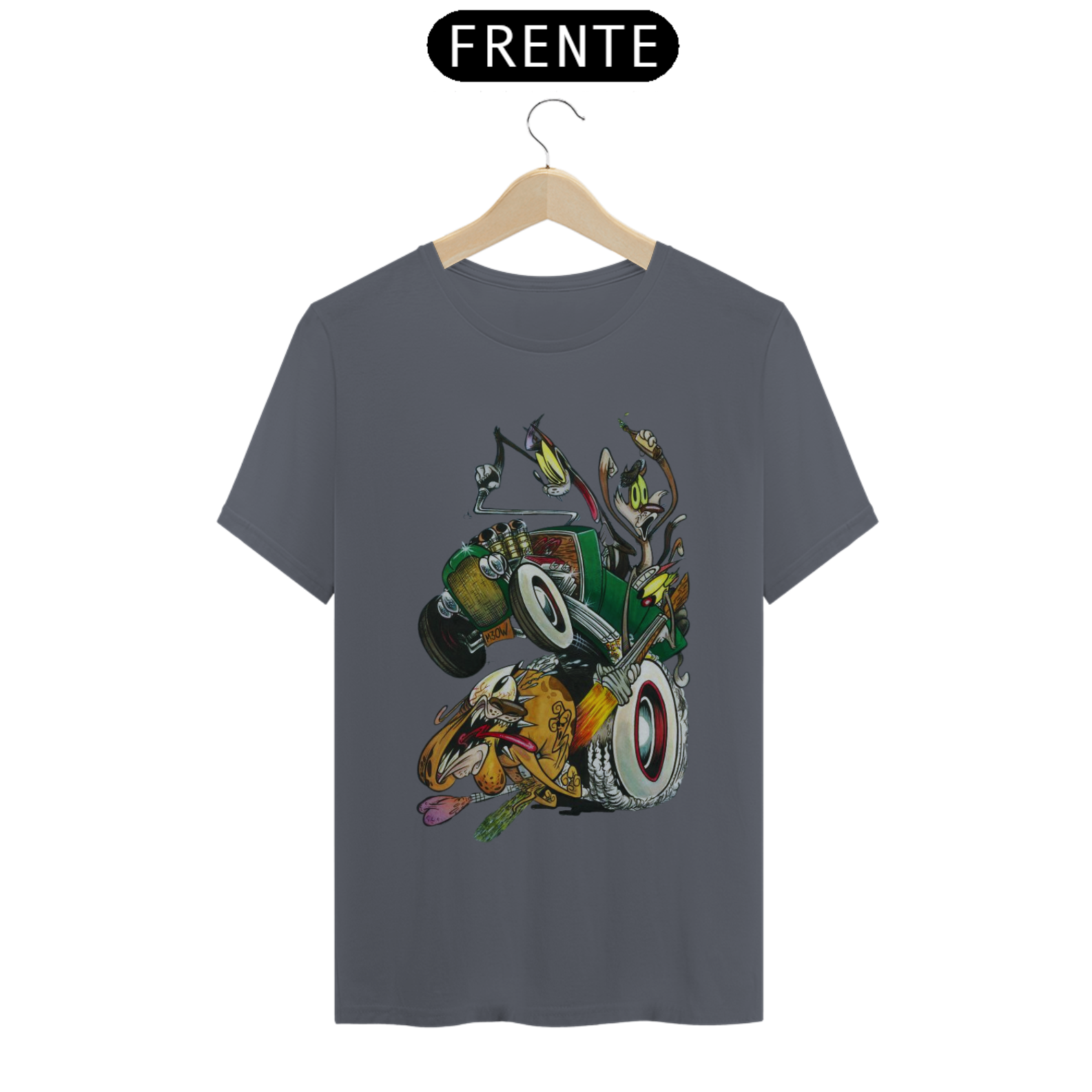 Entre em uma viagem nostálgica para os anos 4 com esta estampa divertida e cheia de ação! Três gatos trapalhões, em cima de um calhambeque clássico, estão em uma perseguição frenética atrás de um cachorro desavisado. A cena é pura comédia, com um dos gatos mirando nos "bagos" para uma castração improvável.