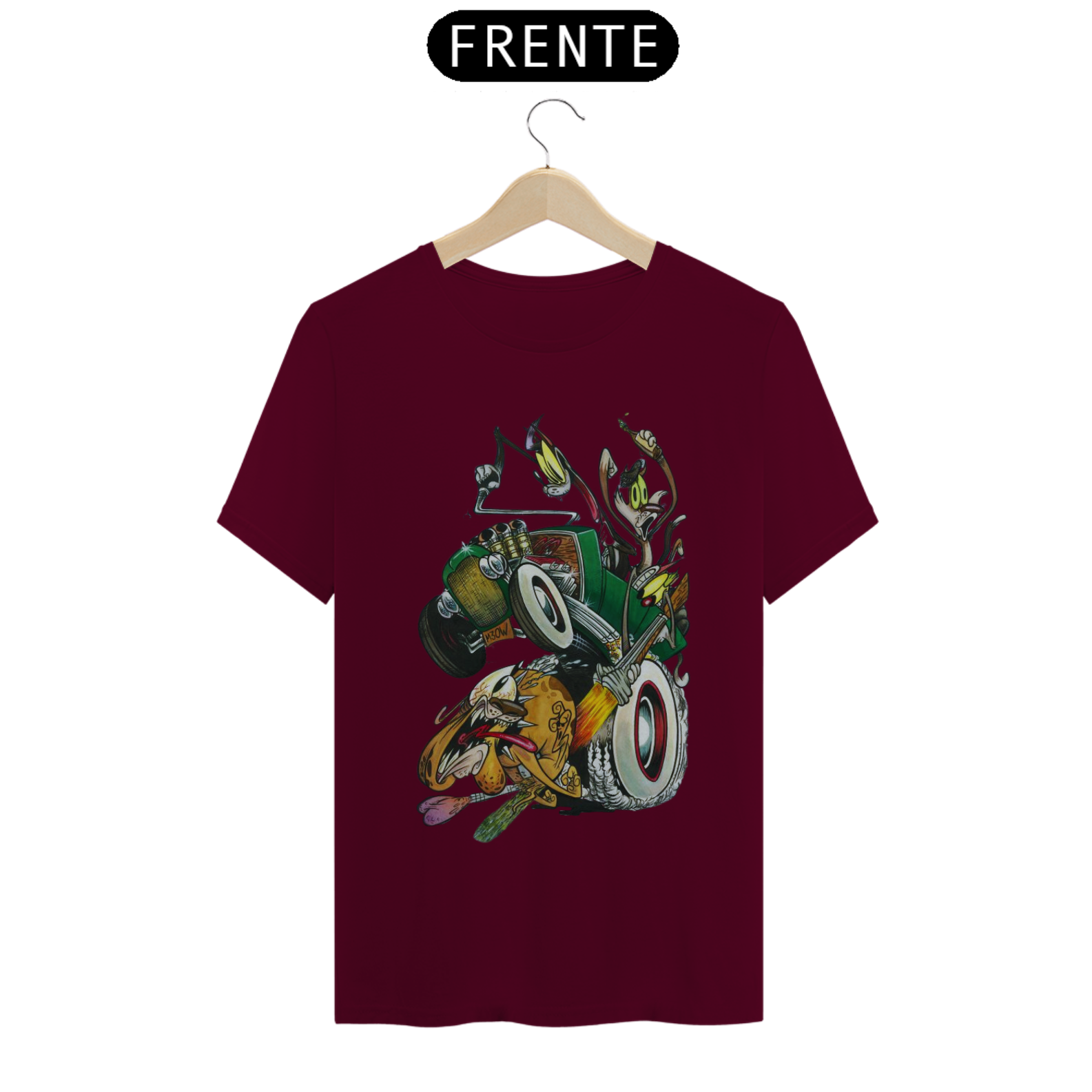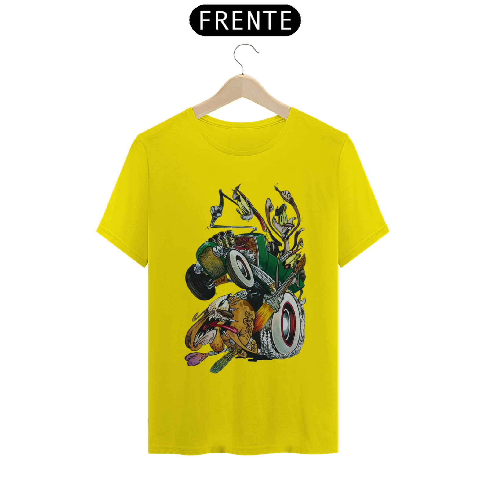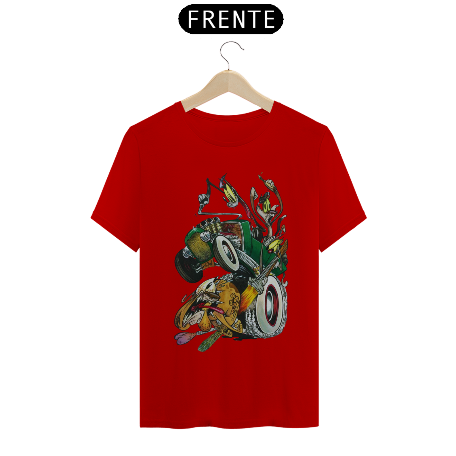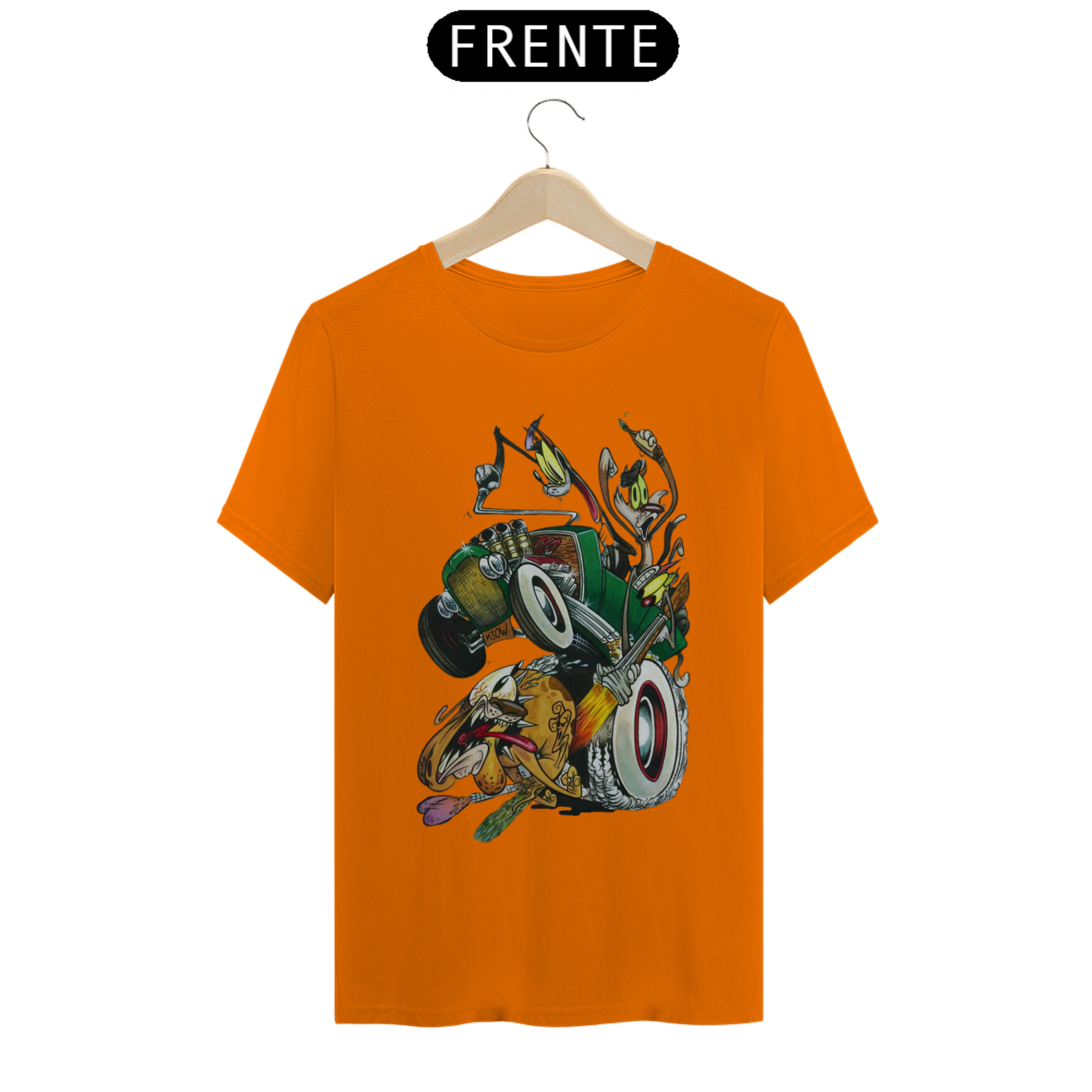 Entre em uma viagem nostálgica para os anos 4 com esta estampa divertida e cheia de ação! Três gatos trapalhões, em cima de um calhambeque clássico, estão em uma perseguição frenética atrás de um cachorro desavisado. A cena é pura comédia, com um dos gatos mirando nos "bagos" para uma castração improvável.