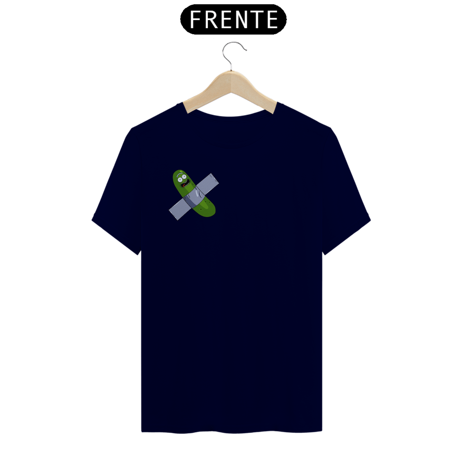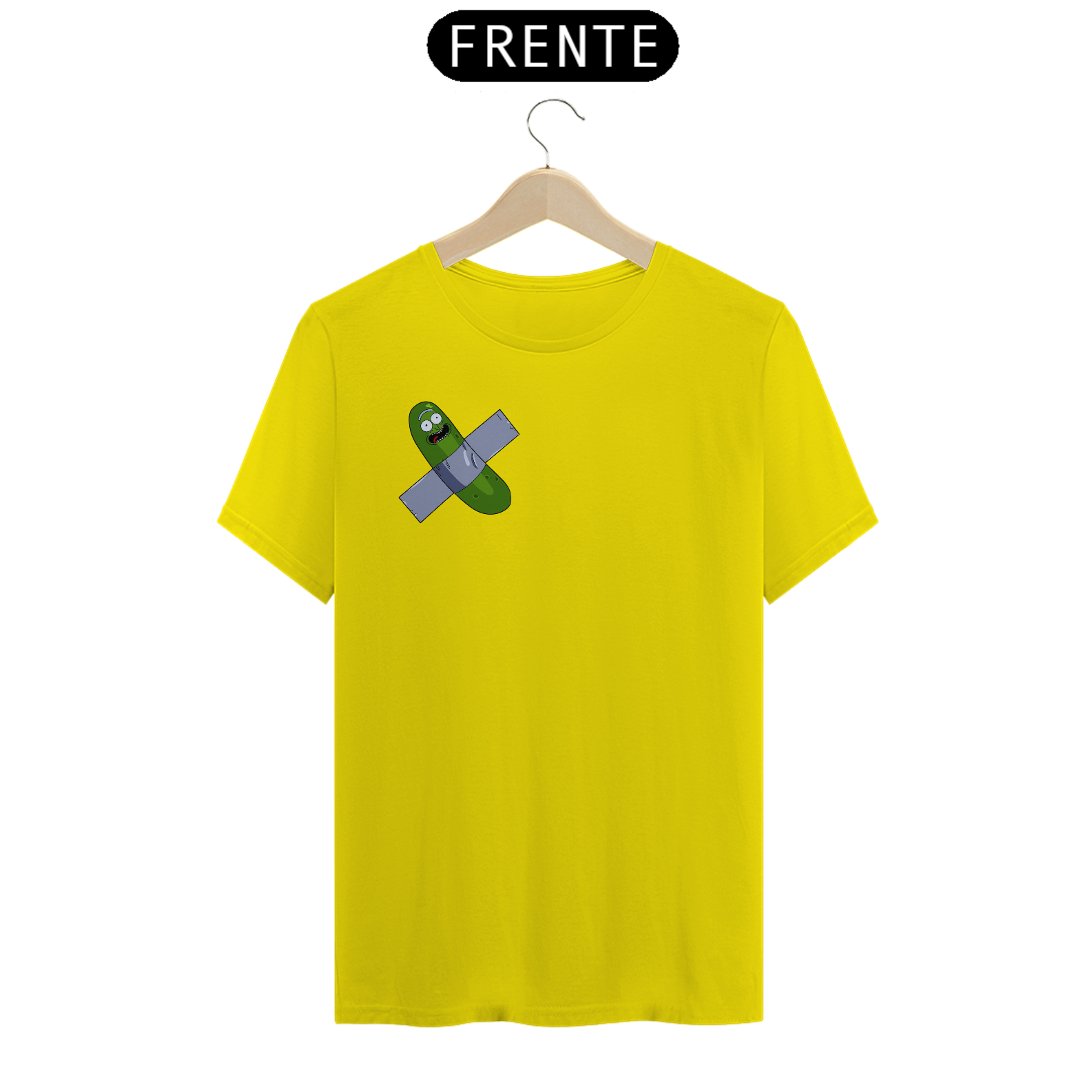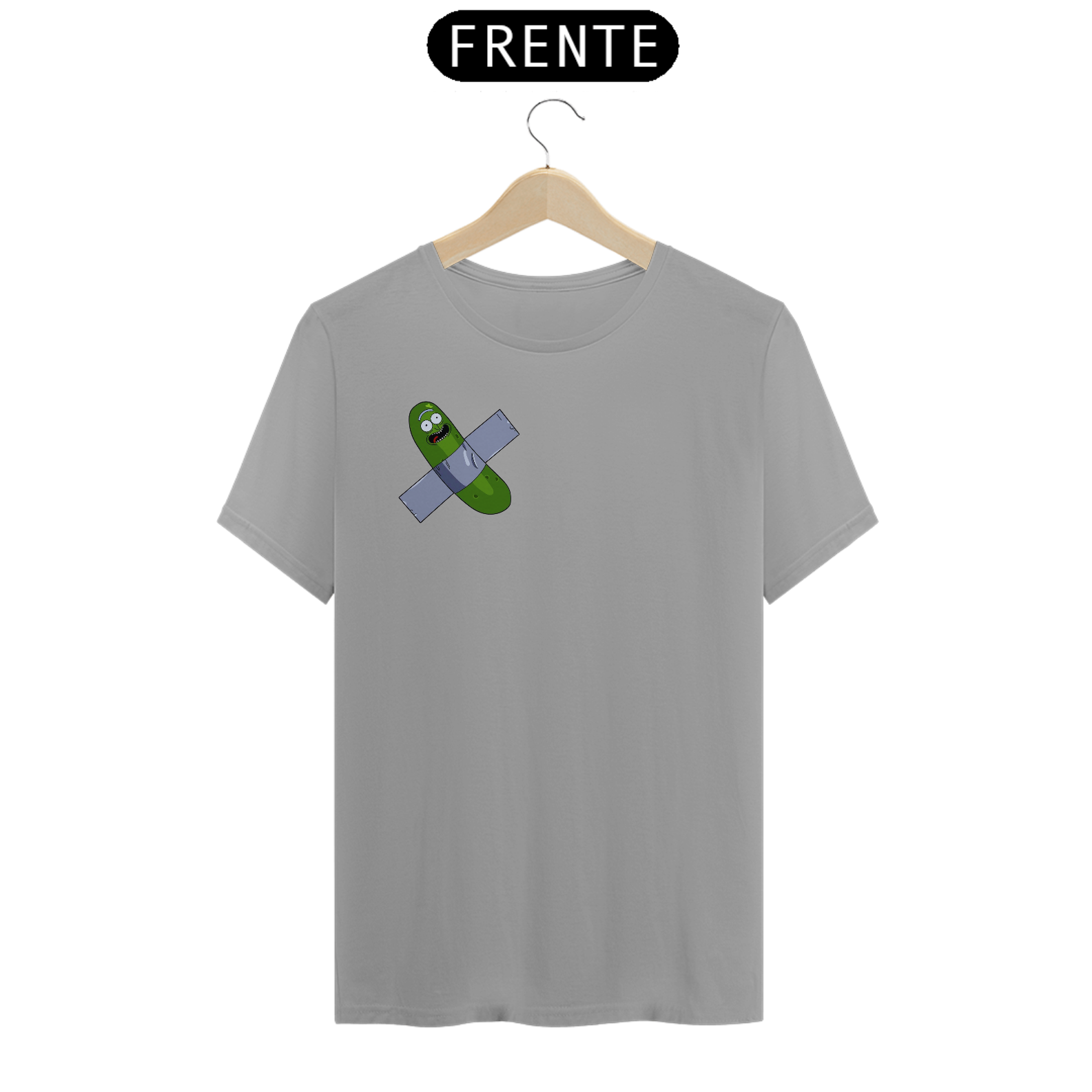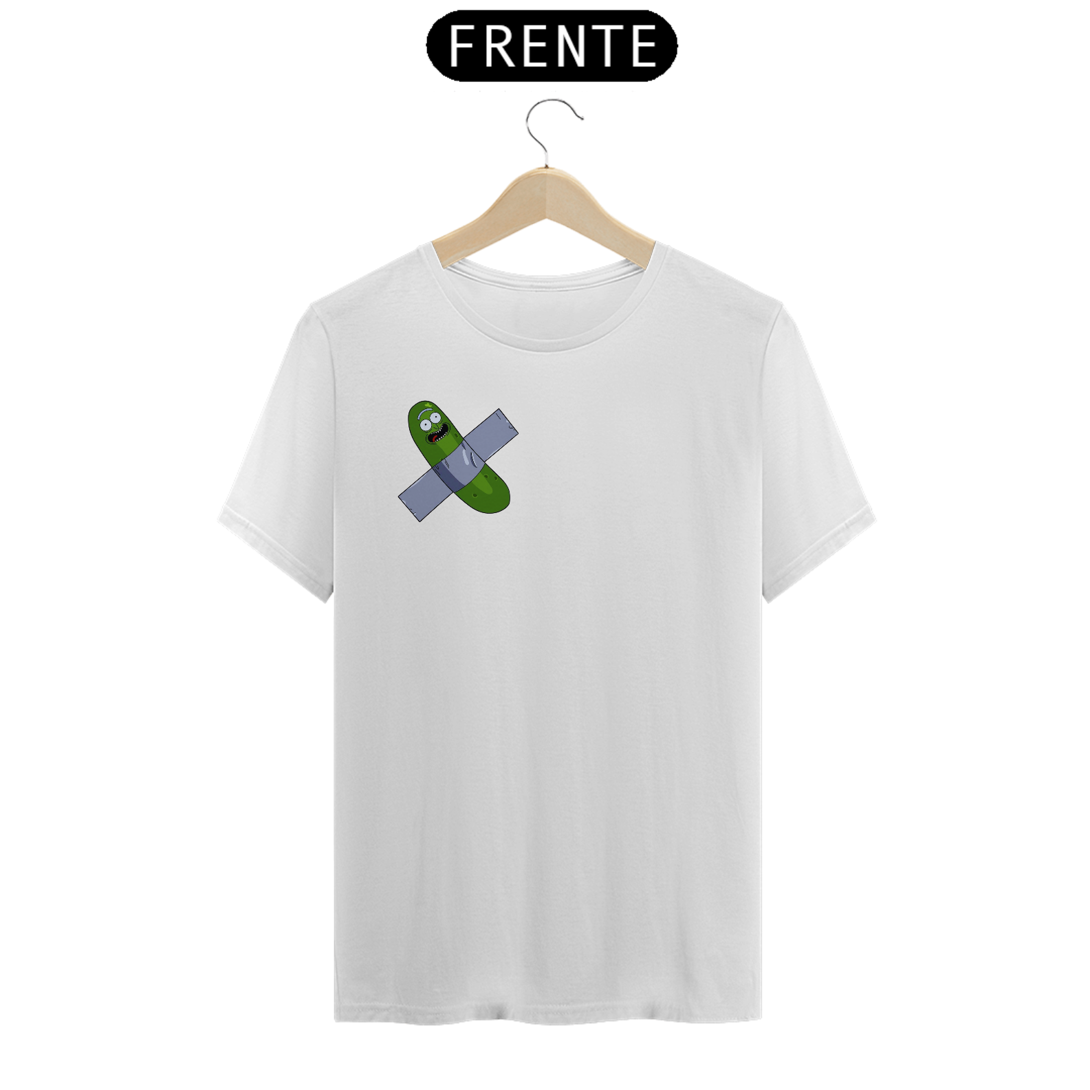 "Inspirado em um dos momentos mais hilariantes da série Rick and Morty, trazemos a você a estampa 'Pickle Rick Artístico'. Nessa cena icônica, Rick se transforma em um pepino e embarca em uma aventura épica. Mas, como uma pitada de ironia e referência à arte contemporânea, adicionamos um toque especial: o pepino está colado com fita adesiva preta, remetendo ao infame incidente em que um estudante sul-coreano comeu a obra de arte 'Comedian', de Maurizio Cattelan. Com essa camiseta, você expressa seu amor pela cultura pop, pelo humor irreverente de Rick and Morty e pelo mundo da arte, de uma forma criativa e divertida. Vista essa camiseta e mostre ao mundo o seu lado artístico e a sua paixão por aventuras surrealistas!"