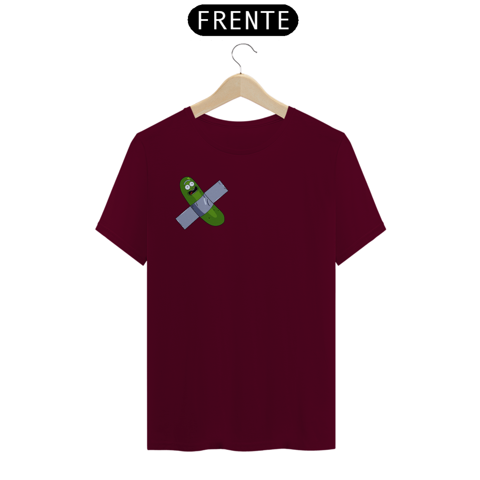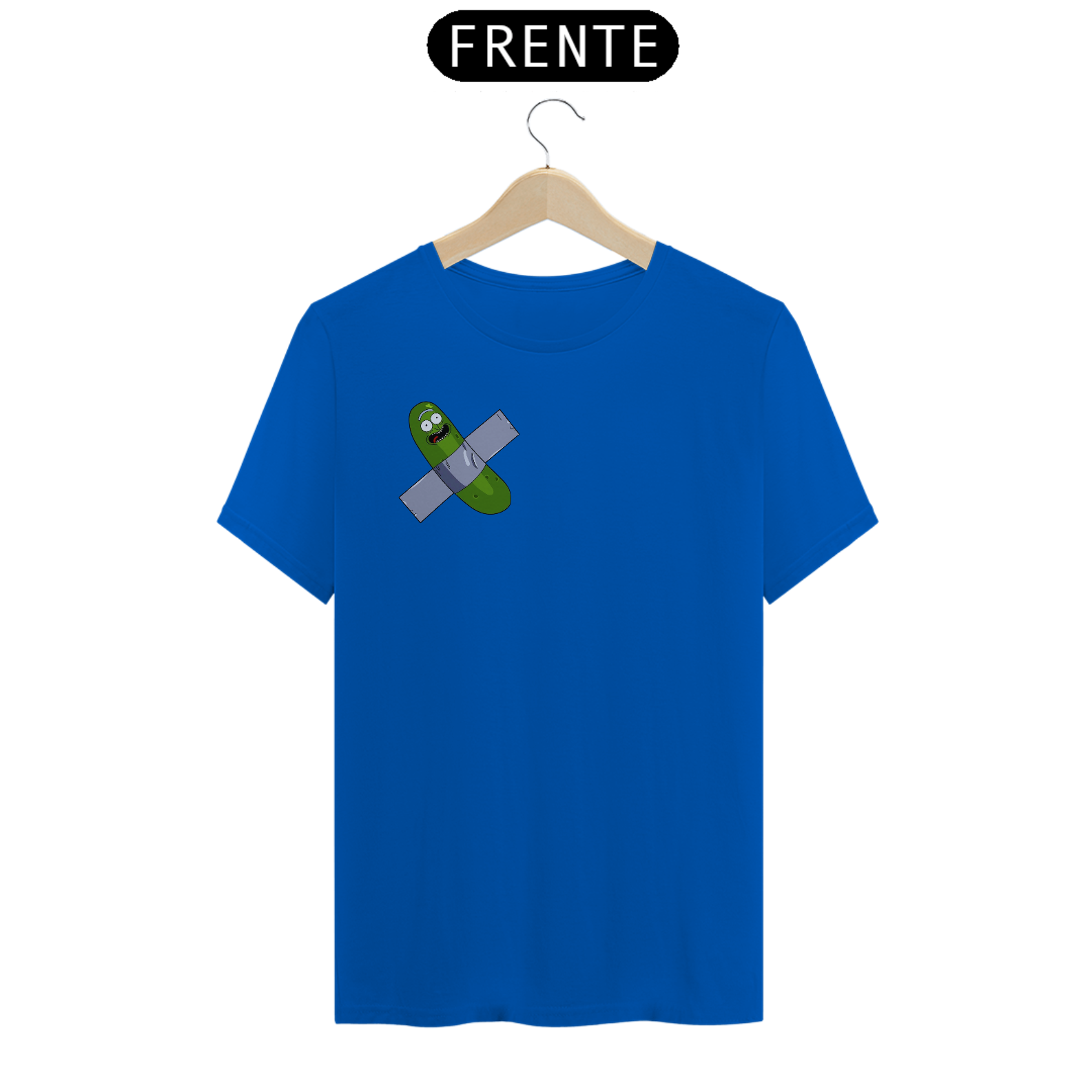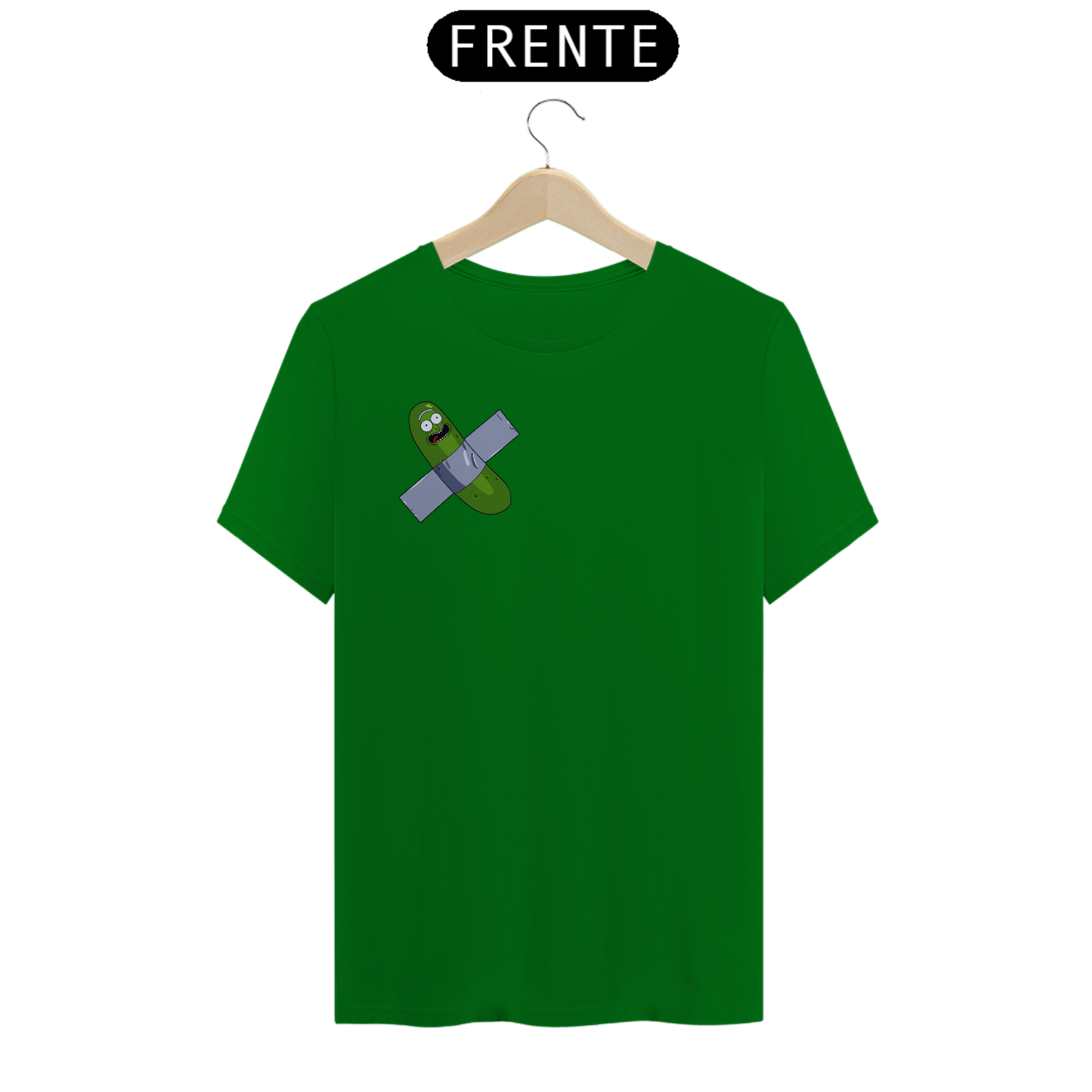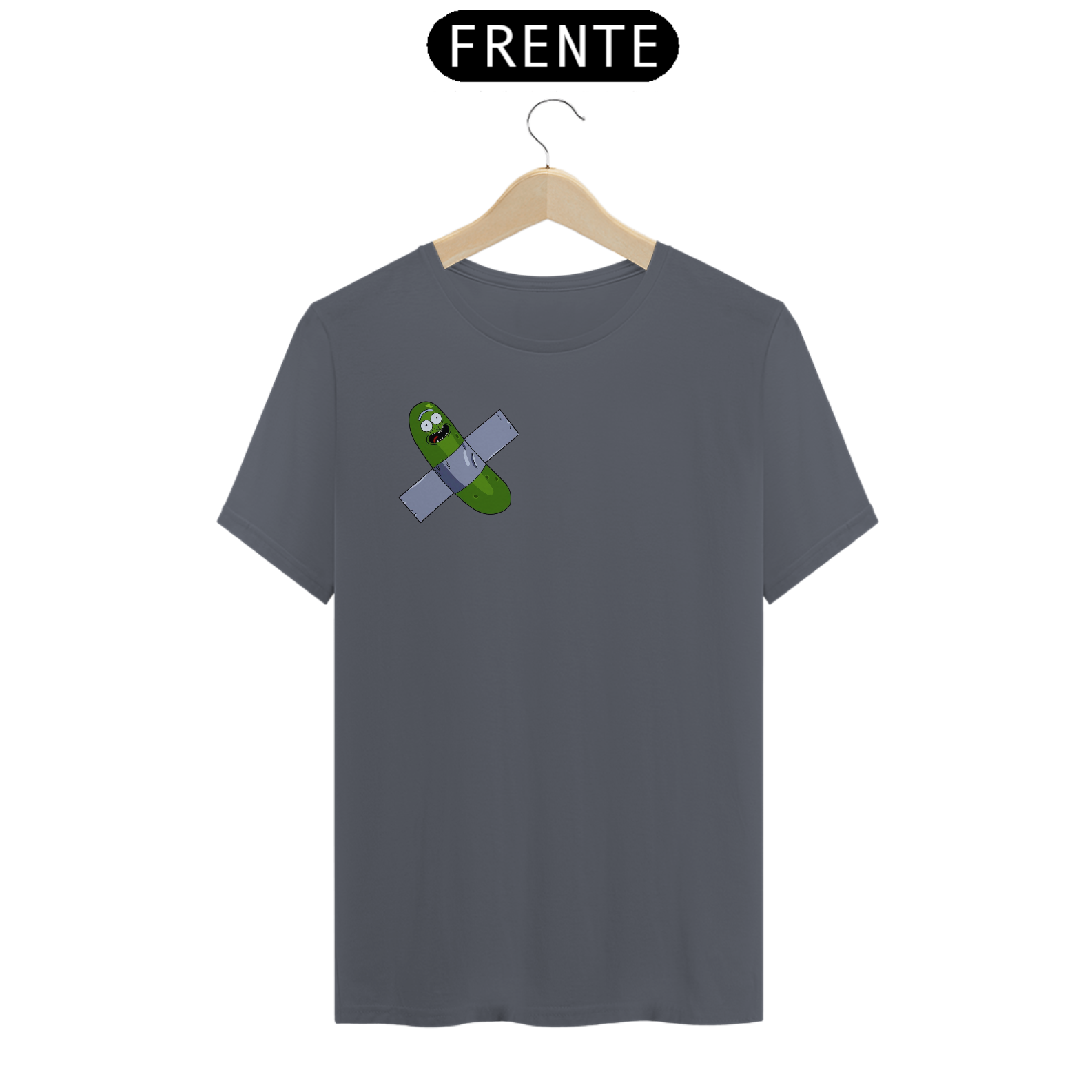 "Inspirado em um dos momentos mais hilariantes da série Rick and Morty, trazemos a você a estampa 'Pickle Rick Artístico'. Nessa cena icônica, Rick se transforma em um pepino e embarca em uma aventura épica. Mas, como uma pitada de ironia e referência à arte contemporânea, adicionamos um toque especial: o pepino está colado com fita adesiva preta, remetendo ao infame incidente em que um estudante sul-coreano comeu a obra de arte 'Comedian', de Maurizio Cattelan. Com essa camiseta, você expressa seu amor pela cultura pop, pelo humor irreverente de Rick and Morty e pelo mundo da arte, de uma forma criativa e divertida. Vista essa camiseta e mostre ao mundo o seu lado artístico e a sua paixão por aventuras surrealistas!"