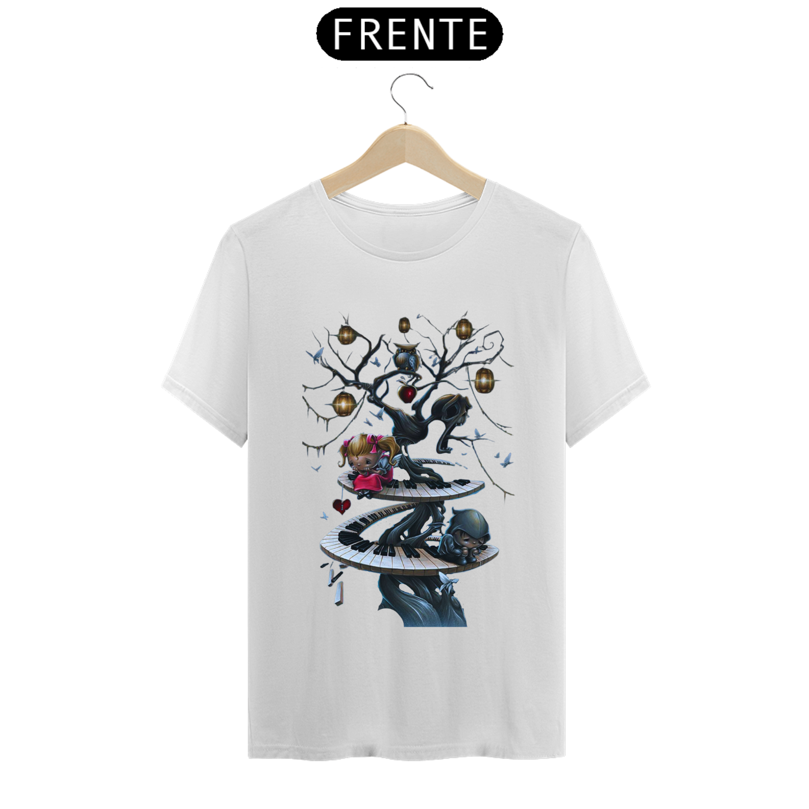 "Adentre o reino da Harmonia das Sombras, onde uma árvore morta ganha vida. Seus galhos sinuosas se entrelaçam com as teclas de um piano abandonado, ecoando uma melodia triste e melancólica. Sob a sombra sombria da árvore, uma menina solitária e um menino desolado sentam-se, envoltos em uma atmosfera de pesar e introspecção. Nessa cena desoladora, a arte encontra a música, e as emoções transbordam das profundezas da alma. A Harmonia das Sombras convida você a explorar as sombras internas e encontrar beleza até mesmo na tristeza."