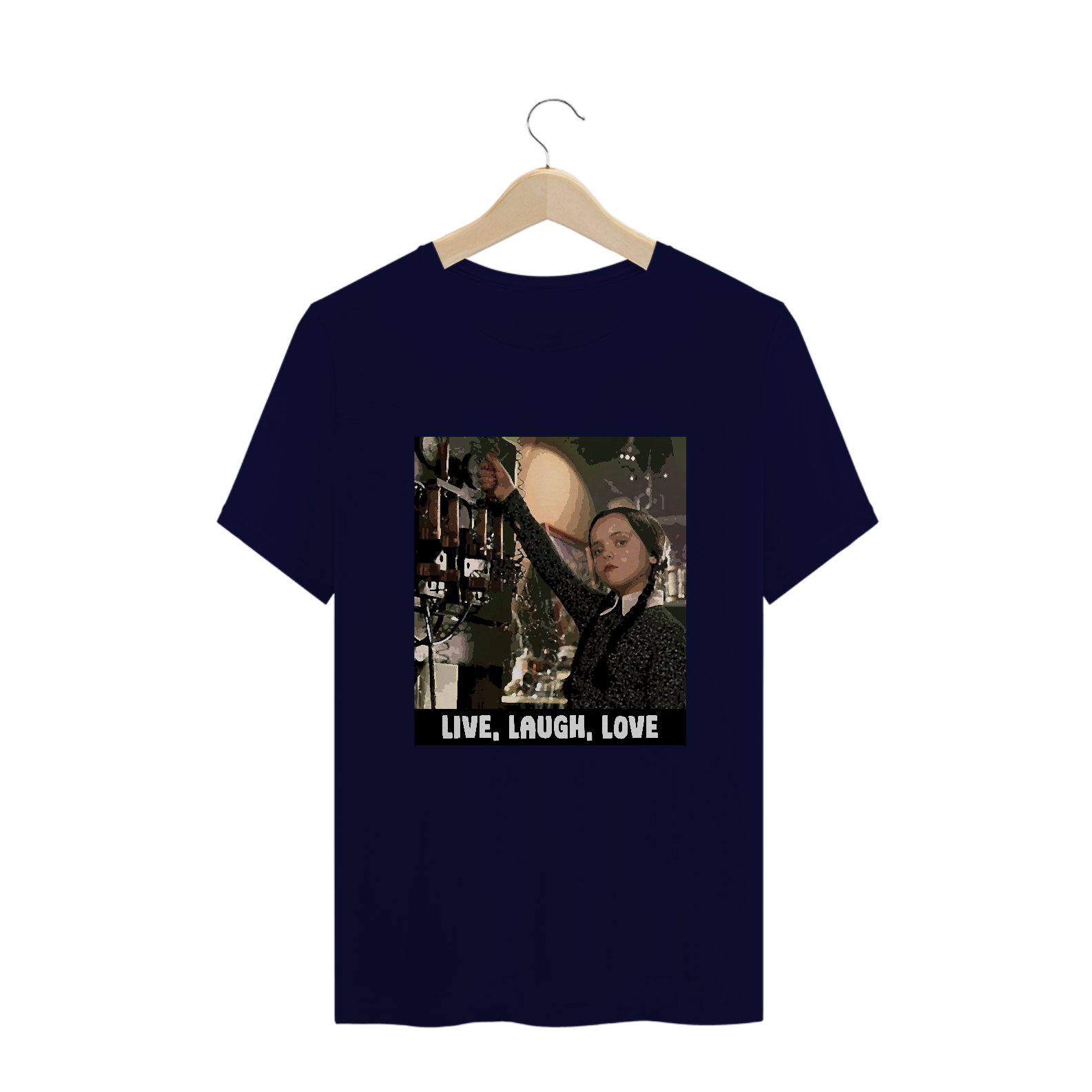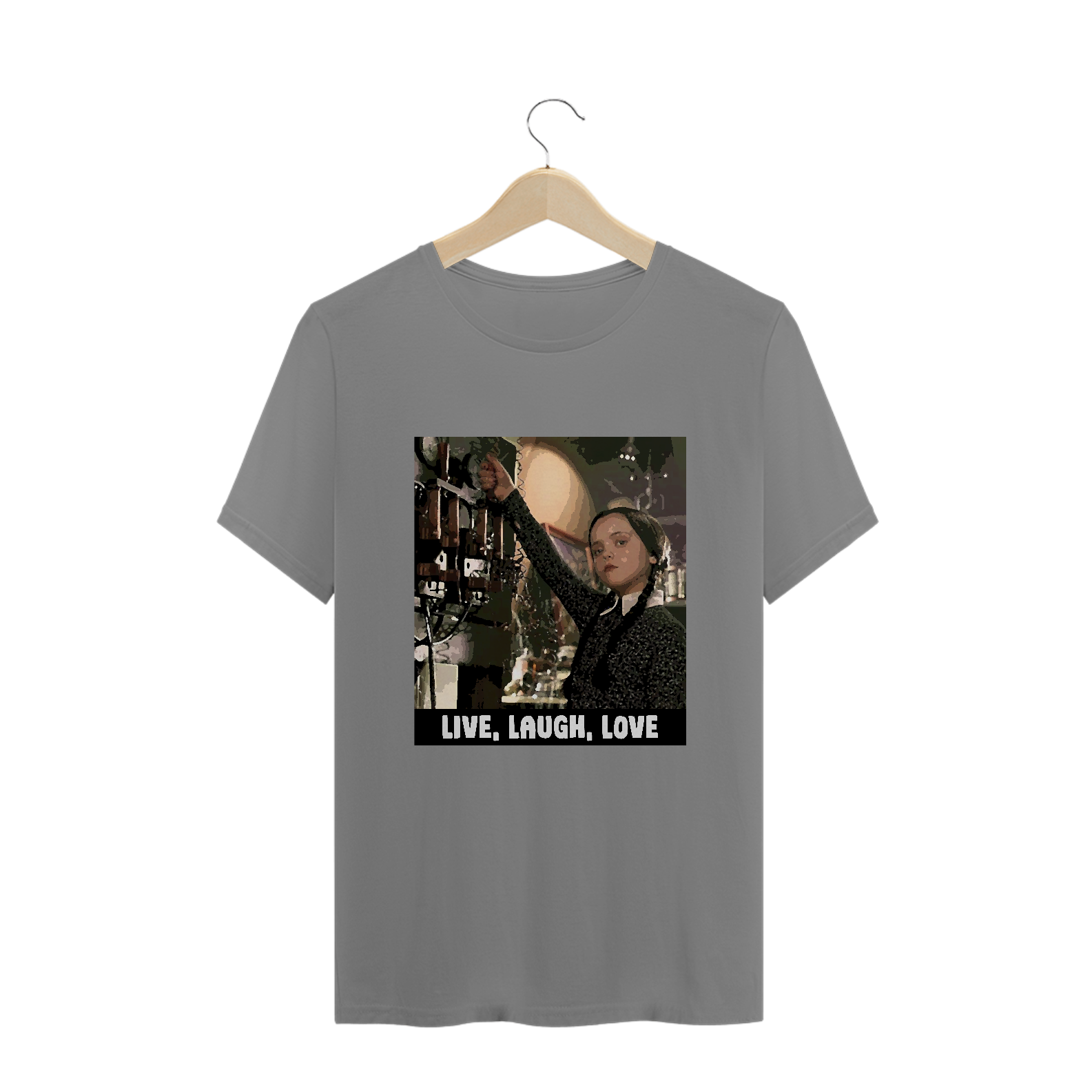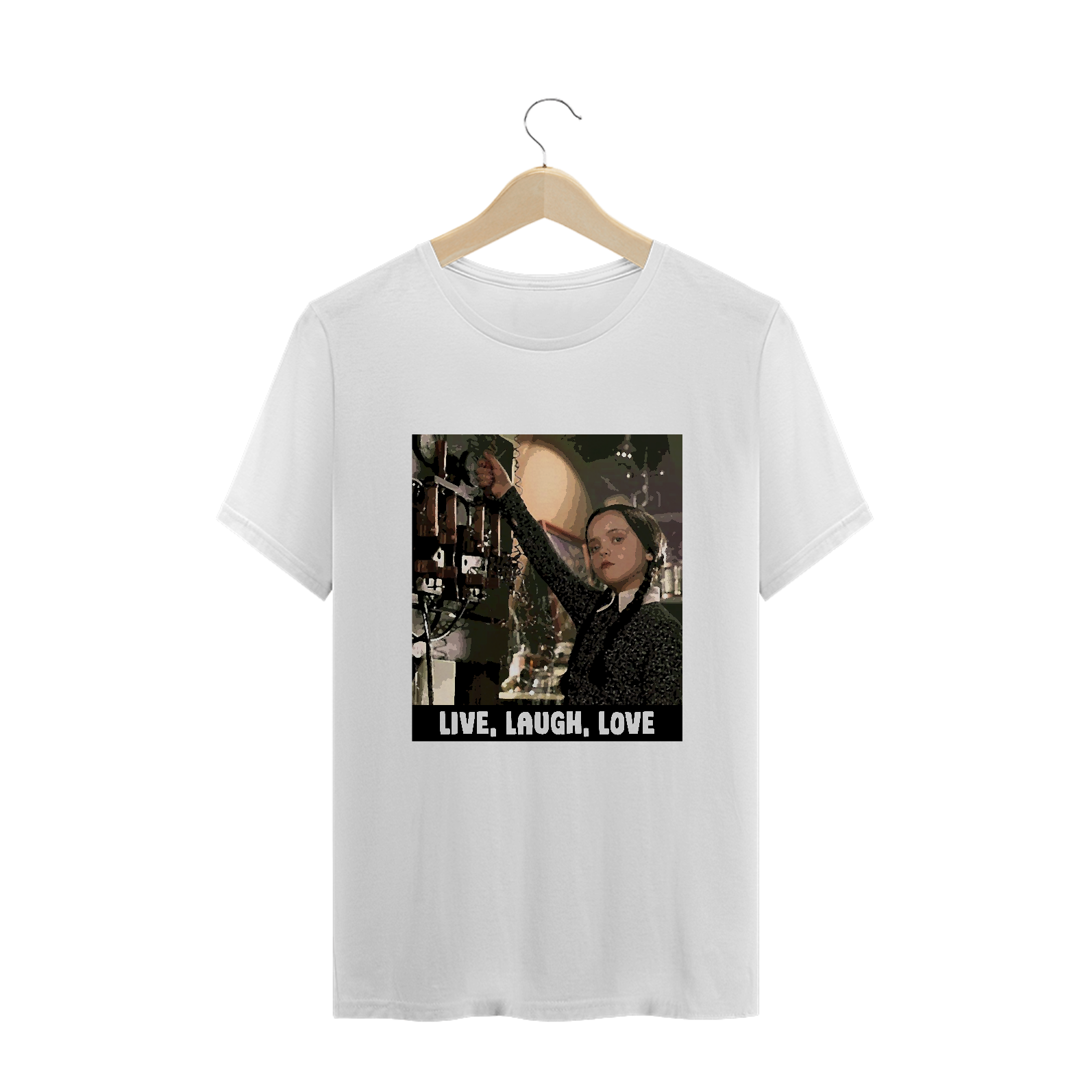 Na camiseta 'Live, Laugh, Love', Wandinha quebra os padrões: 'Não se importa de morrer, nunca ri, não ama', desafiando os clichês. Uma dose de humor negro sobre os ideais de vida, riso e amor.