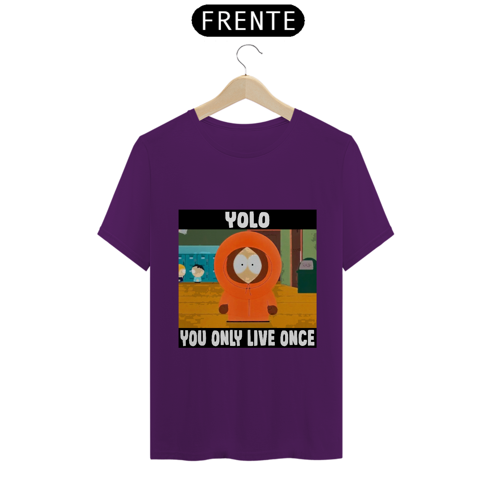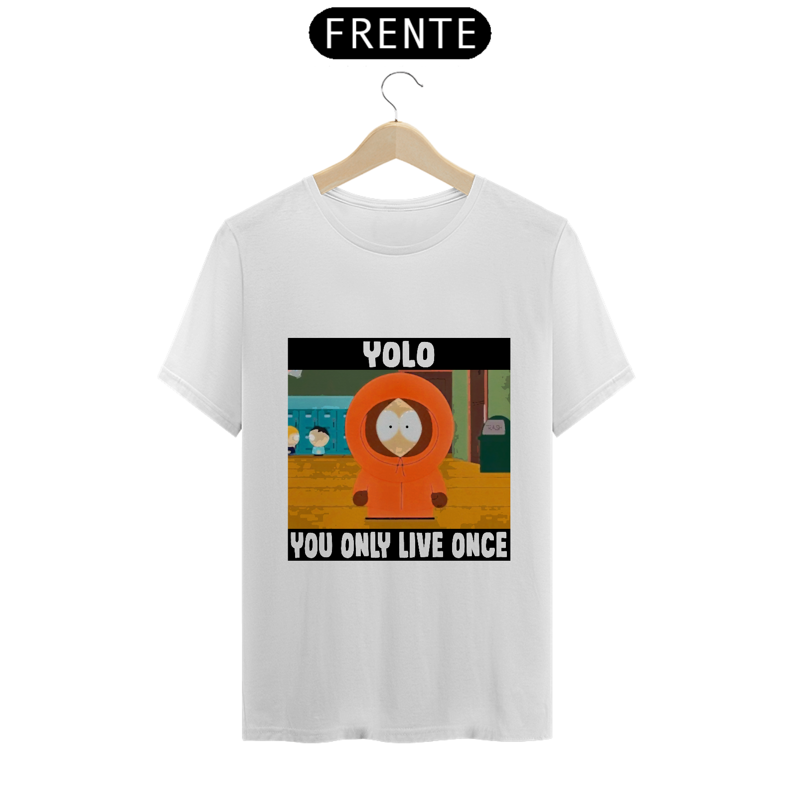 Na camiseta 'YOLO' (You Only Live Once), Kenny de South Park desafia a máxima, já morrendo mais de 90 vezes. Uma ironia sobre a efemeridade da vida, celebrando a irreverência de viver cada momento ao máximo, mesmo que... várias vezes.