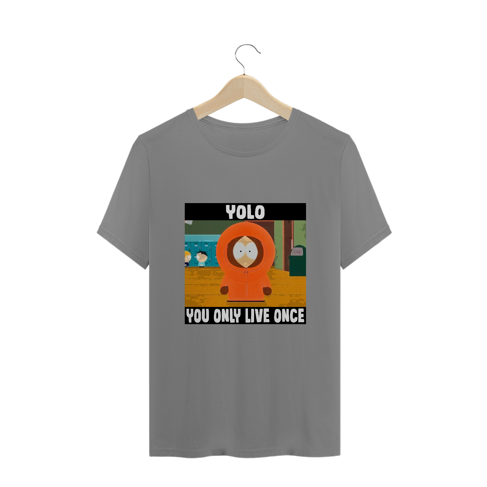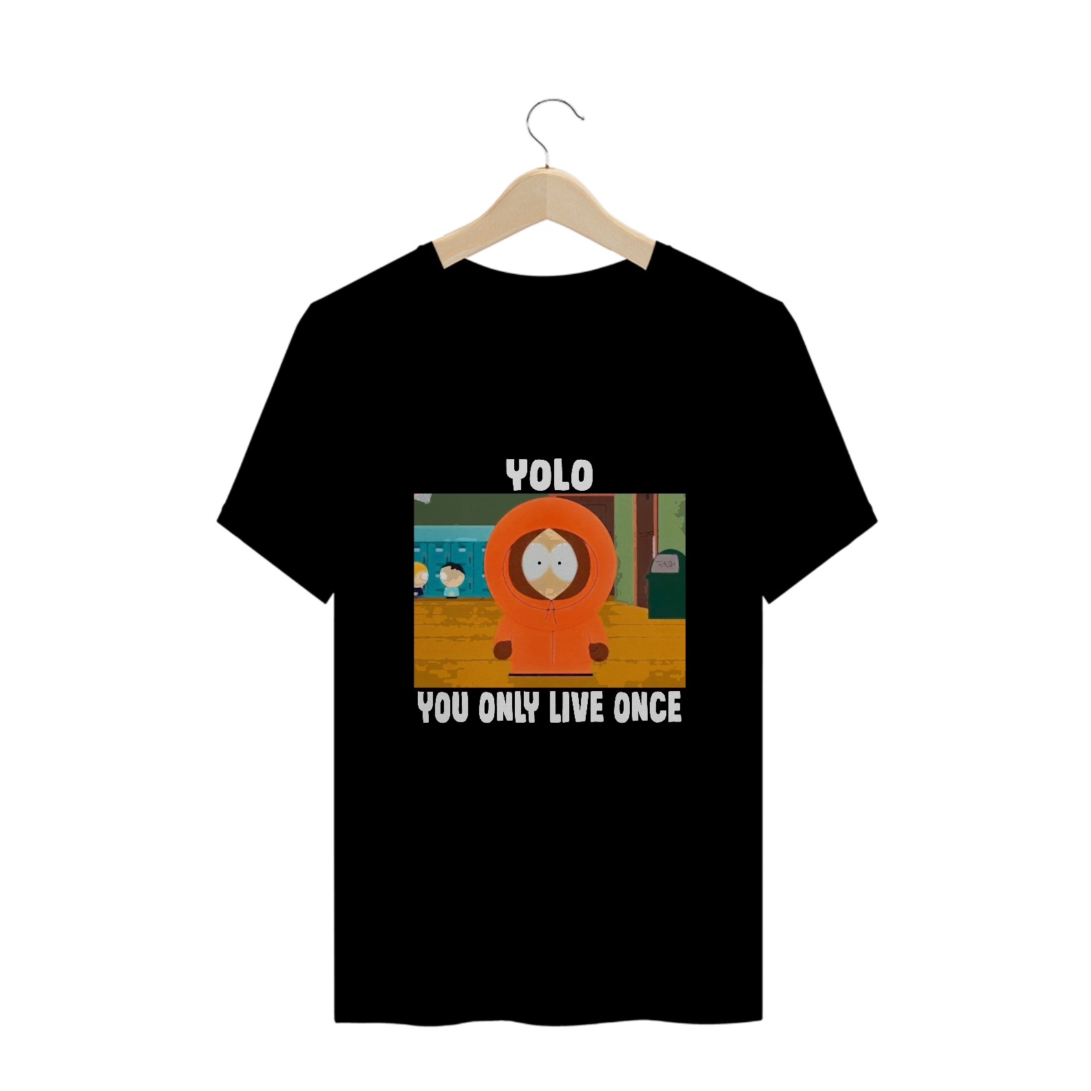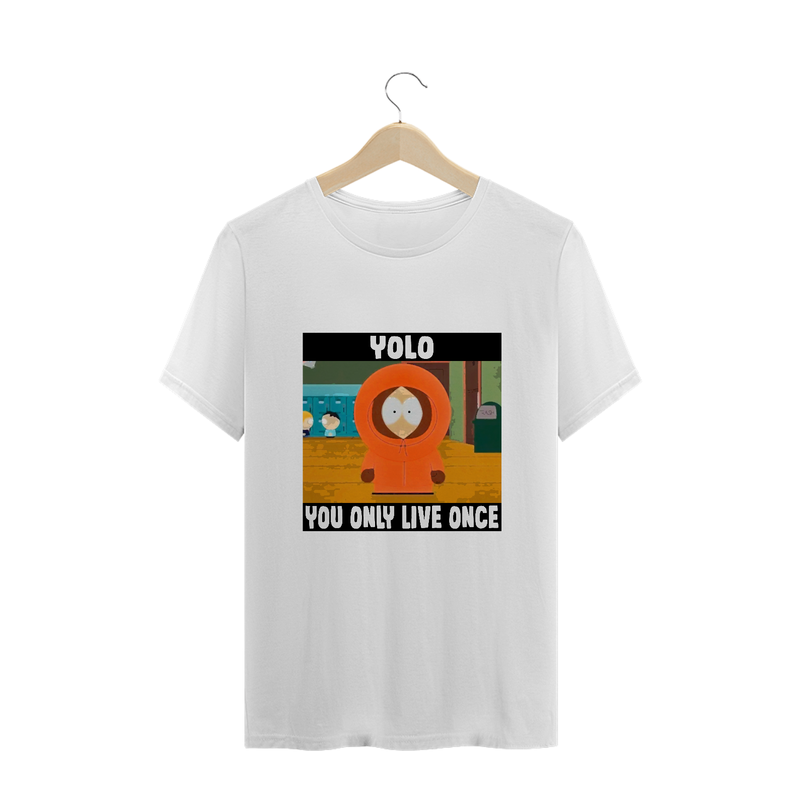 Na camiseta 'YOLO' (You Only Live Once), Kenny de South Park desafia a máxima, já morrendo mais de 90 vezes. Uma ironia sobre a efemeridade da vida, celebrando a irreverência de viver cada momento ao máximo, mesmo que... várias vezes.