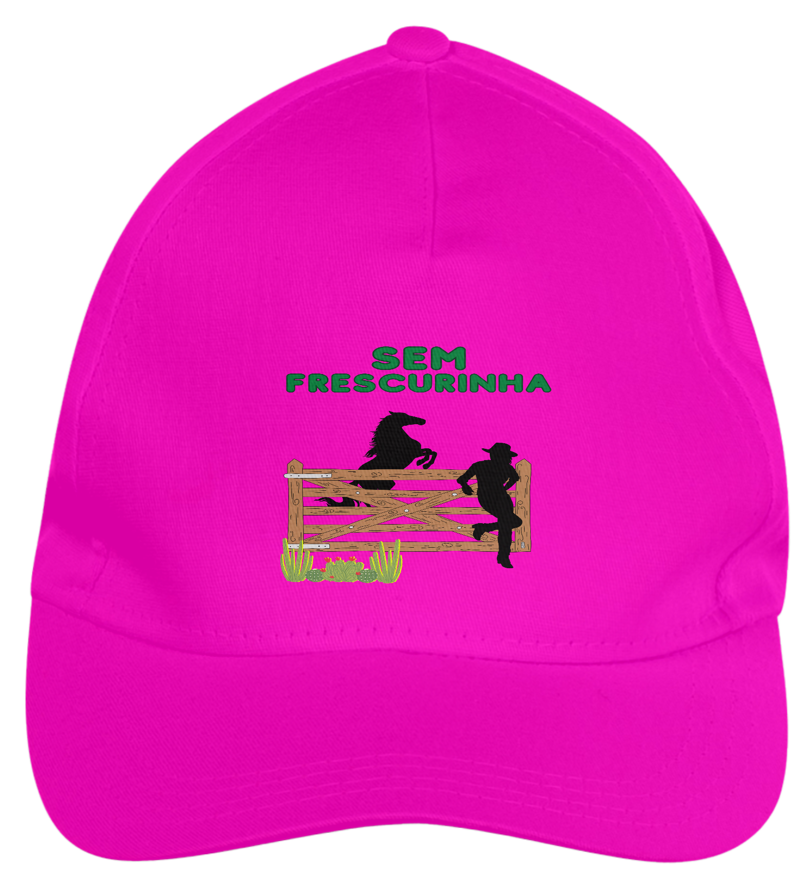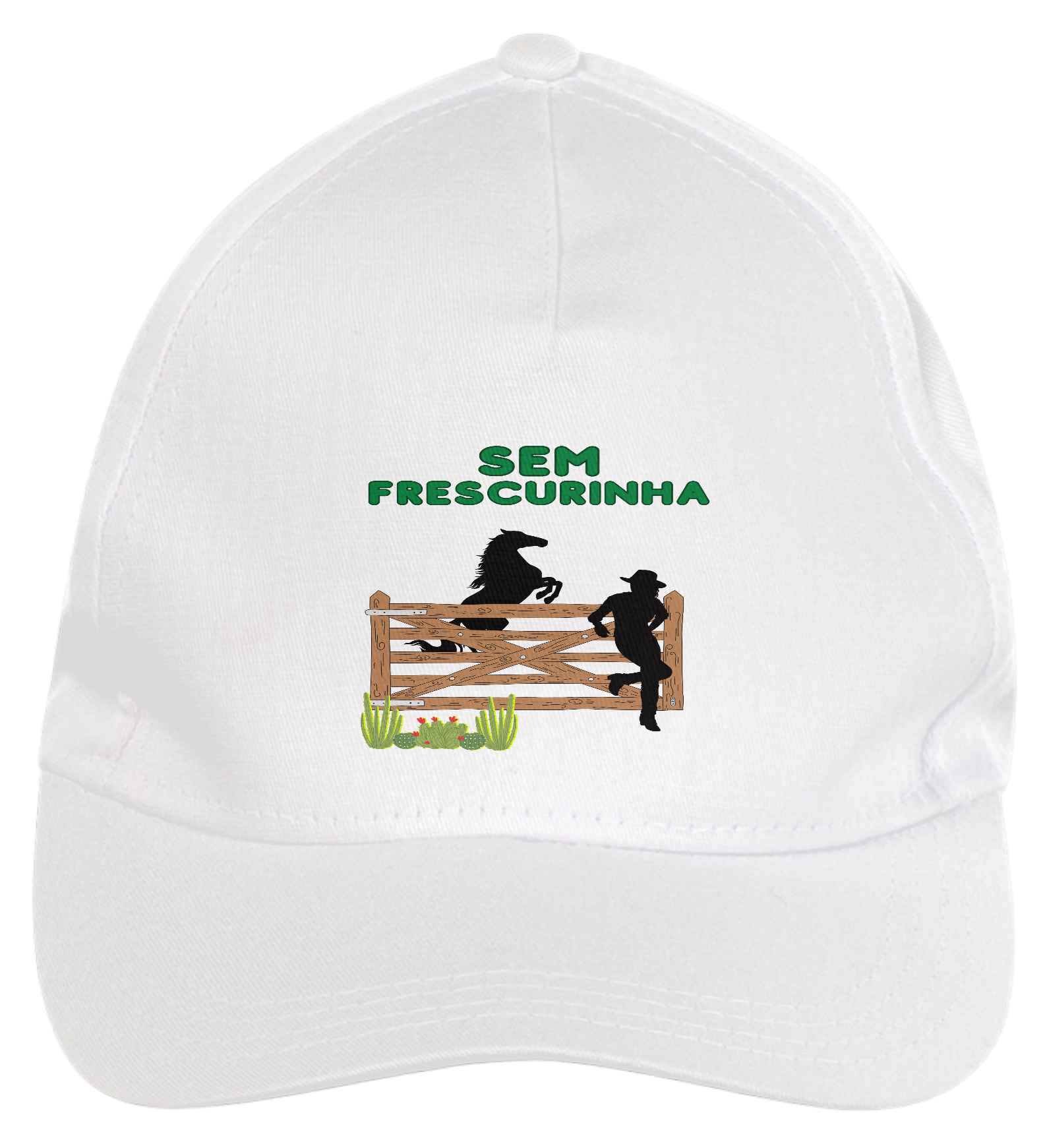 Boné americano com transfer frontal em alta qualidade, aba curva e fecho em tira totalmente regulável com pinos. O modelo veste tamanho "único".