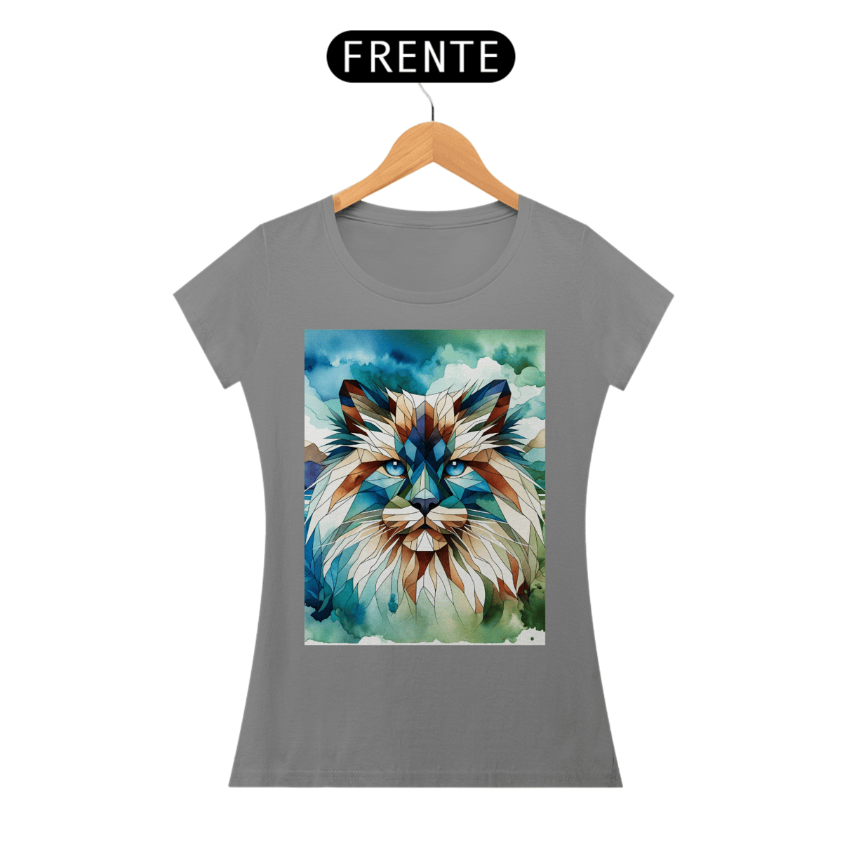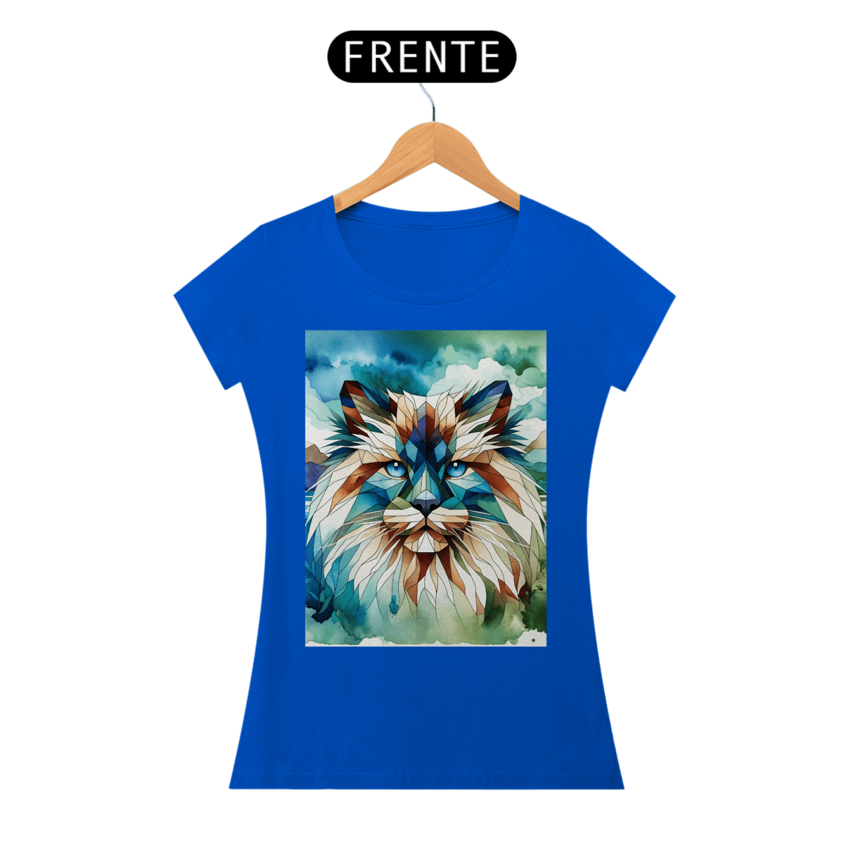 Gato Himalaio com formas geométricas e elementos de aquarela em tons frios de azul, teal e verde. A combinação de estilos cria um efeito visual único e artístico.