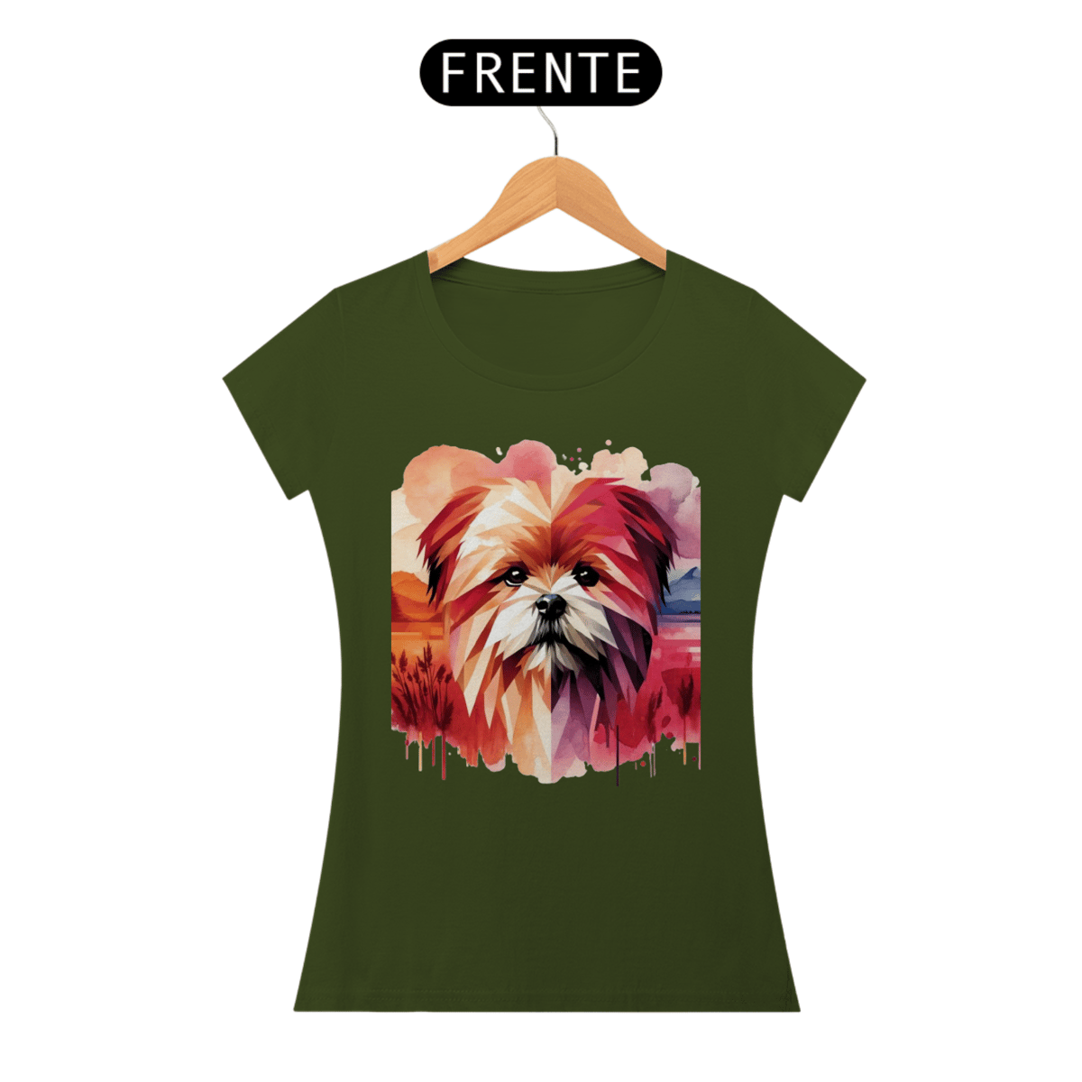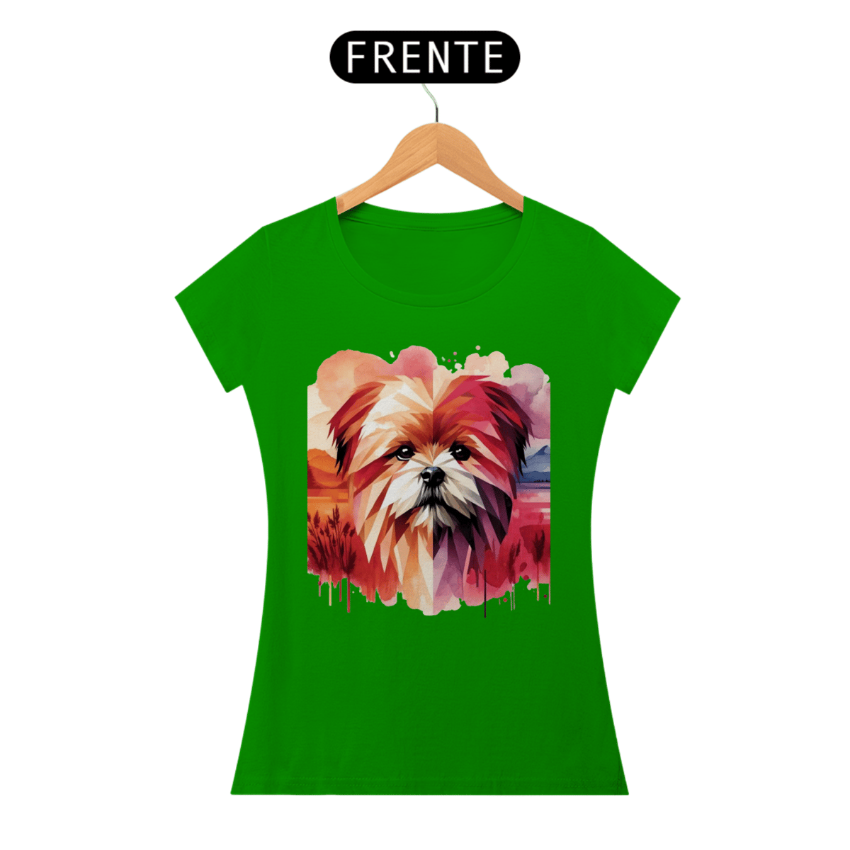 Lhasa Apso com formas geométricas e elementos de aquarela em tons quentes de rosa, vermelho e laranja. A combinação de estilos cria um efeito visual único e artístico.