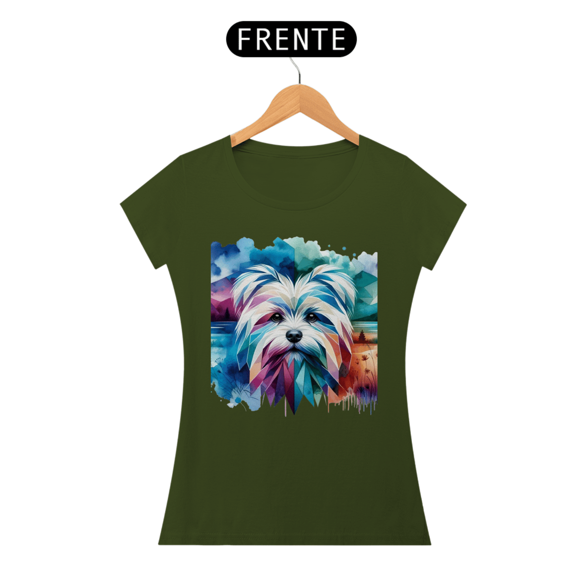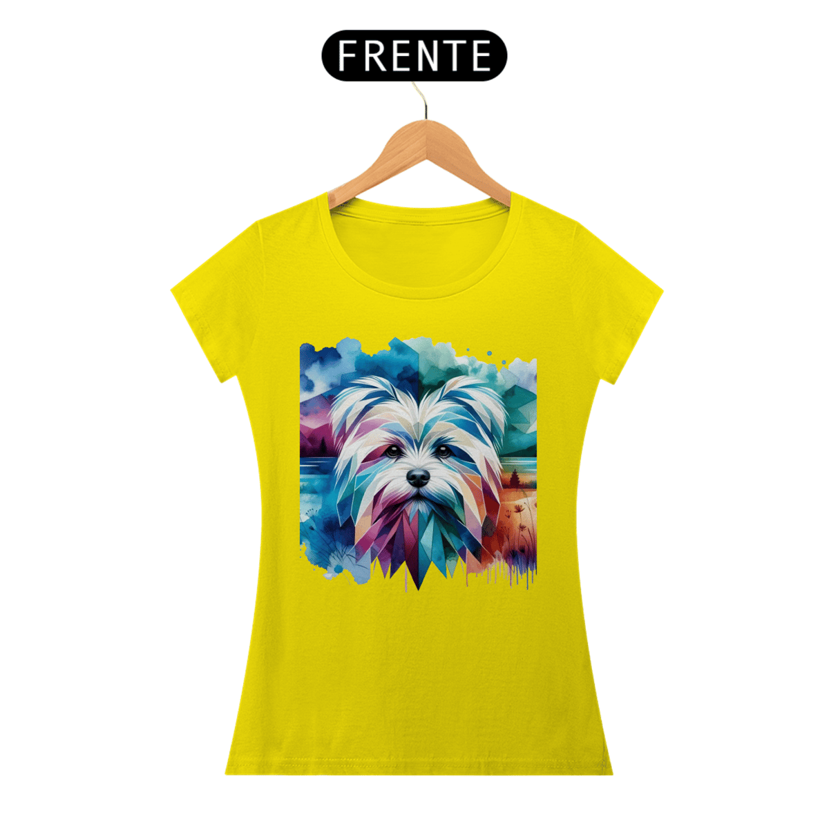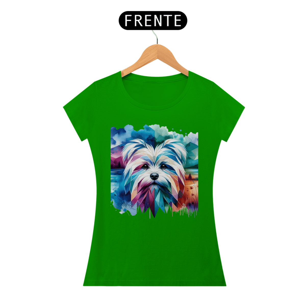 Maltês com formas geométricas e elementos de aquarela em tons frios de azul, turquesa e roxo. A combinação de estilos cria um efeito visual único e artístico.