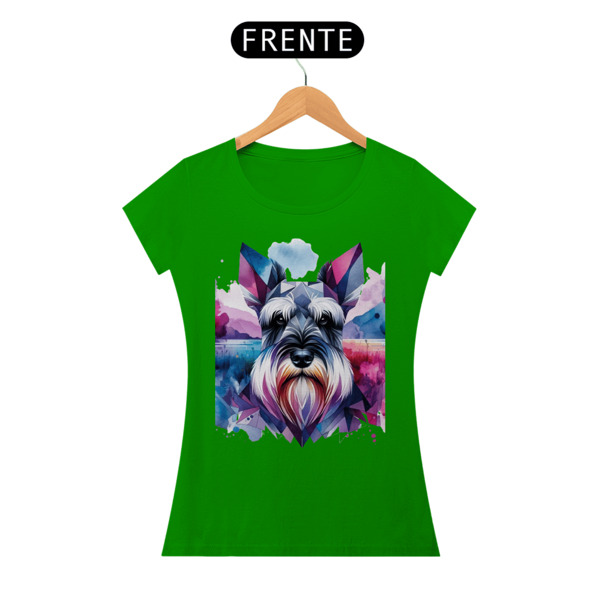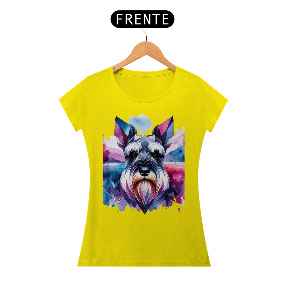 Schnauzer com formas geométricas e elementos de aquarela em tons frios de roxo, rosa e azul. A combinação de estilos cria um efeito visual único e artístico.