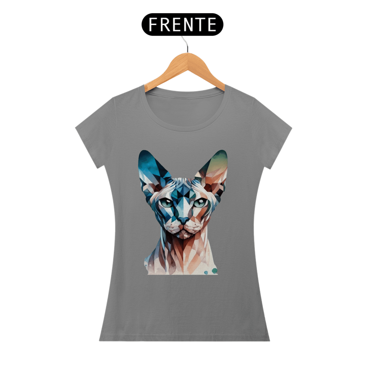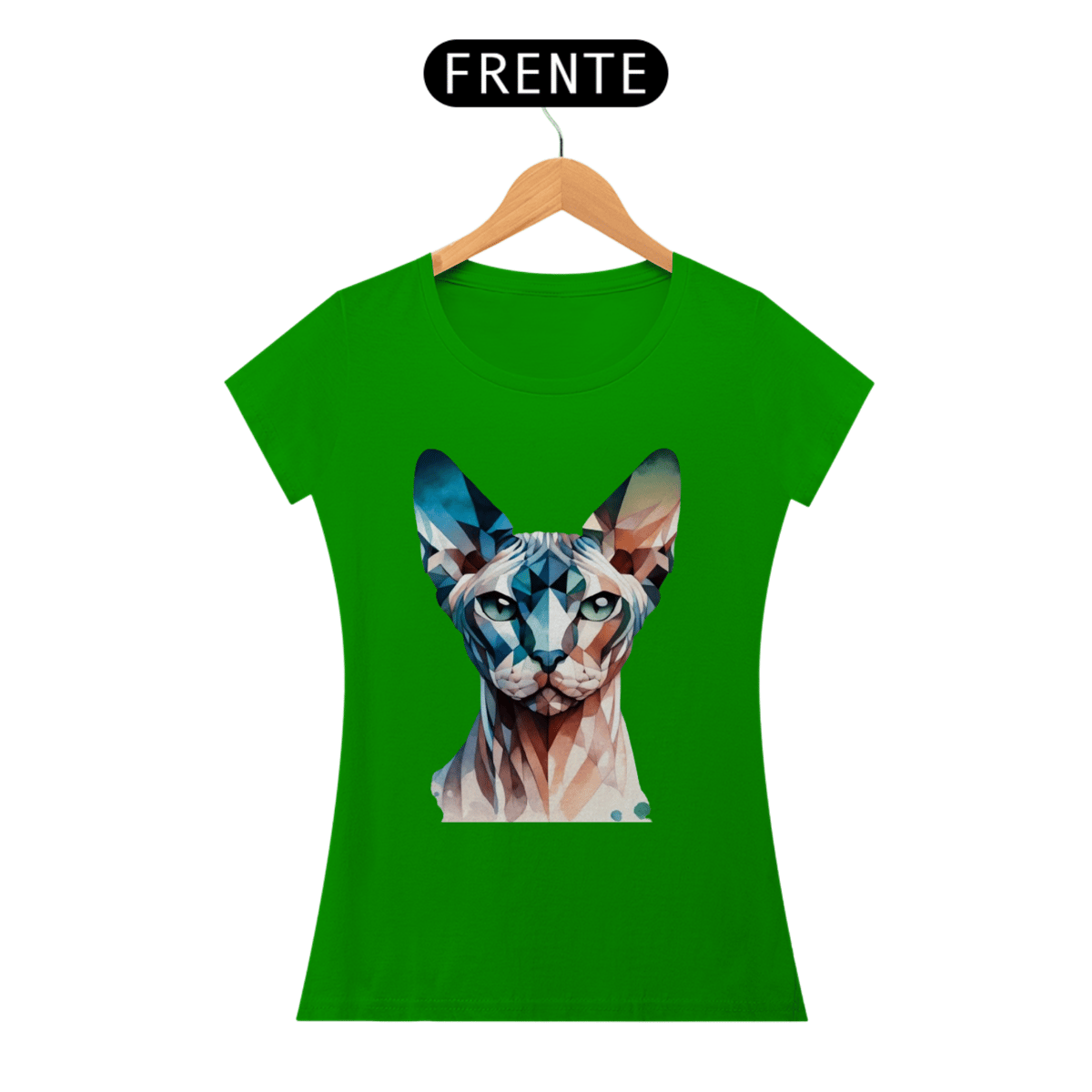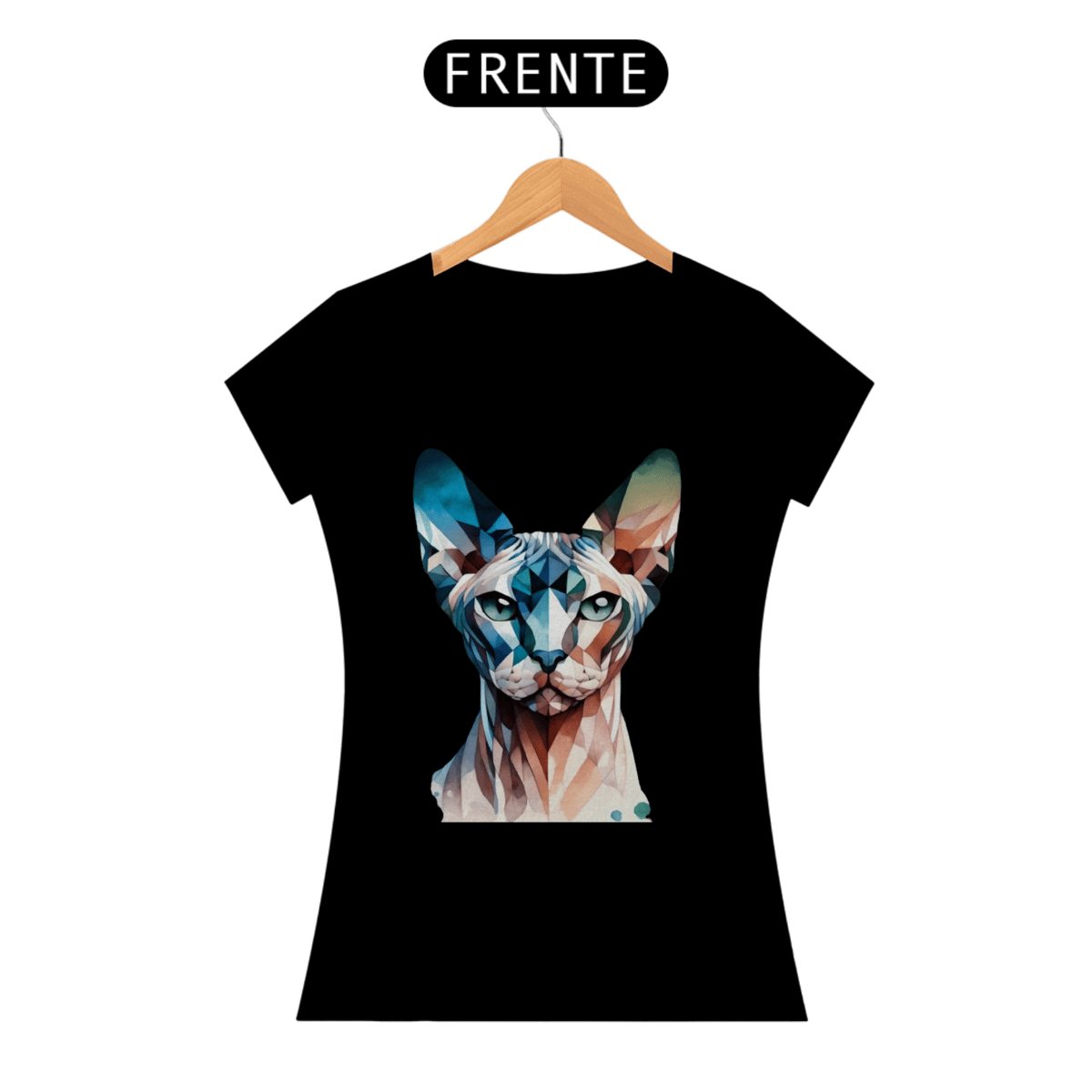 Mais uma camiseta Moda Perro. Gato Sphynx com formas geométricas e elementos de aquarela em tons frios de azul, teal e verde. A combinação de estilos cria um efeito visual único e artístico.