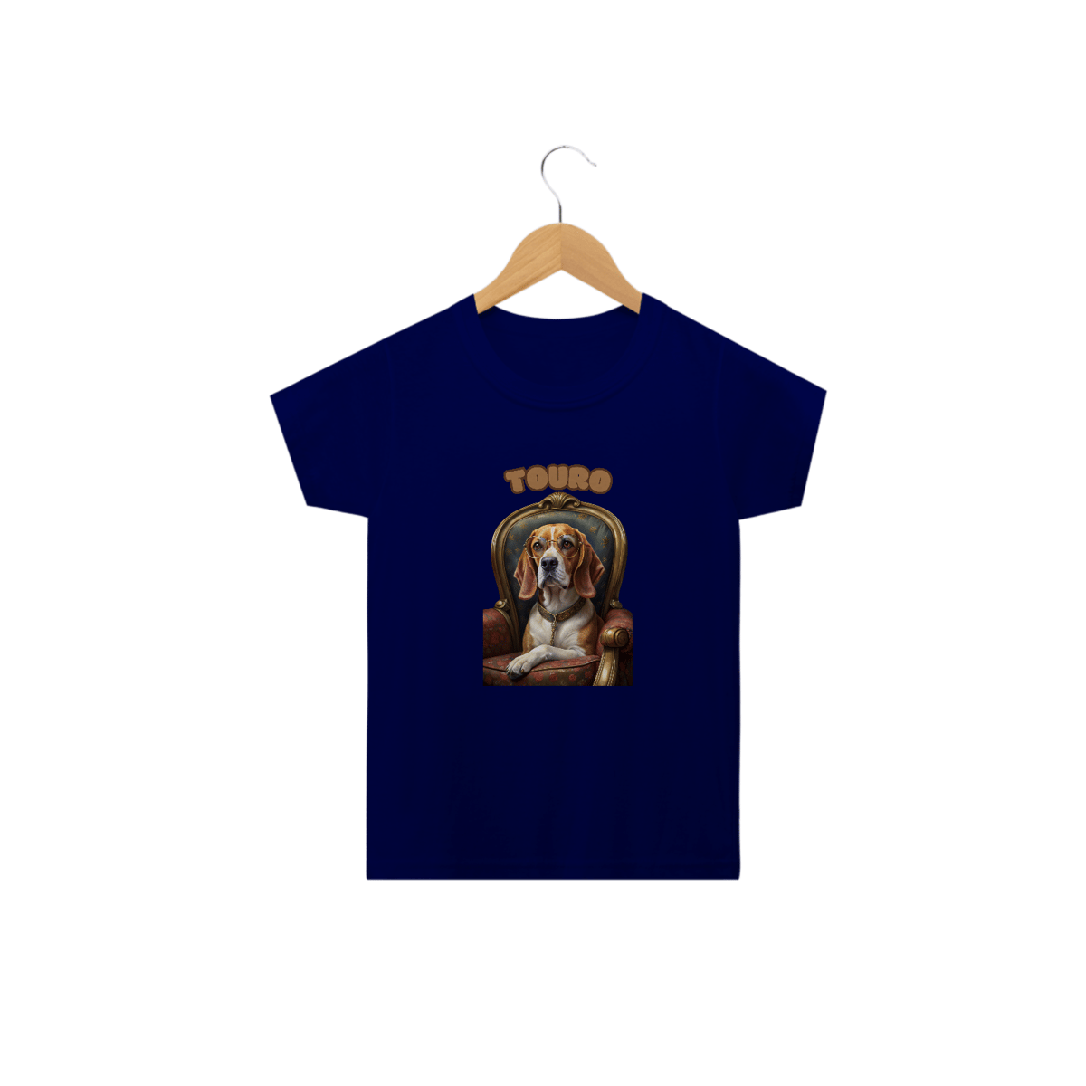 A estampa apresenta um Beagle majestoso sentado em uma cadeira luxuosa, adornada com detalhes dourados e estofado floral. O cão está usando um par de óculos redondos, que lhe conferem um ar de sabedoria e sofisticação. O cenário luxuoso e a cadeira elaborada refletem o gosto taurino por conforto e itens de alta qualidade.