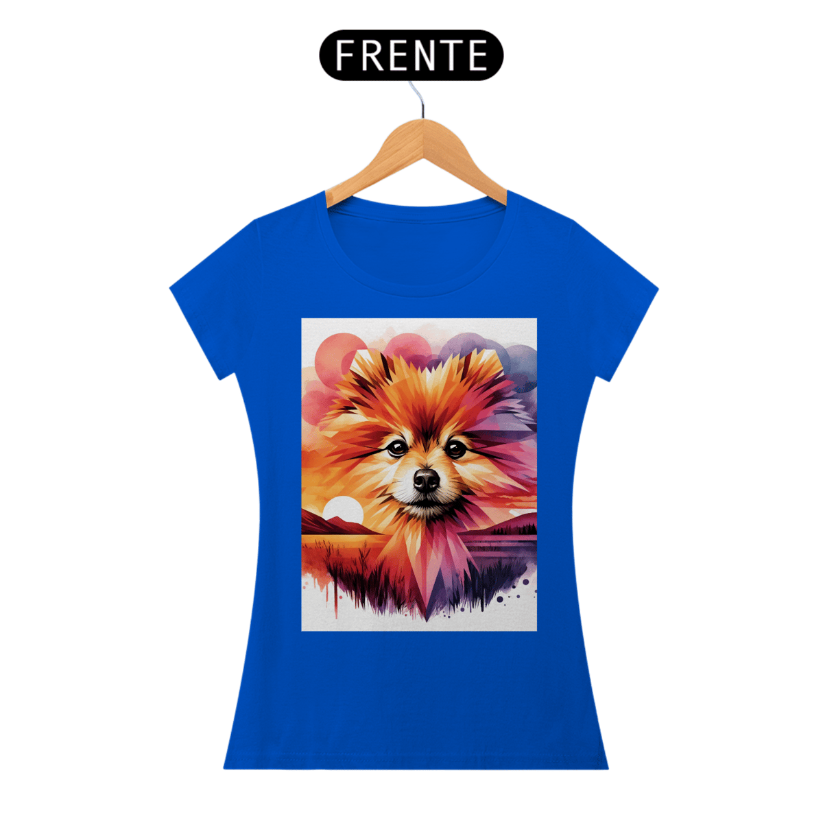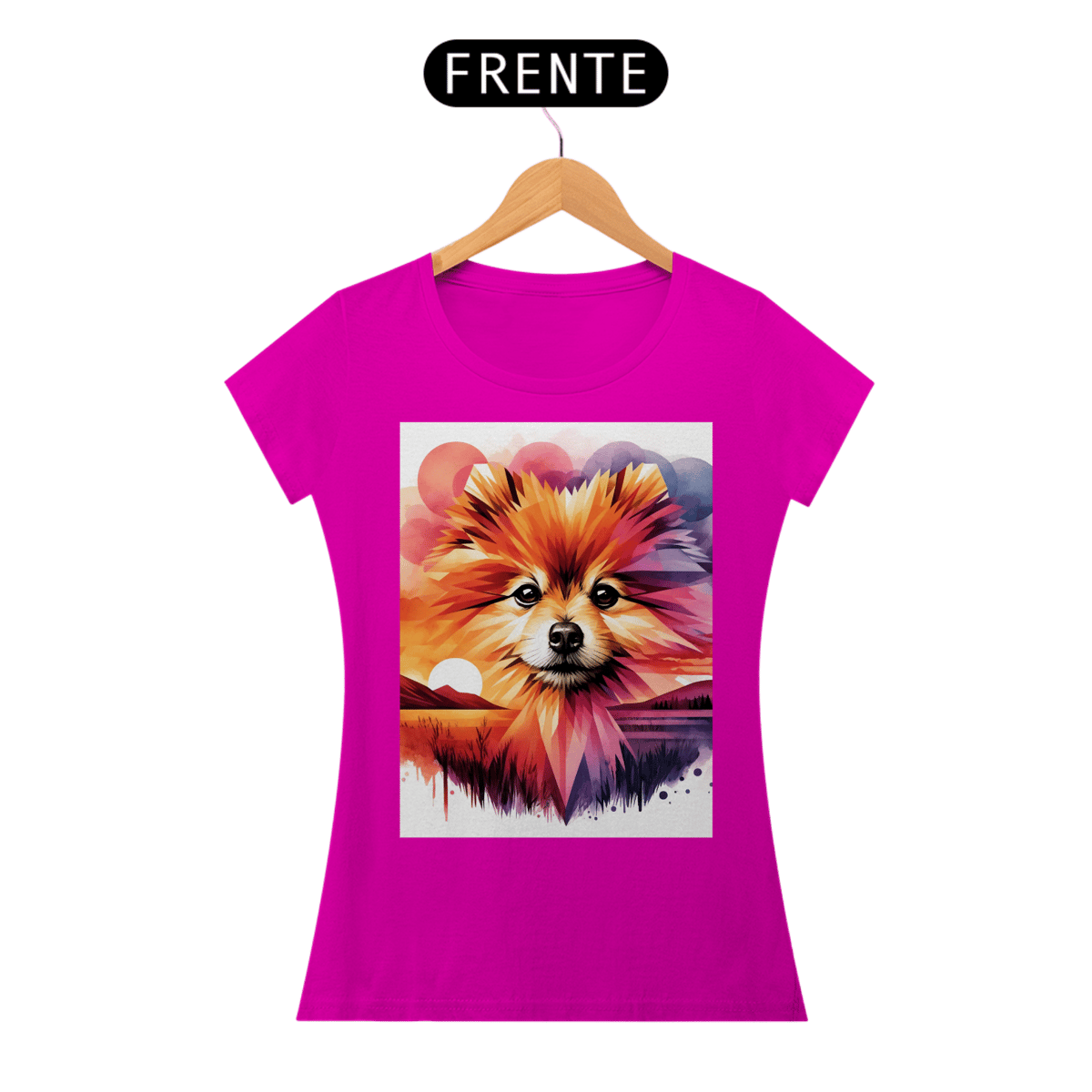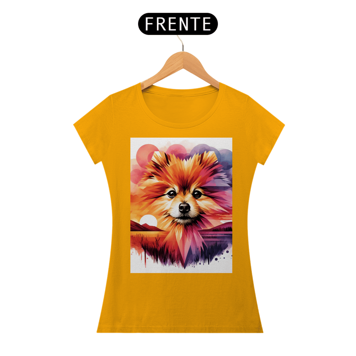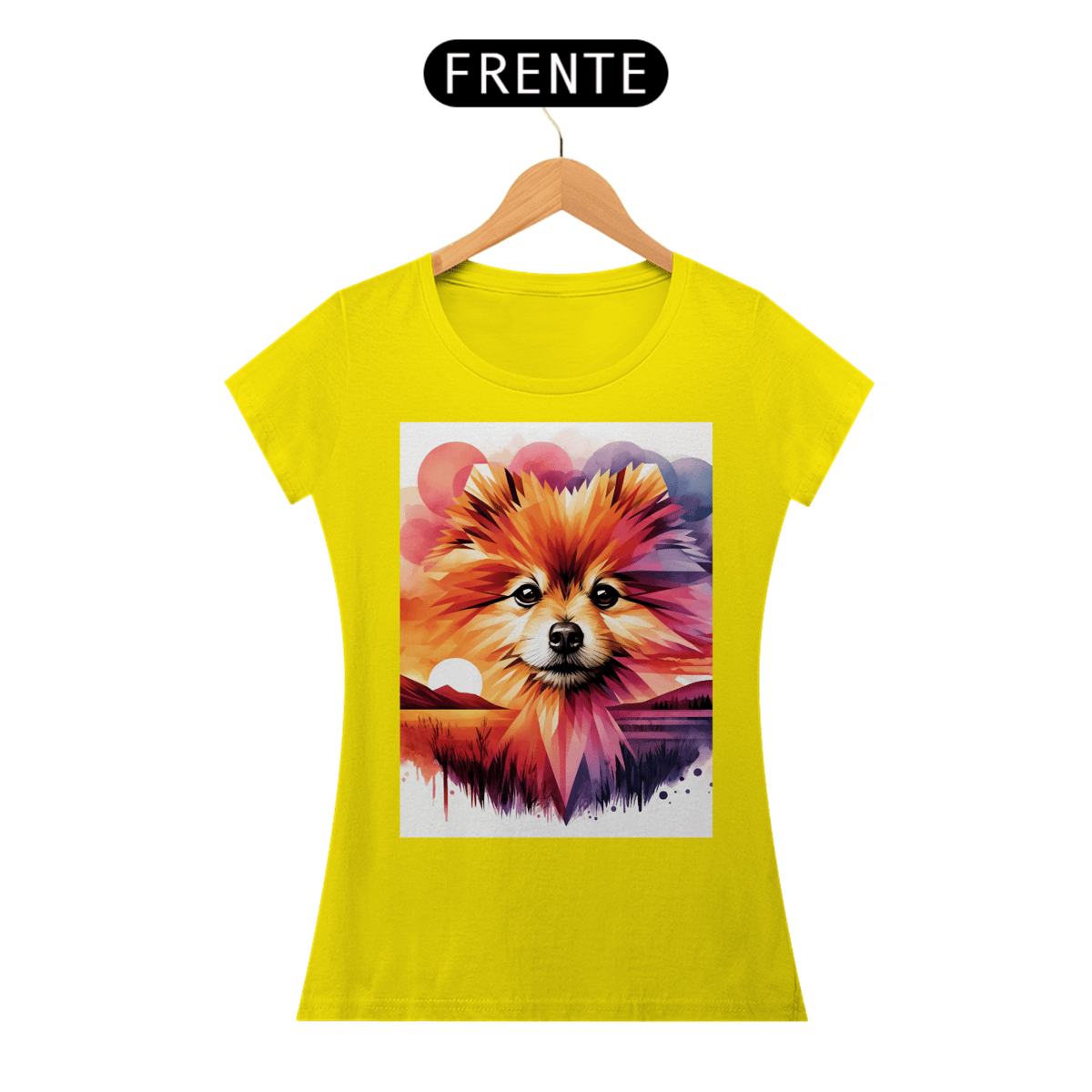 A camiseta Lulu da Pomerânia mostra a beleza desse lindo animal. O rosto da Pomerânia é composto por uma mistura de formas geométricas e elementos de aquarela, com um fundo de pôr do sol vibrante em tons de laranja, rosa e roxo.