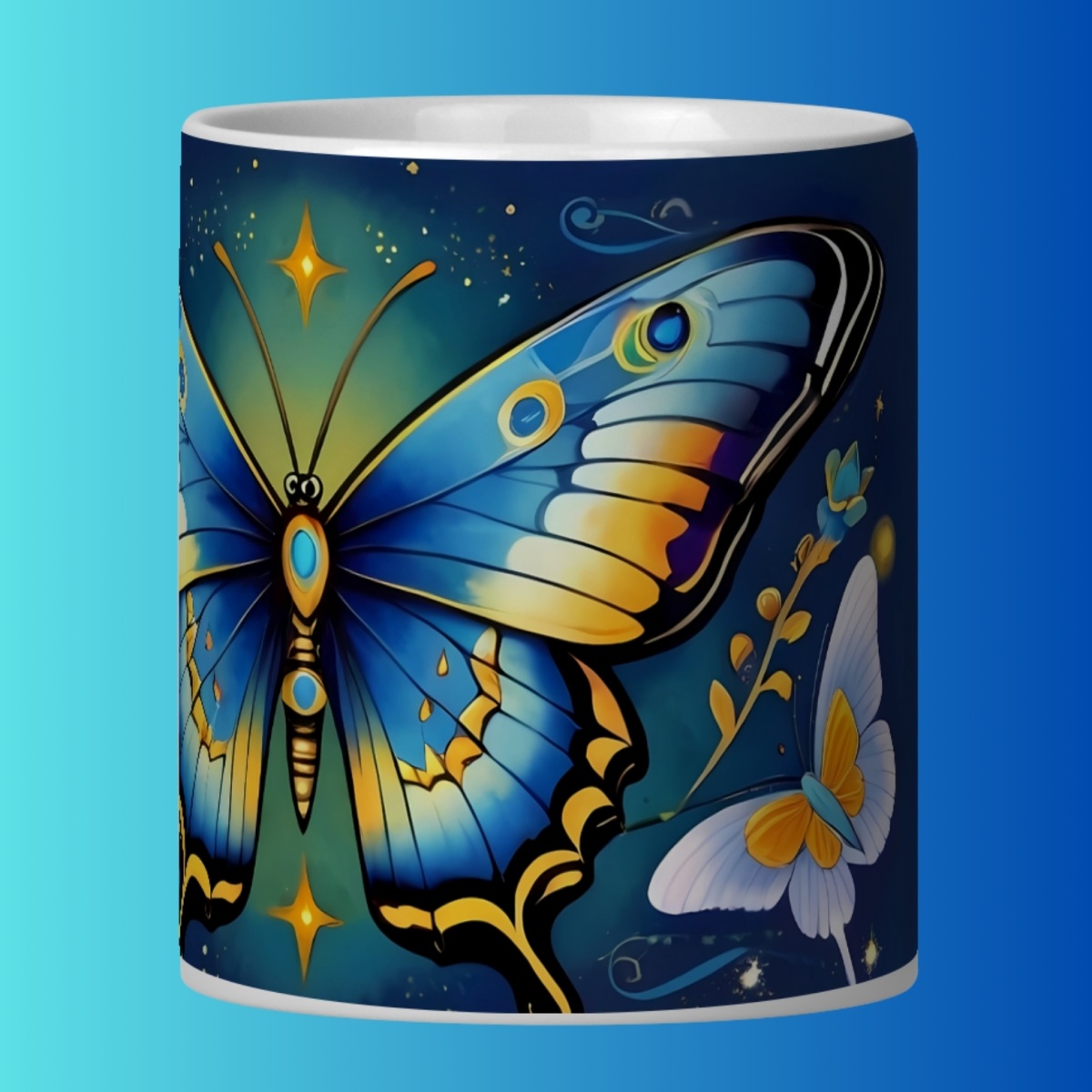 Beber numa caneca com a imagem de uma borboleta
