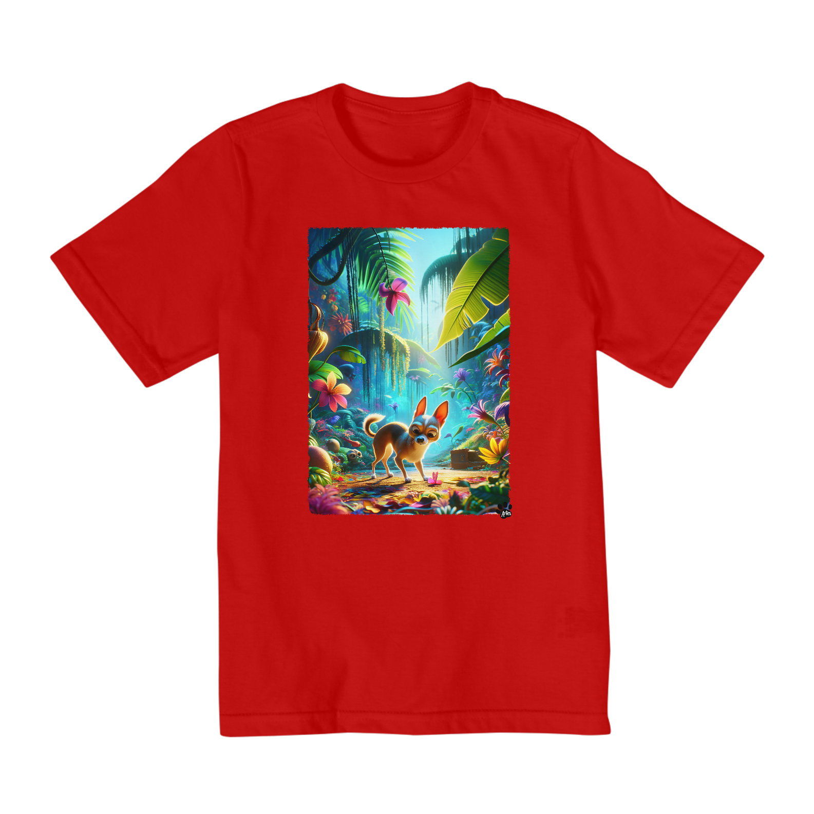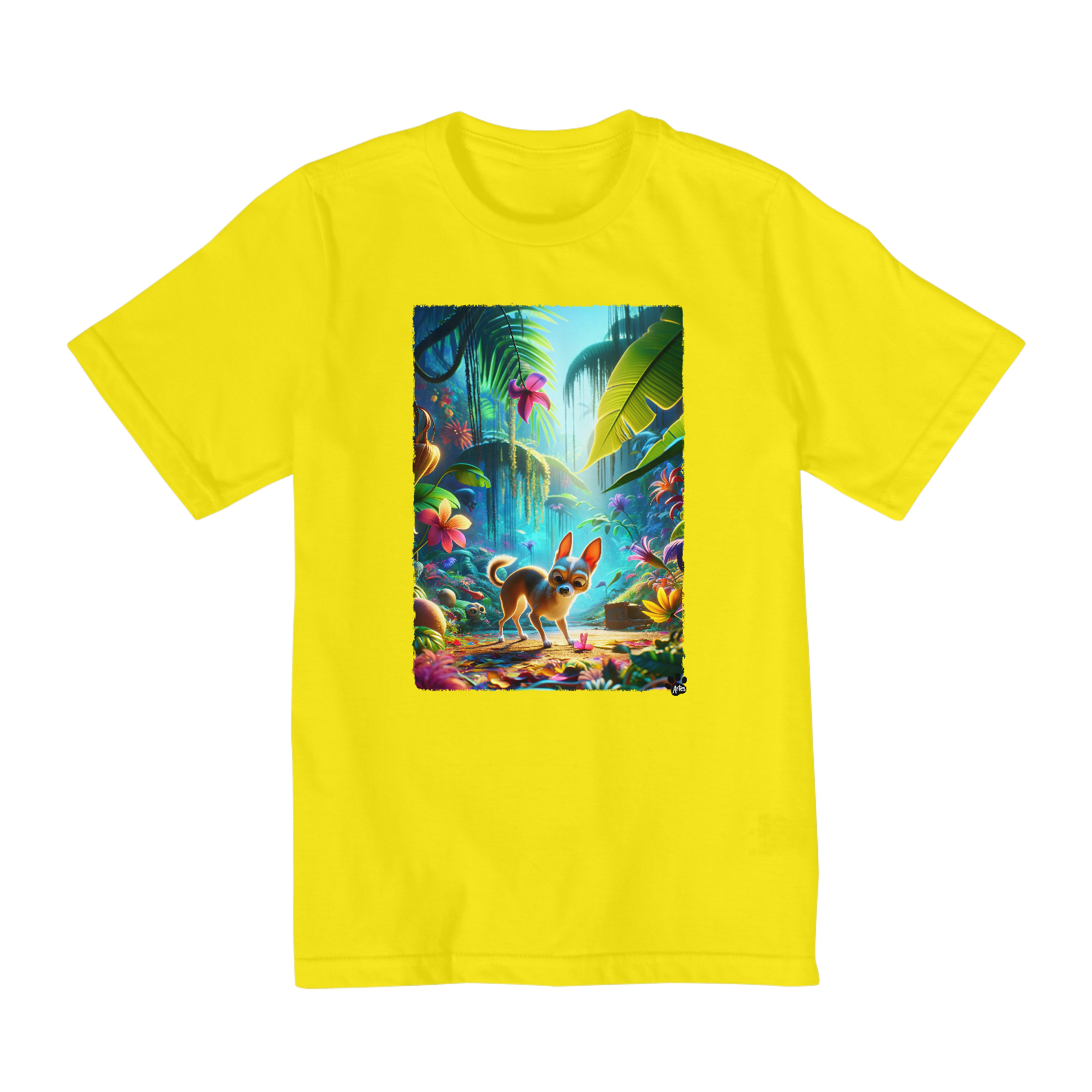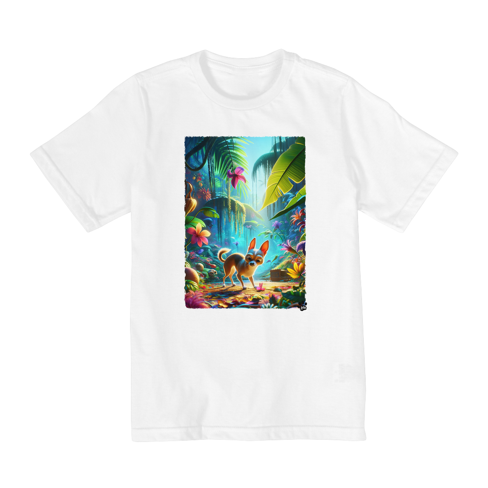 Prepare-se para uma aventura emocionante na selva com esta camiseta encantadora! Um adorável cachorro Chihuahua, inspirado nas animações da Pixar, lidera a expedição através de uma selva vibrante e cheia de vida. Com seu olhar curioso e sua sapequice, ele convida as crianças a se juntarem à sua jornada repleta de descobertas e diversão. O cenário exuberante, com plantas coloridas e detalhes intrigantes, promete despertar a imaginação dos pequenos exploradores. Feita com materiais de alta qualidade e cores vivas, esta camiseta é perfeita para os aventureiros mirins que adoram mergulhar em novas aventuras!