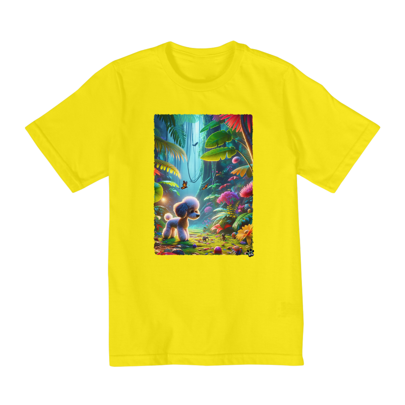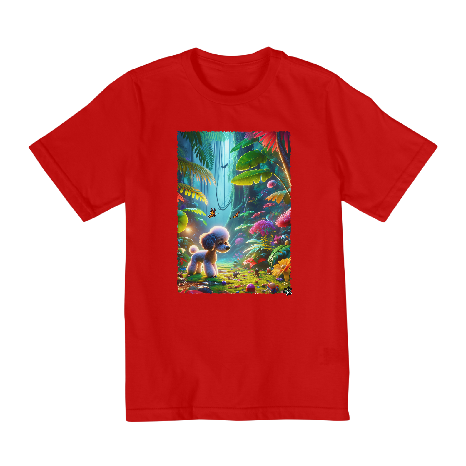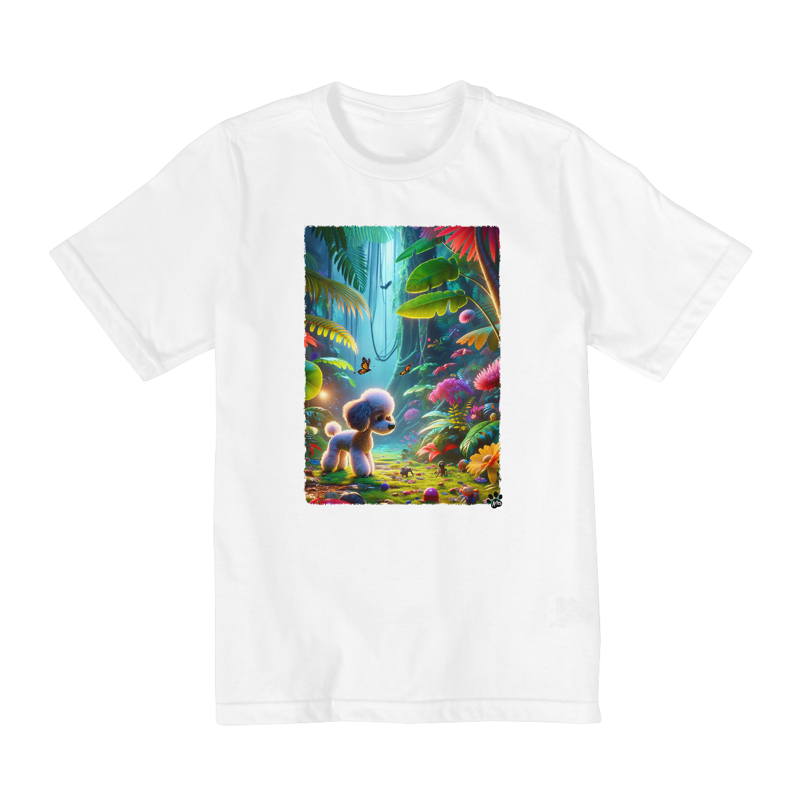 Poodle Toy explorando uma selva vibrante, cheia de folhas, flores e pequenos brinquedos. A cena captura lindamente a curiosidade do cachorro e uma sensação de encantamento dentro do ambiente colorido e estilizado da selva. Linda e fofa aventura.