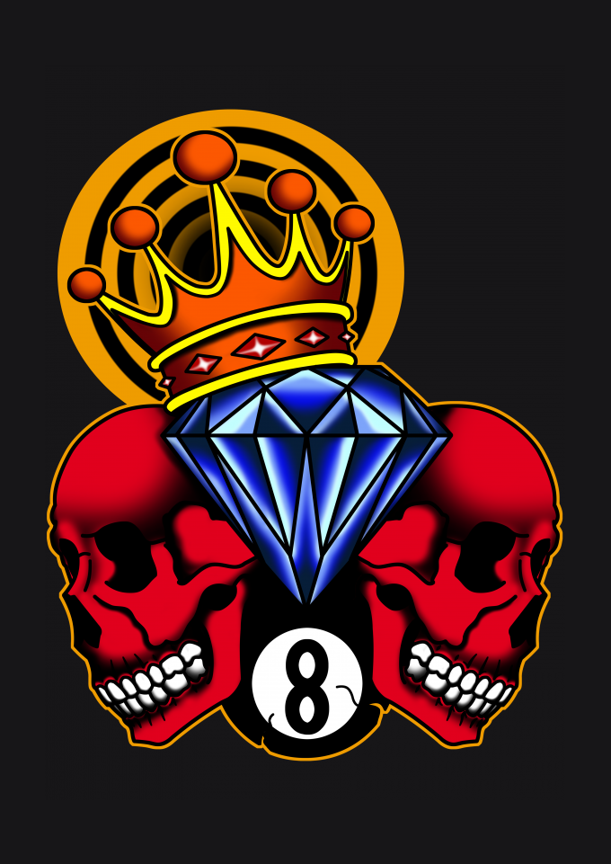 camiseta preta, caveira, diamante, bola oito, jogo, coroa, alvo, tatuagem, rock n roll, heavy metal, colorido