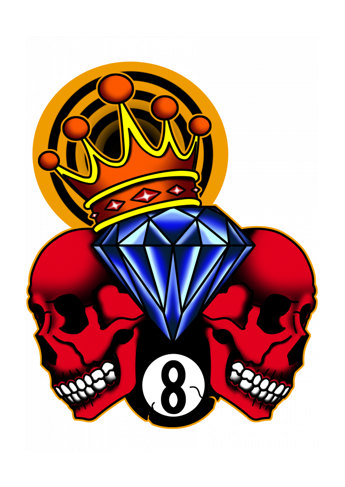 camiseta preta, caveira, diamante, bola oito, jogo, coroa, alvo, tatuagem, rock n roll, heavy metal, colorido